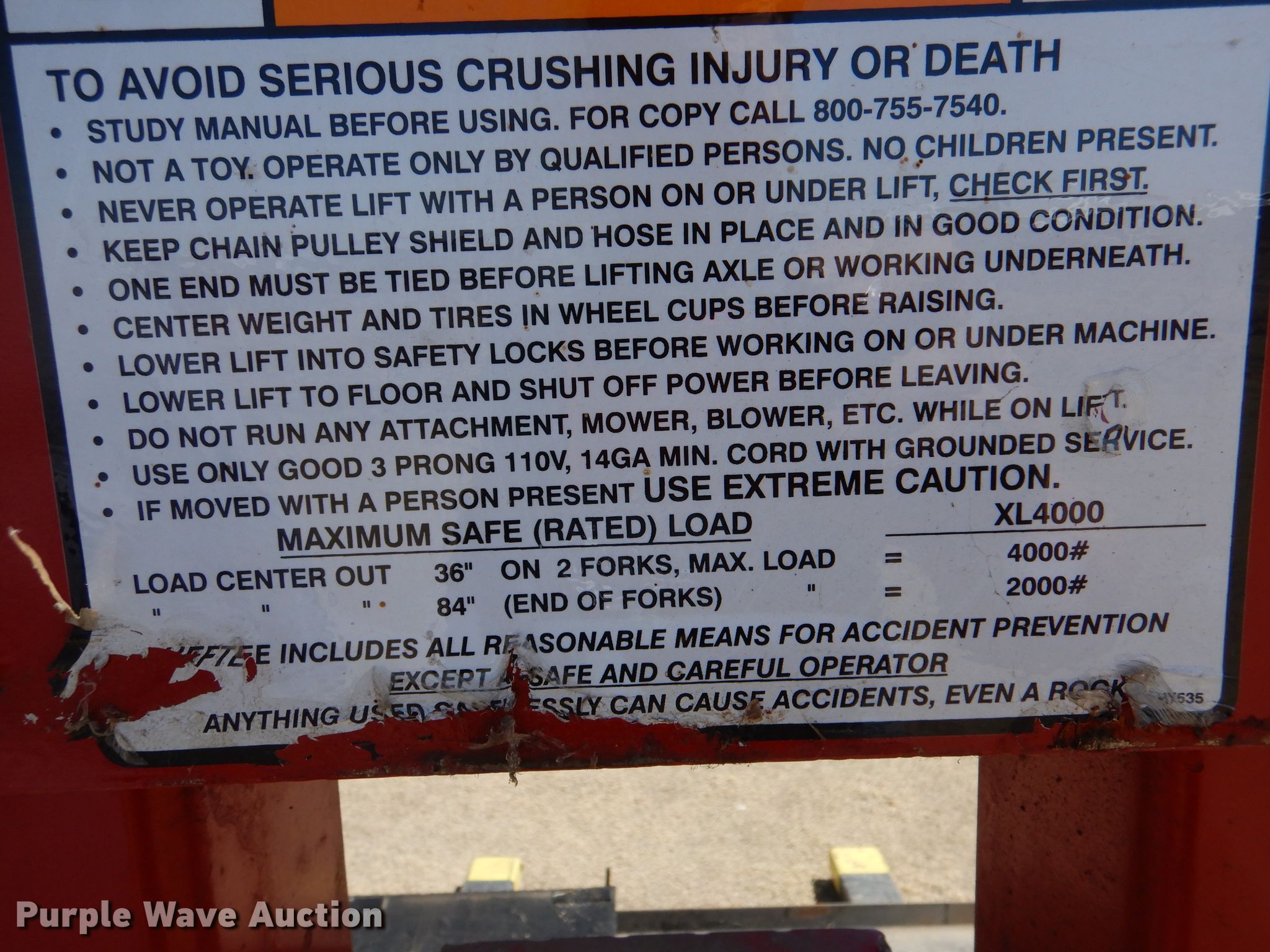 Purple Wave is selling a used Tools in Kansas. This item is a Heftee 4000 lift with the following: Approx. 9'L x 86"W x 98"H, 110V, 84"L forks, 4,000 lbs maximum lift capacity, Serial: 69676