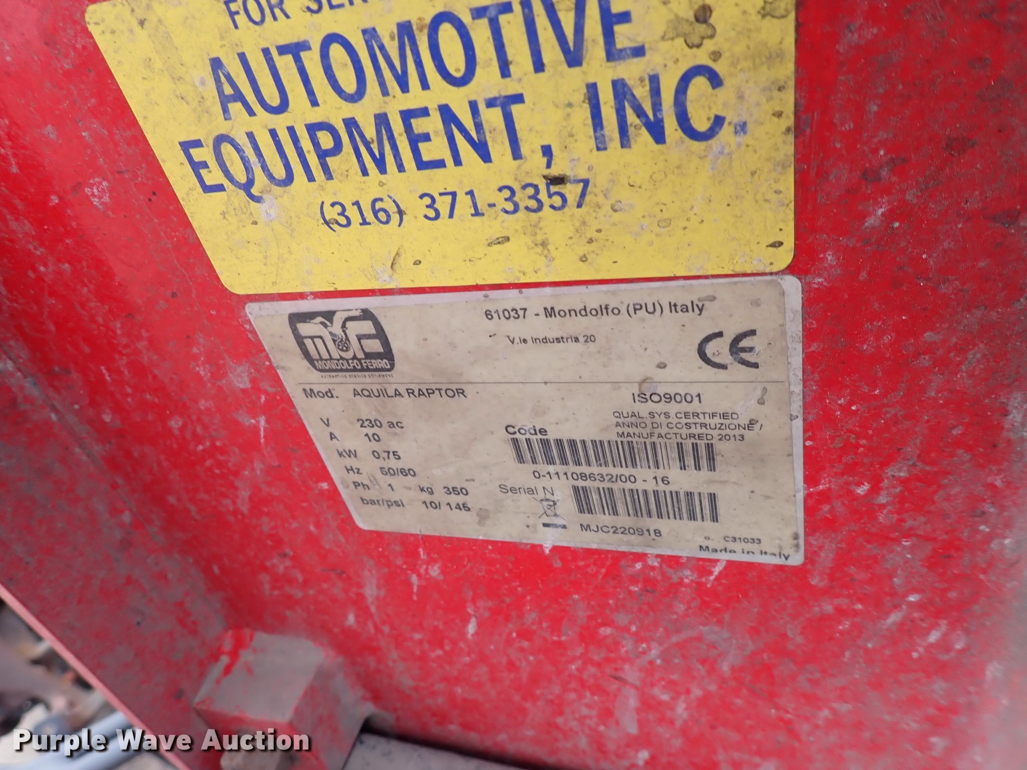 Purple Wave is selling a used Tools in Kansas. This item is a Mondolfo Ferro Raptor tire machine with the following: 230V, Single phase