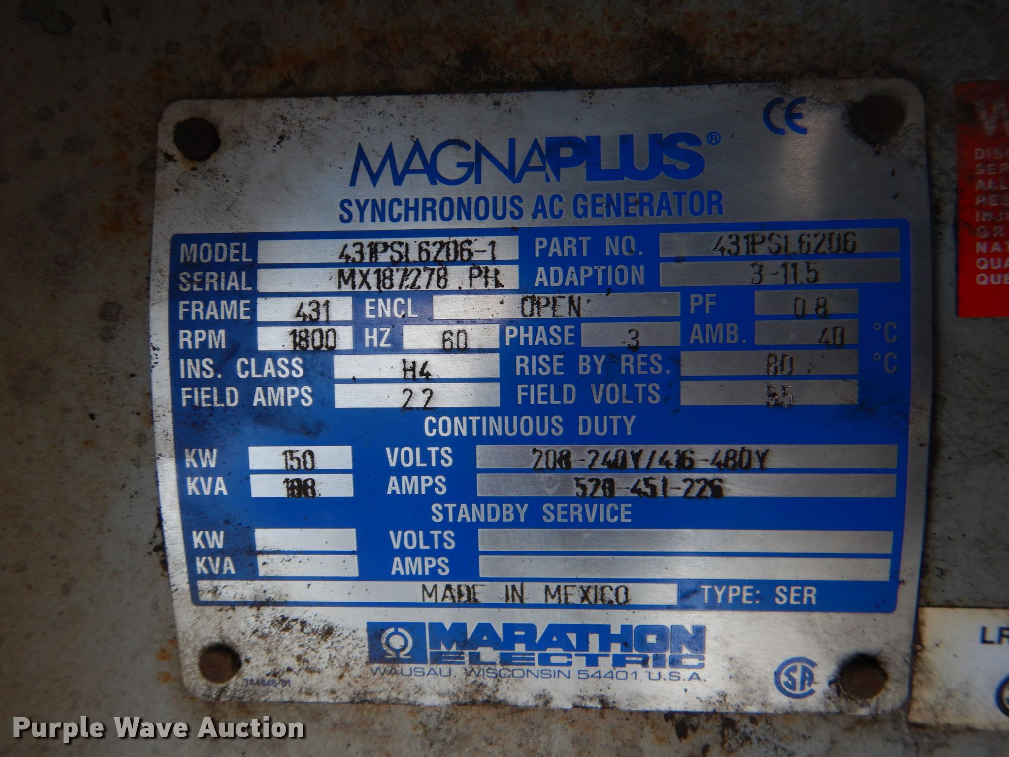 Warren Power Systems 150 generator. Hours: 8,477 on meter, Serial: C13-02-06842. Engine Perkins 3728/1800, Serial: BL51605U000482W, Cylinders: 6, Fuel type: Diesel. Features Generator MagnaPlus 431PSL6206-1, kVA: 188, kW: 150, Phase: Single, Three, Electric start, Trailer mounted. Trailer 2013 Maxey, VIN: 5R8CH1220DM026177, 16' L x 80" W, Ball hitch size: 2", Suspension: Spring, Brakes: Electric, Axles: Tandem, Tire size: ST235/80R16, GVWR: 14,000 lbs. Notes Engine will turn over but not start, Unknown operating condition. Transfer of ownership documentation will be a bill of sale. BNB Industries. Wynnewood, OK 73098