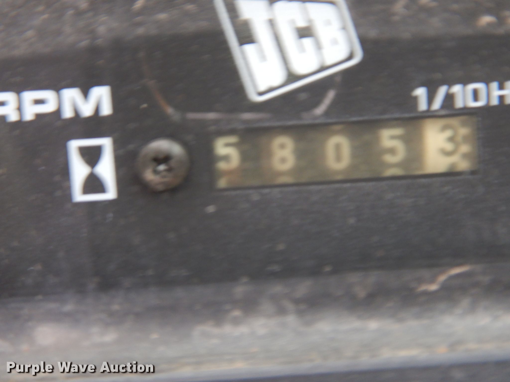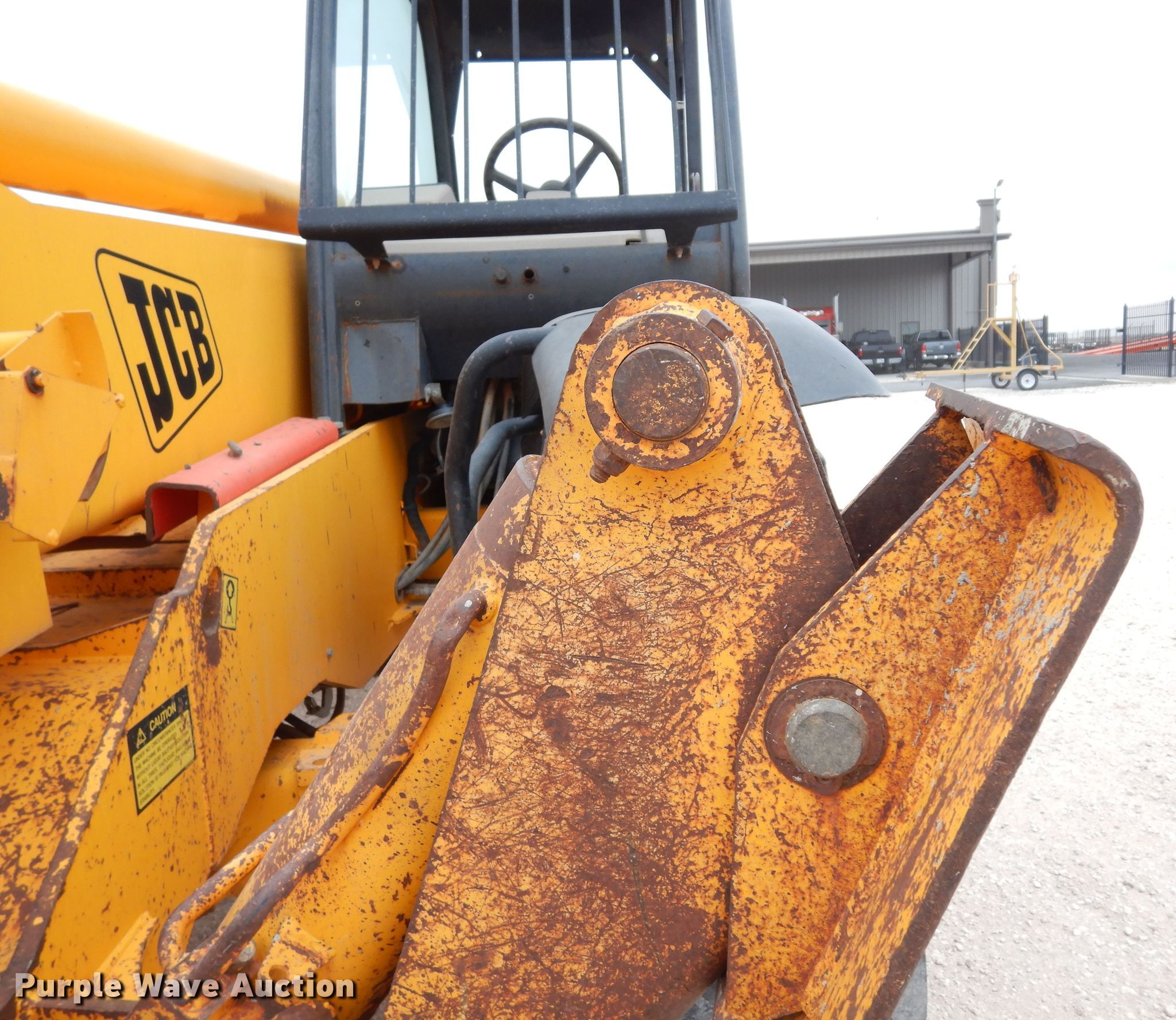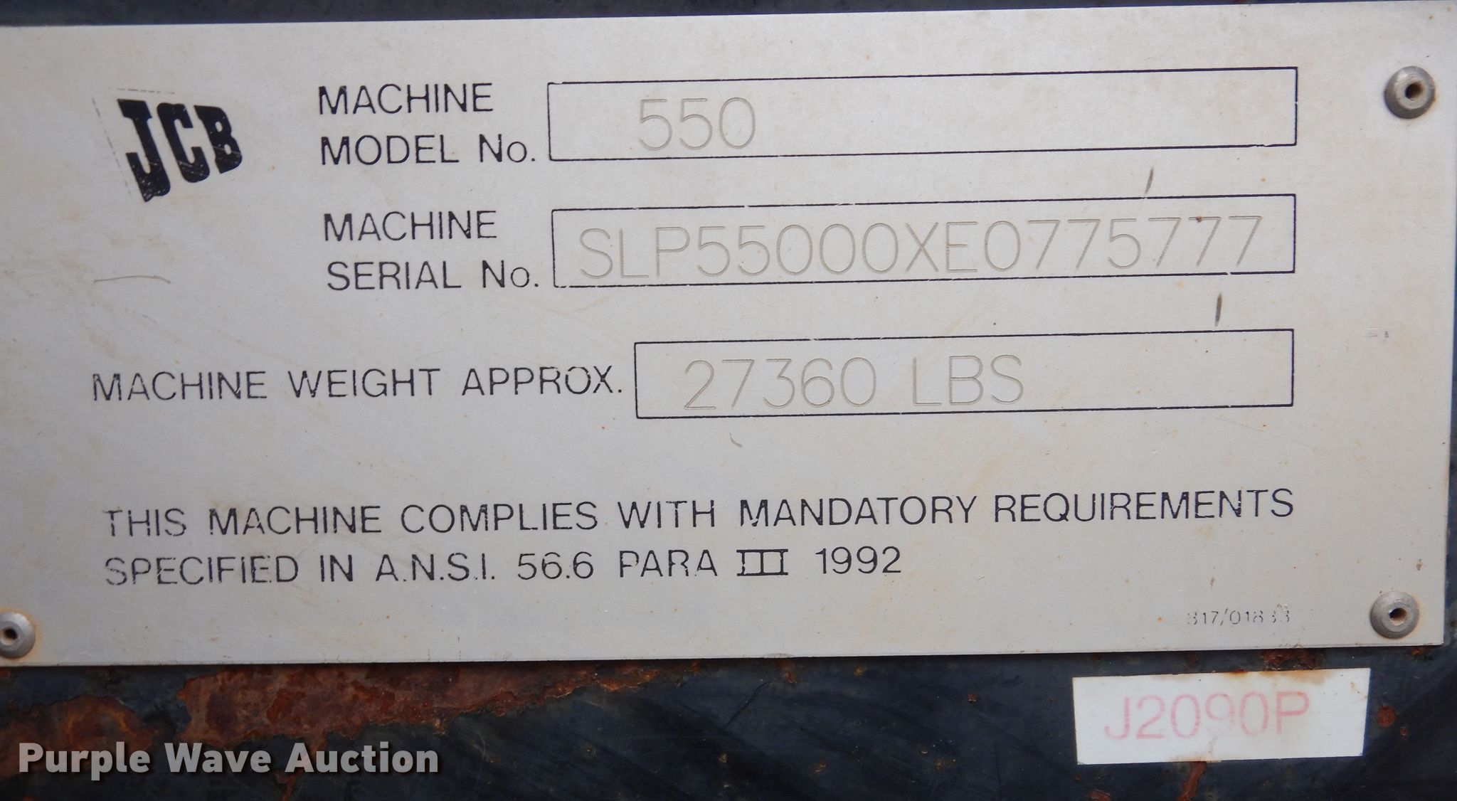 1999 JCB 550 telehandler. Hours: 5,805 on meter, Serial: SLP55000XE0775777. Engine JCB, Cylinders: 4, Fuel type: Diesel. Transmission Powershift, 4F - 4R, Four wheel drive. Operators station OROPS, Steering: Crab, Four wheel. Features Boom stages: 3, Fork length: 48", Bucket JCB, Width: 96", Hydraulic outriggers, Quick attach: Manual, Bucket size: 96". Tires Size: 17.5-25. 587 US HWY 180W. Seminole, TX 79360