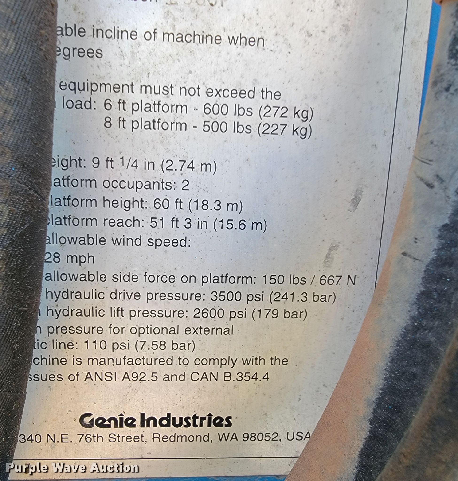 2000 Genie S60 boom lift. Hours: 4,701 on meter, Serial: S60-5914. Engine Ford, Cylinders: 4, Fuel type: Gas. Features Rough terrain, Maximum lift capacity: 600 lbs, Maximum reach length: 51', Maximum lift height: 60', Platform: 70" L x 28" W, Controls: Platform, Ground, Platform rotation: Hydraulic, Safety alarm. Tires Tire size: 15-19.5. 6415 Hwy 282 Link. Alma, AR 72921