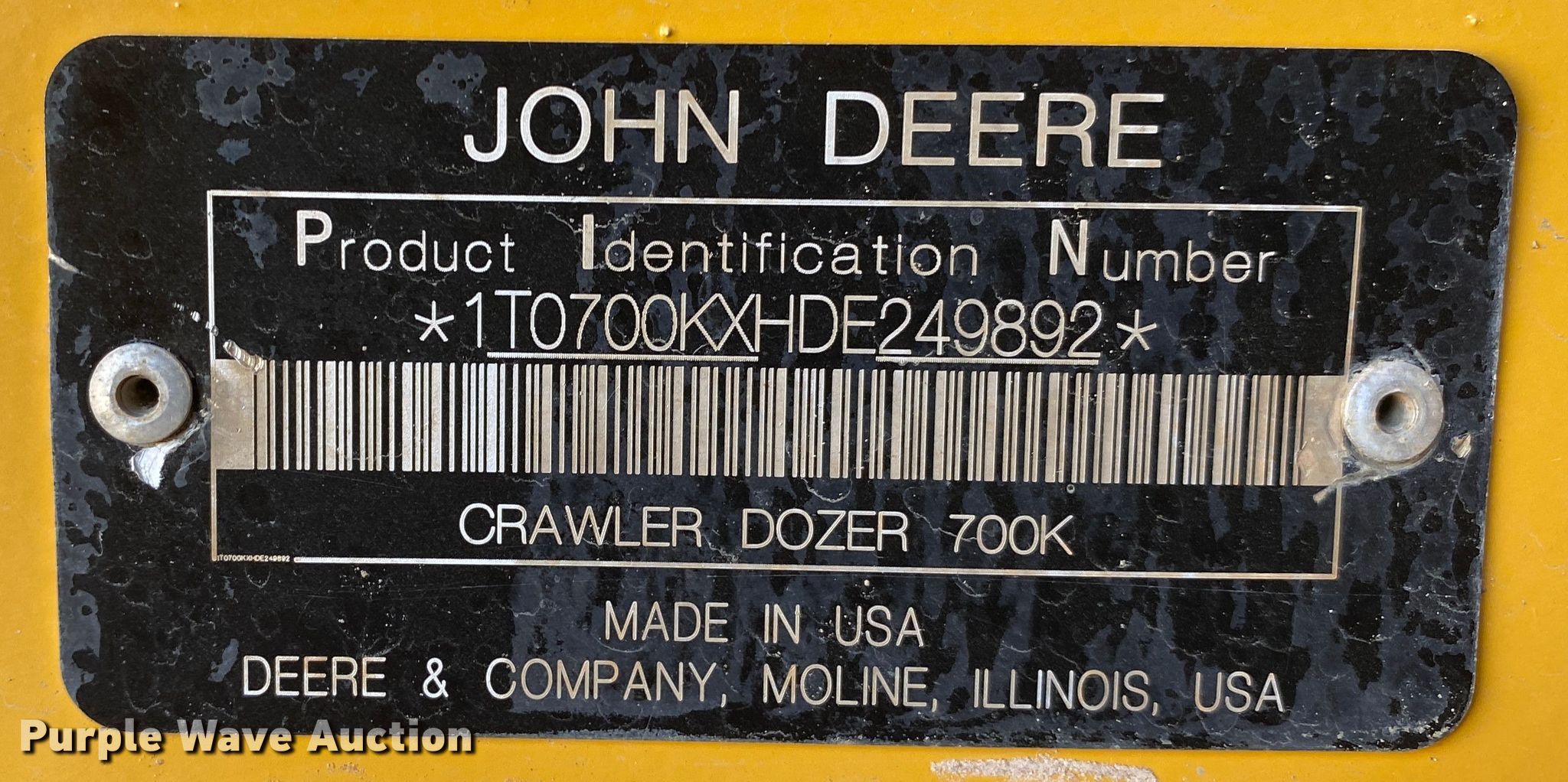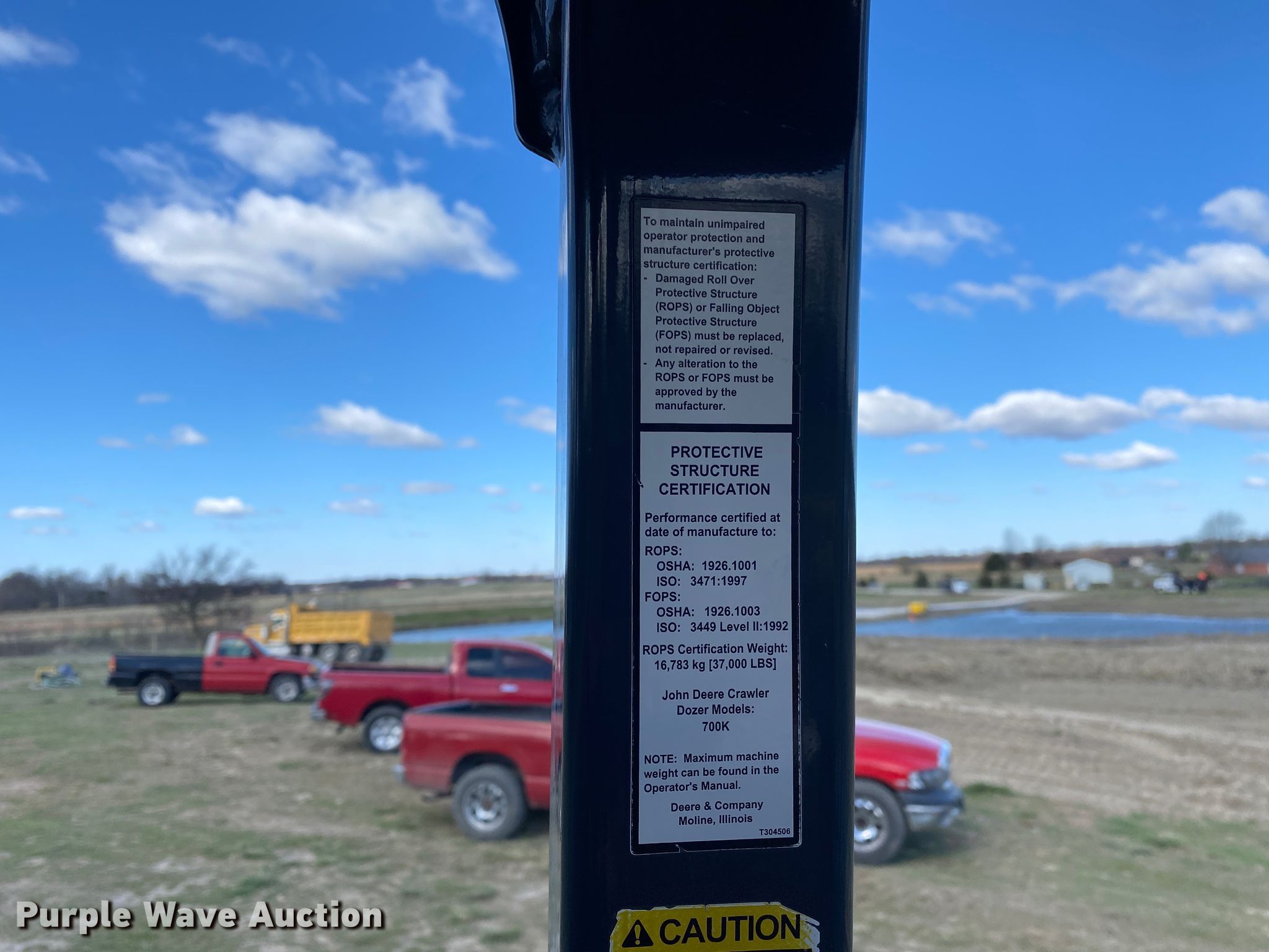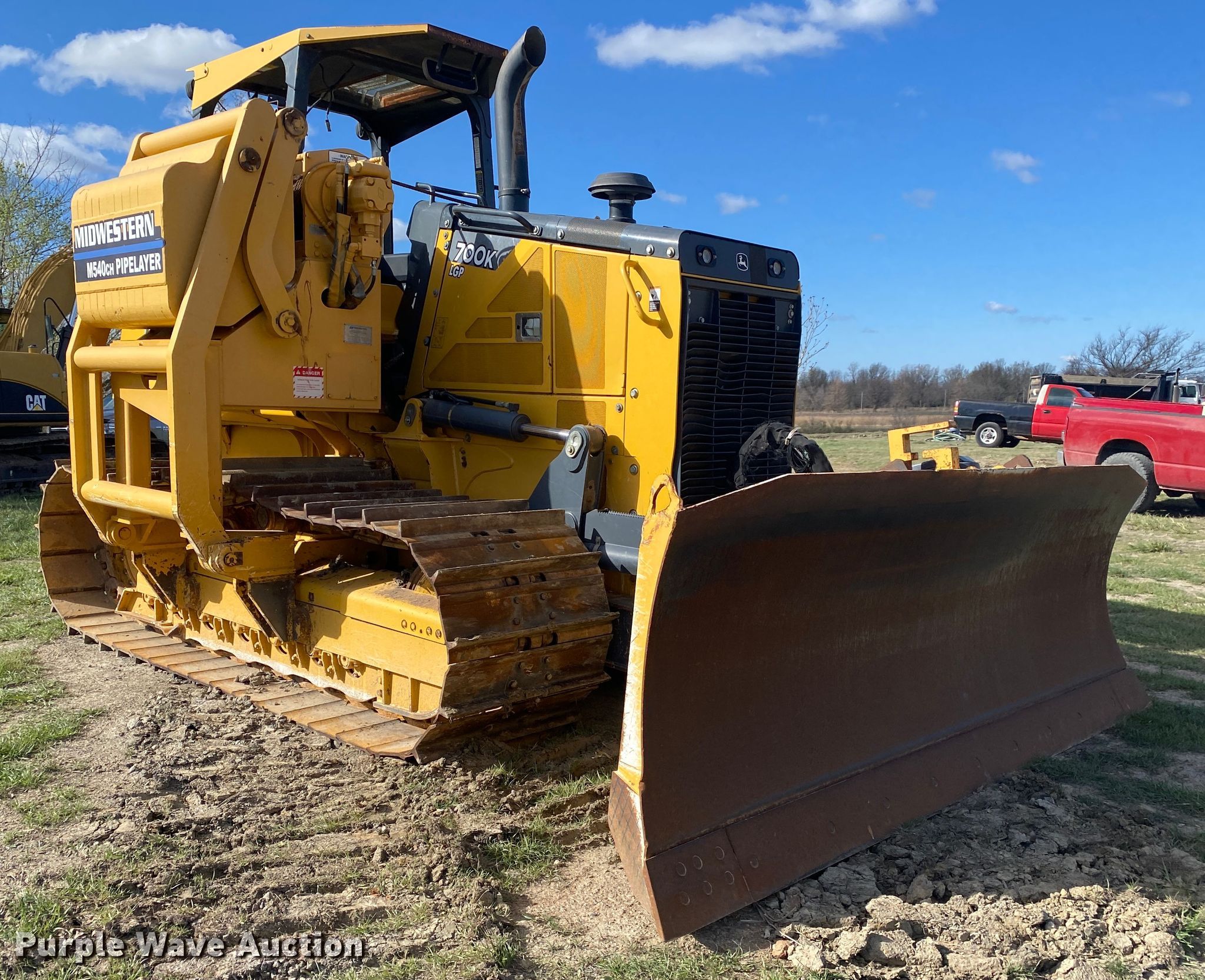 2013 John Deere 700K pipelayer. Hours: 3,654 on meter, Serial: 1T0700KXHDE249892. Engine John Deere, Displacement: 6.8L, Cylinders: 6, Fuel type: Diesel. Transmission Hydrostatic. Operators station OROPS, Canopy, Steering: Joystick. Features Rear drawbar, Dozer blade Type: 6-way, Straight, Width: 10' 6" W, Attachments Pipelayer Midwestern M540.. Tracks Width: 30", Grouser pads: Single. 15600 N 145th E Ave. Collinsville, OK 74021