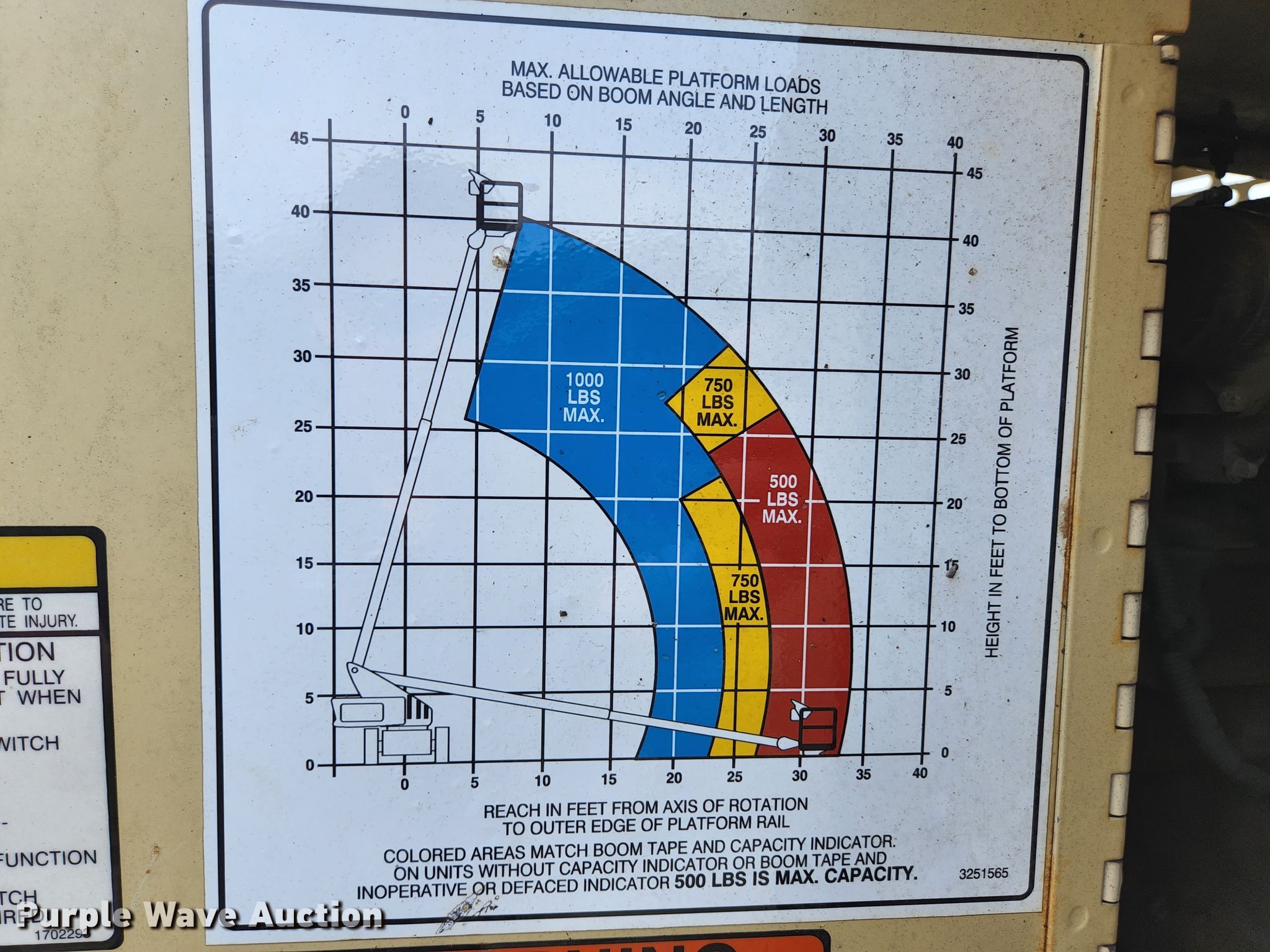 1998 JLG 40H boom lift. Hours: 5,251 on meter, Serial: 065700300035283. Engine Deutz, Cylinders: 3, Fuel type: Diesel. Chassis Four wheel drive. Features Maximum lift capacity: 1,000 lbs, Maximum reach length: 33', Maximum lift height: 40', Platform: 60" L x 36" W, AC power outlet, Controls: Platform, Ground, Platform rotation: Hydraulic. Tires Tire size: 12.5L-15. Jay Rice Contracting. Saint Clair, MO 63077