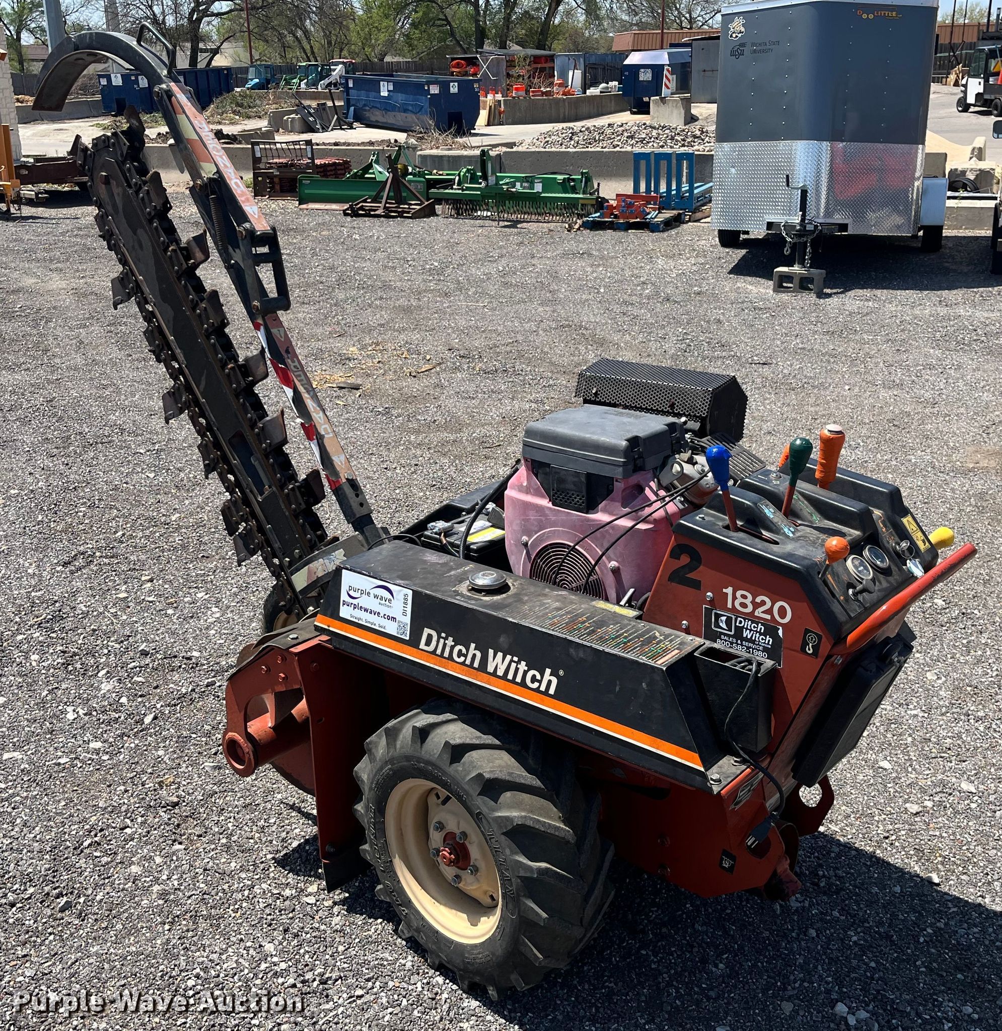 Ditch Witch 1820 trencher. Hours: 79 on meter. Serial: 1W1376. Engine Honda, Fuel type: Gas. Transmission Hydrostatic. Features Trencher Estimated dig depth: 48", Cutting width: 4", Teeth: Dirt, Manual crumber, Roto Bore system. Tires Rear: 23x8.50-12. Wichita State University Physical Plant. Wichita, KS 67204
