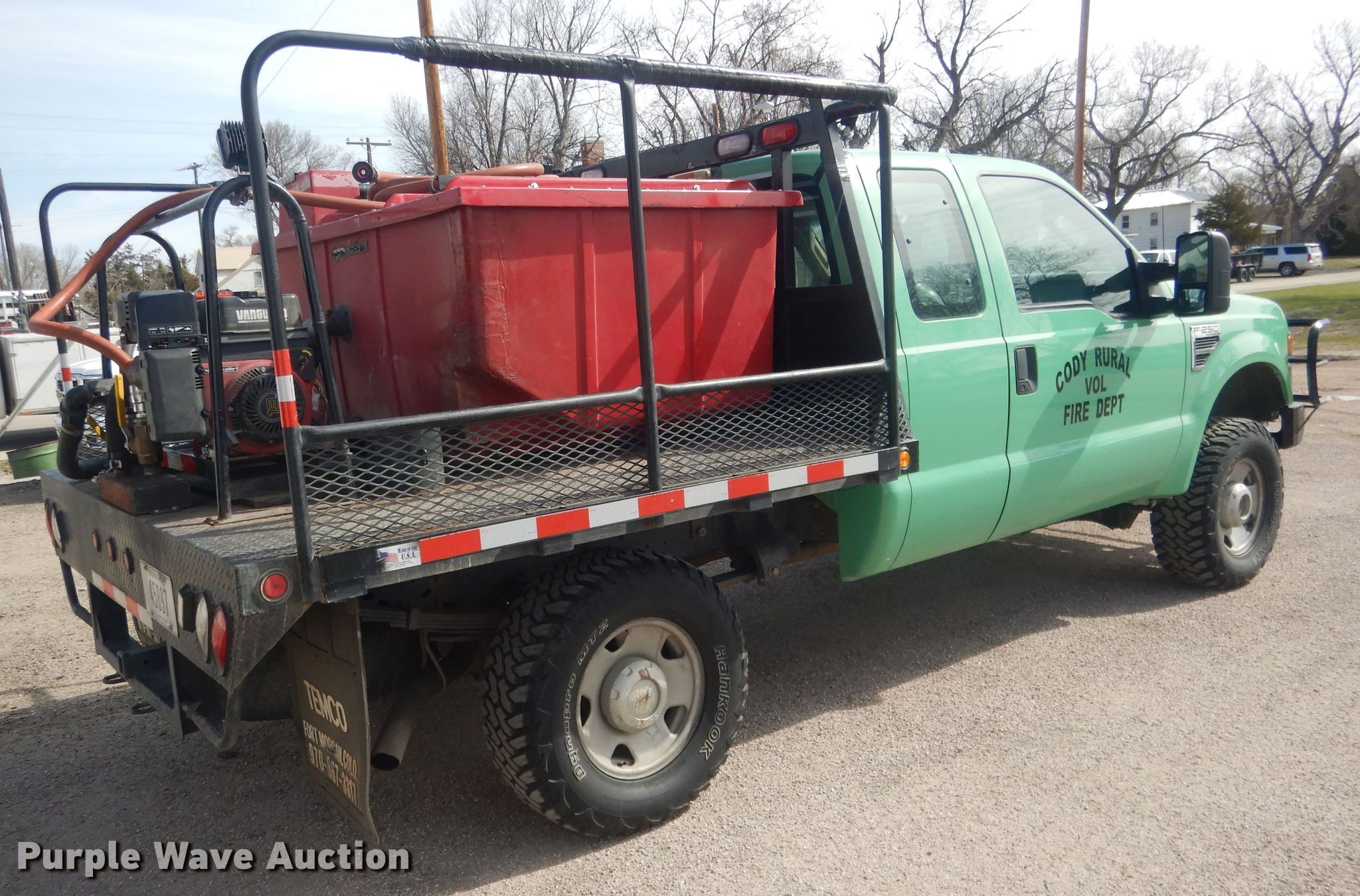 2008 Ford F250 Super Duty XL SuperCab brush fire truck. Miles: 119,548 on odometer, VIN: 1FTSX21Y48EA17161. Engine Displacement: 6.8L V10 SOHC 30V, Cylinders: 10, Fuel type: Gas. Transmission Manual, Speed: 6. Chassis Four wheel drive, Axles: Single, Suspension: Spring, Brakes: Hydraulic, GVWR: 9,400 lbs. Interior AC, Heat, Cruise control. Features Brush fire skid unit Briggs & Stratton 245437 gas engine 13 HP, Tank Capacity: 300 gallons, Pump Davey 5213BE/NPT-1, Serial 11278171353, Approx. 50' x 1" diameter hose, Approx. 20' x 1/2" diameter hose. Tires Size: LT285/70R17. Notes Air bag helper springs, Windshield chipped or cracked. Nebraska title. Cody Rural Fire District. 35878 Boiling Springs Rd. Cody, NE 69211