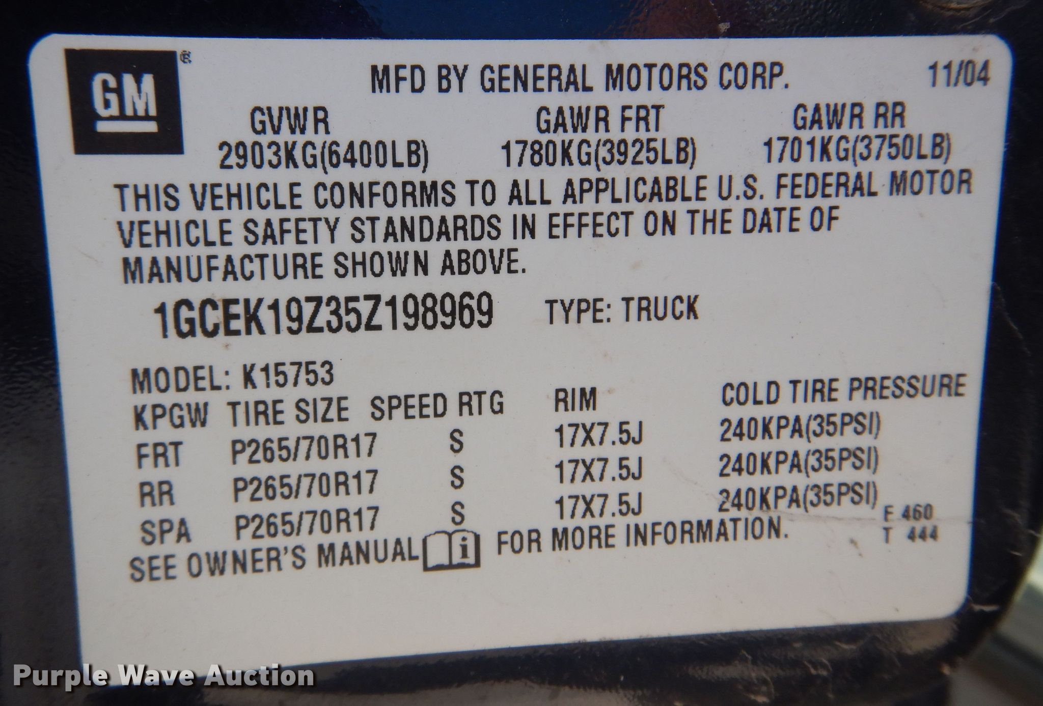 2005 Chevrolet Silverado 1500 Ext. Cab pickup truck. Miles: 197,280 on odometer, VIN: 1GCEK19Z35Z198969. Engine Displacement: 5.3L V8 OHV 16V, Cylinders: 8, Fuel type: Gas. Transmission Automatic, Four wheel drive. Interior AC, Heat, Power windows, Power locks, Cruise control. Tires Front: 265/70R17, Rear: 265/75R17. Notes Dash warning indicator: Check engine. Kansas title. Morris County Highway Dept. Council Grove, KS 66846