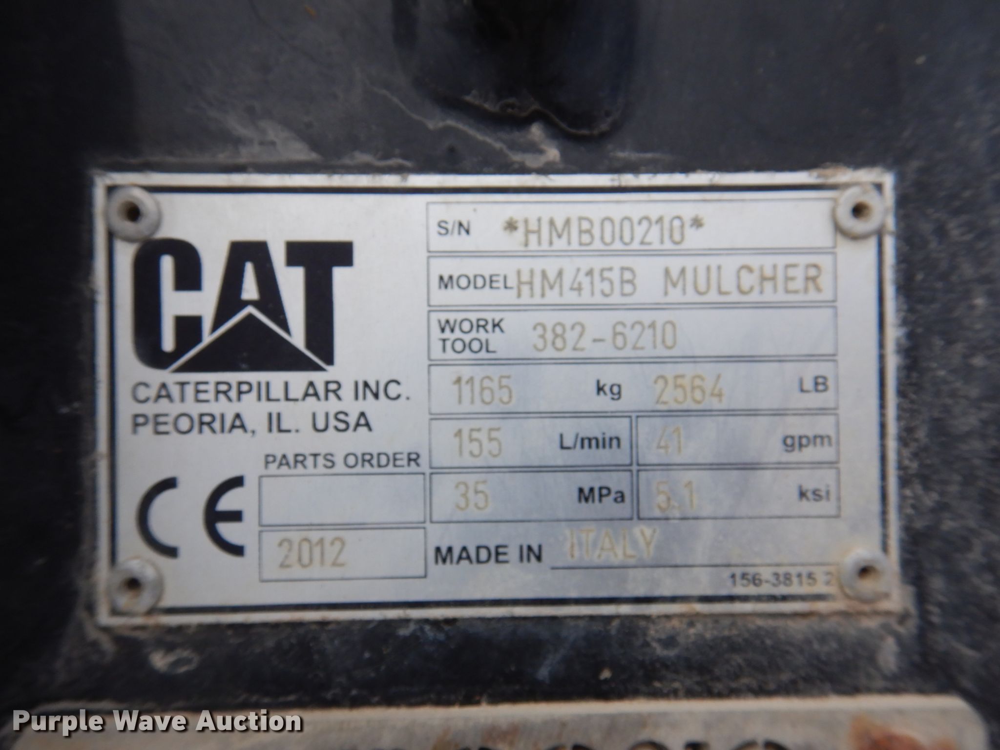 Purple Wave is selling a used Skid Steer Attach. in Iowa. This item is a 2012 Caterpillar HMB415B skid steer mulcher with the following: Non-operational hydraulic arm
