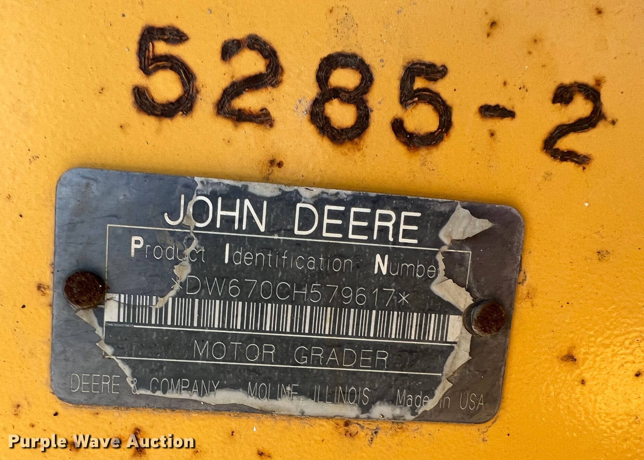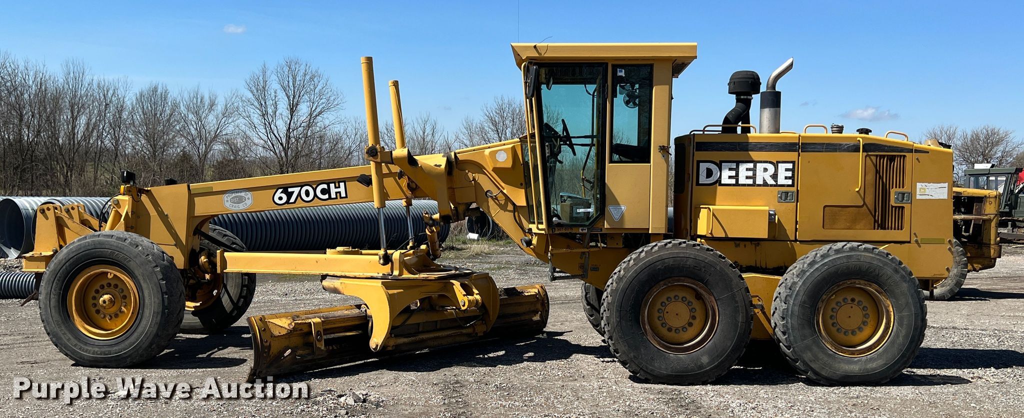 Purple Wave is selling a used Motor Grader in Oklahoma. This item is a 2001 John Deere 670CH motor grader with the following: Hours: 15,301 on meter, Serial: DW670CH579617