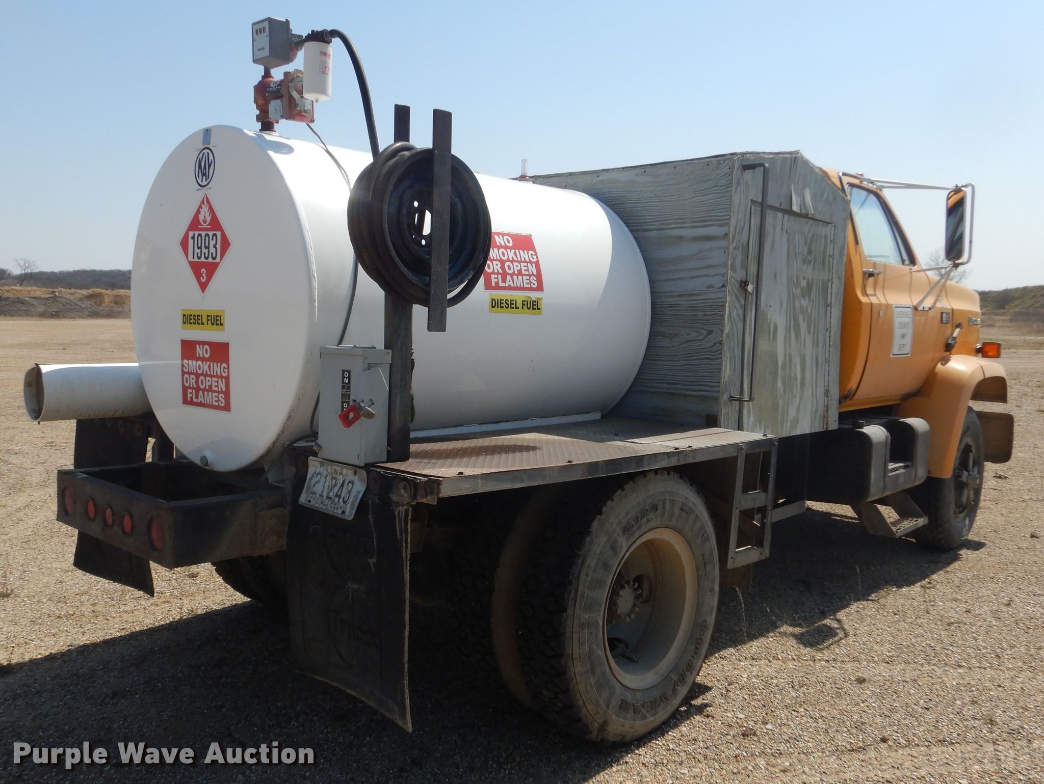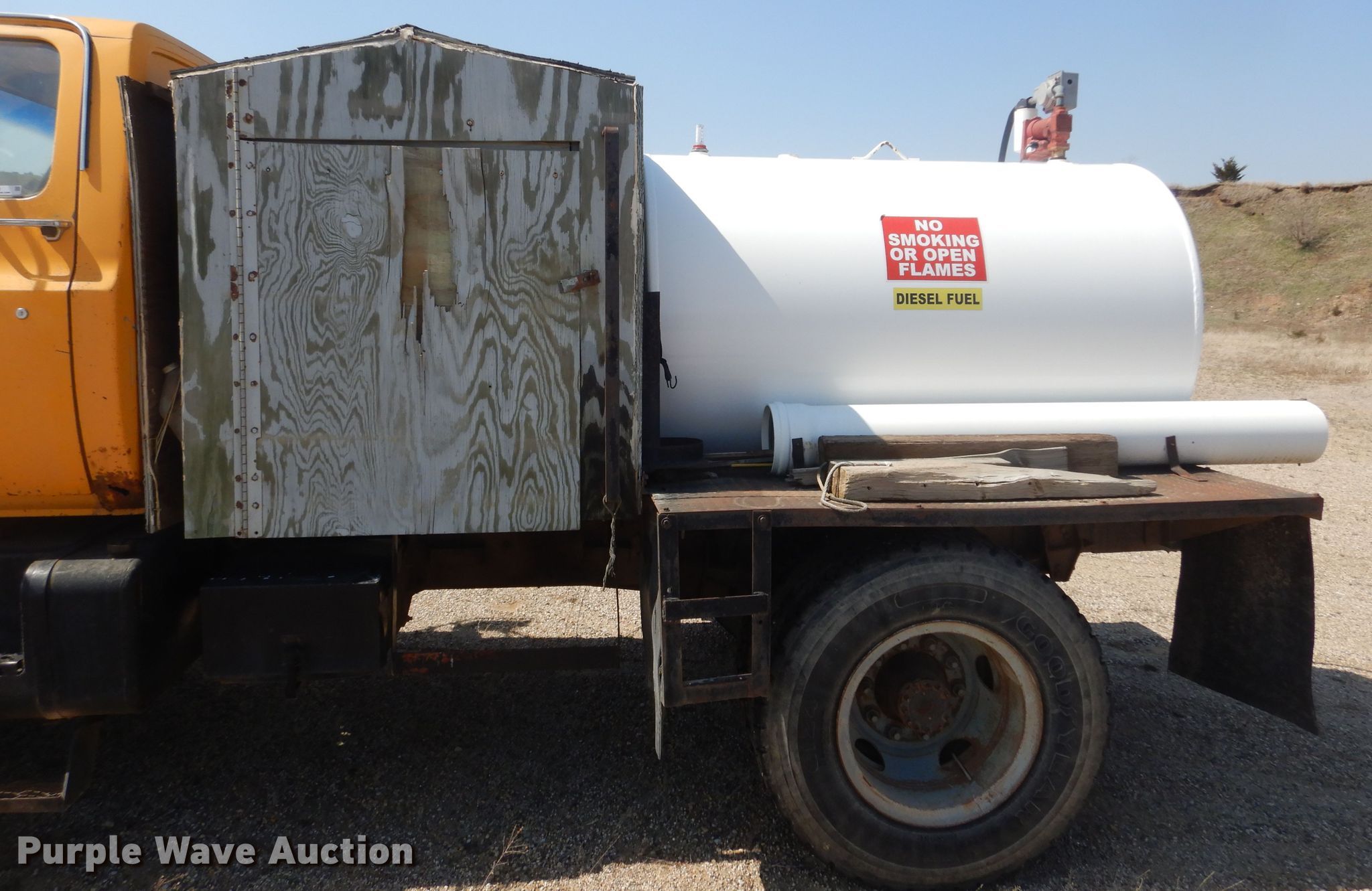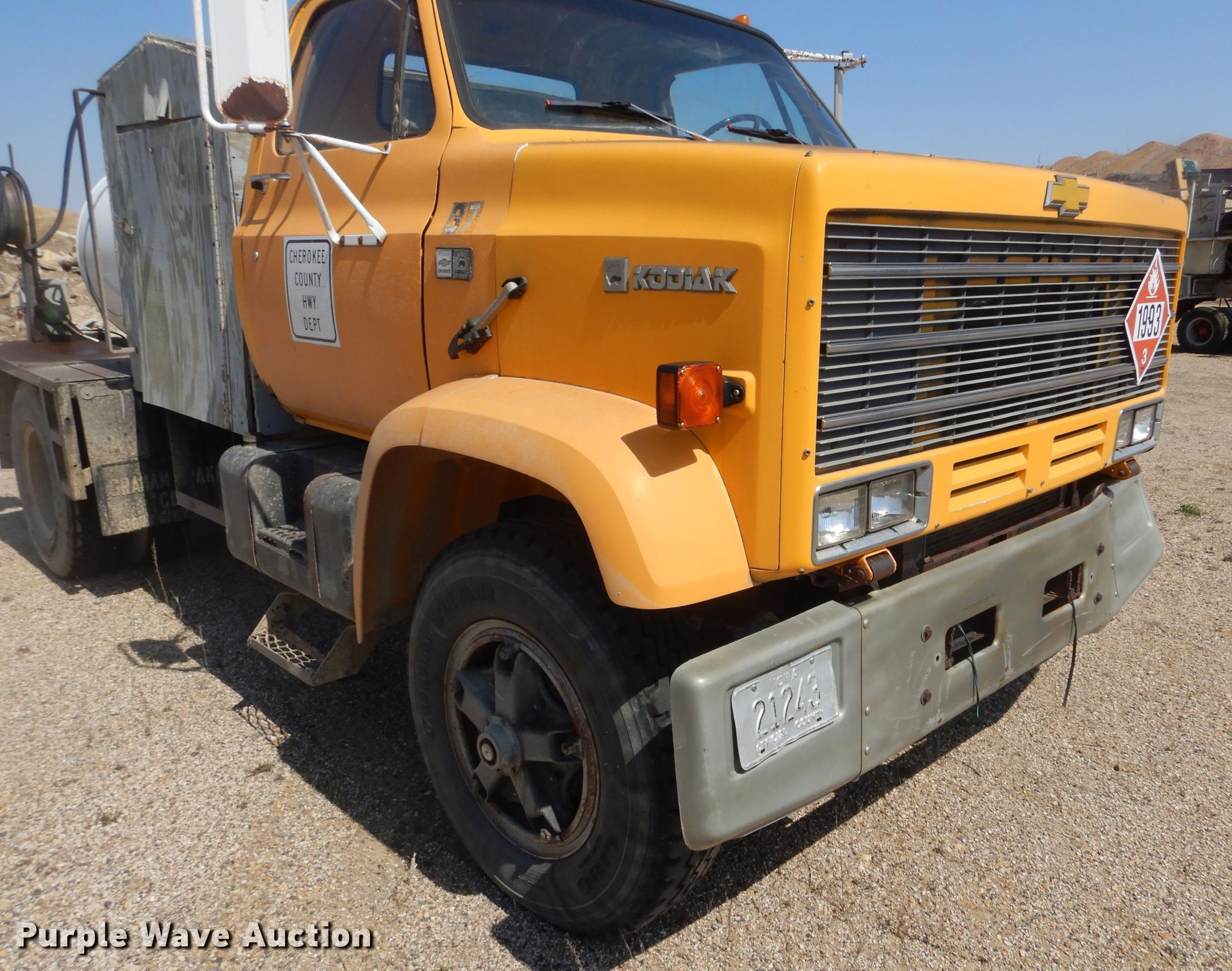 1981 Chevrolet Kodiak flatbed truck. Miles: 99,608 on odometer, VIN: 1GBL7D1Y9BV144144. Engine Caterpillar 3208, Displacement: 10.4L, Cylinders: 8, Fuel type: Diesel. Transmission Manual, Speed: 5, plus 2. Chassis Axles: Single, Suspension: Spring, Brakes: Hydraulic, Truck chassis: 10' 8", GVWR: 27,080 lbs FAWR: 9,000 lbs, RAWR: 18,080 lbs. Interior Heat. Features Deck plate: Steel, Auxiliary fuel tank Capacity: 560 gallon, Pump. Tires Size: 9.00R20. Notes Windshield chipped or cracked. Iowa title. Cherokee County. Cherokee, IA 51012