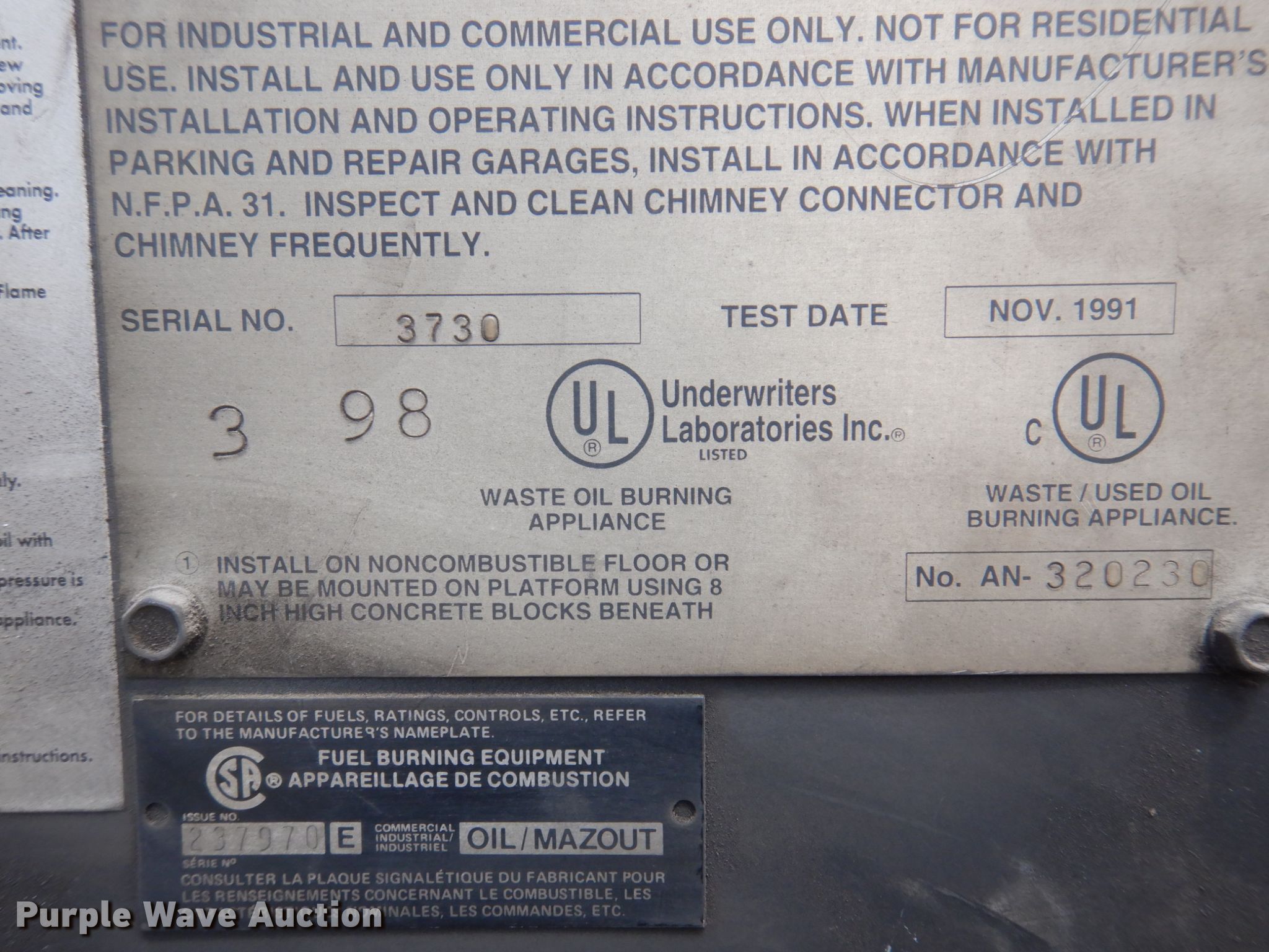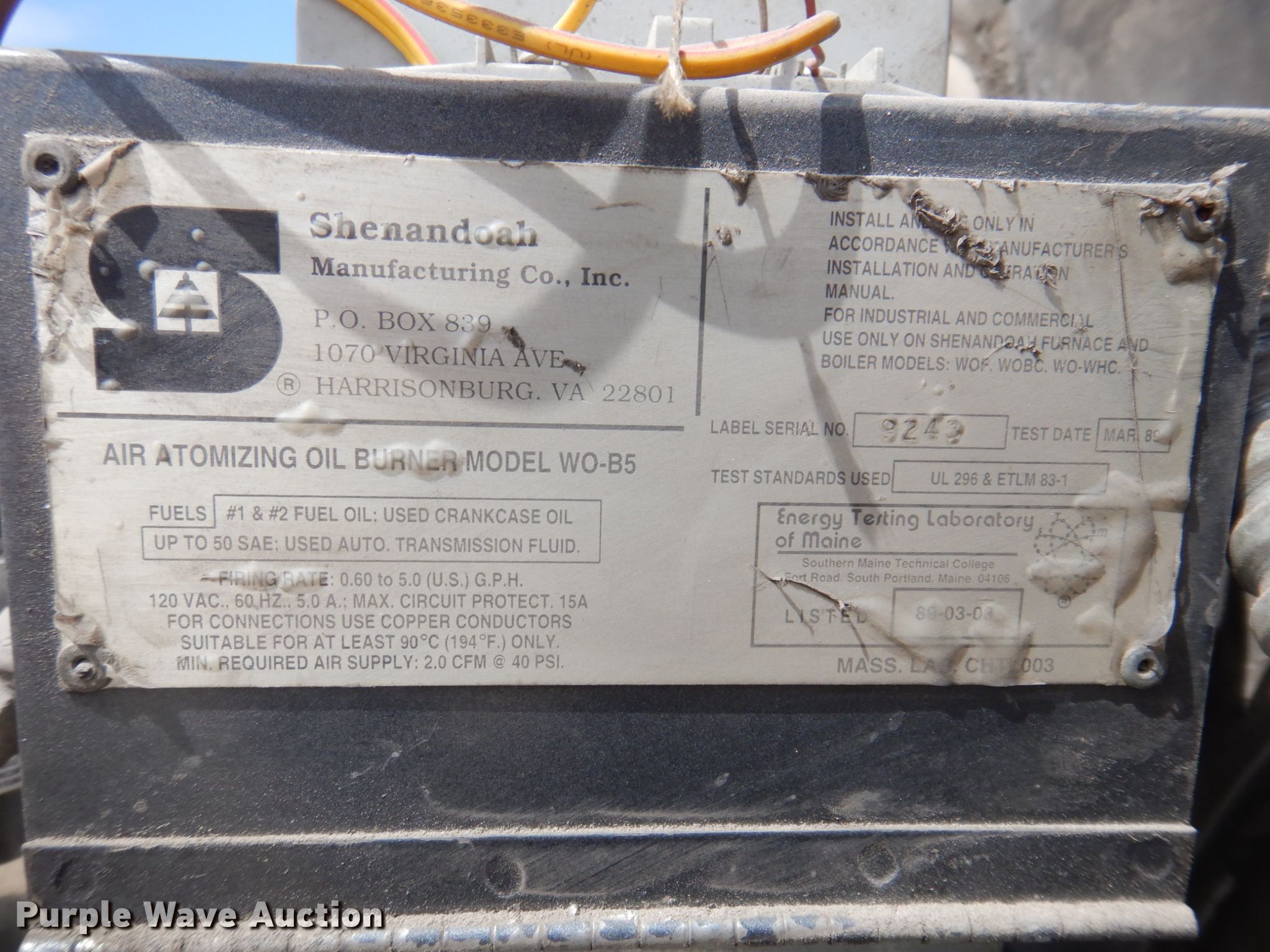 Purple Wave is selling a used Portable Heater or Fan in Iowa. This item is a Shenandoah 235 oil furnace with the following: Serial: 3730