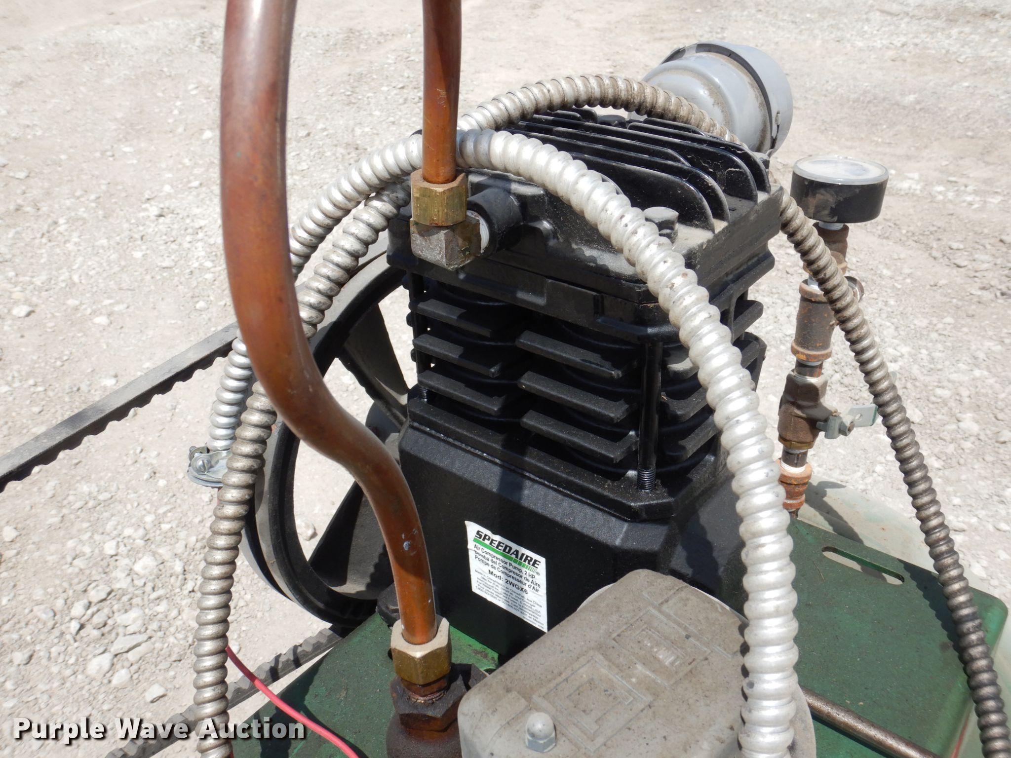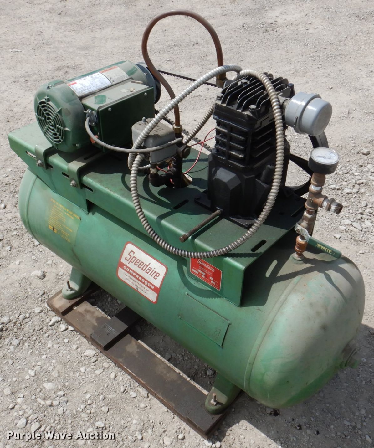 Purple Wave is selling a used Air Compressor in Iowa. This item is a 1969 Speedaire air compressor with the following: Dayton 1TMX5, HP: 1.5, Volts: 115/230, Phase: Single