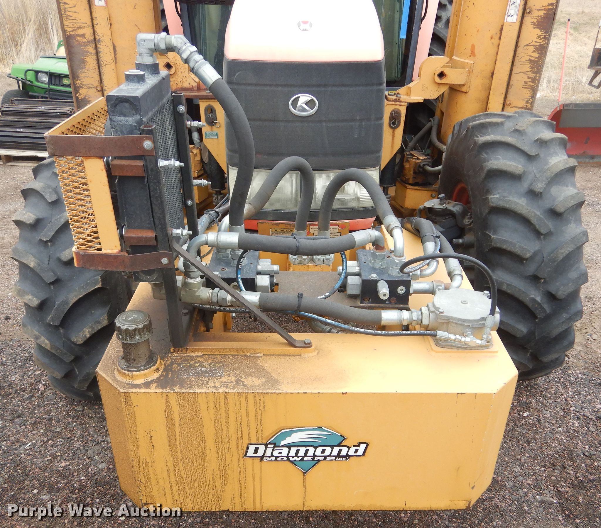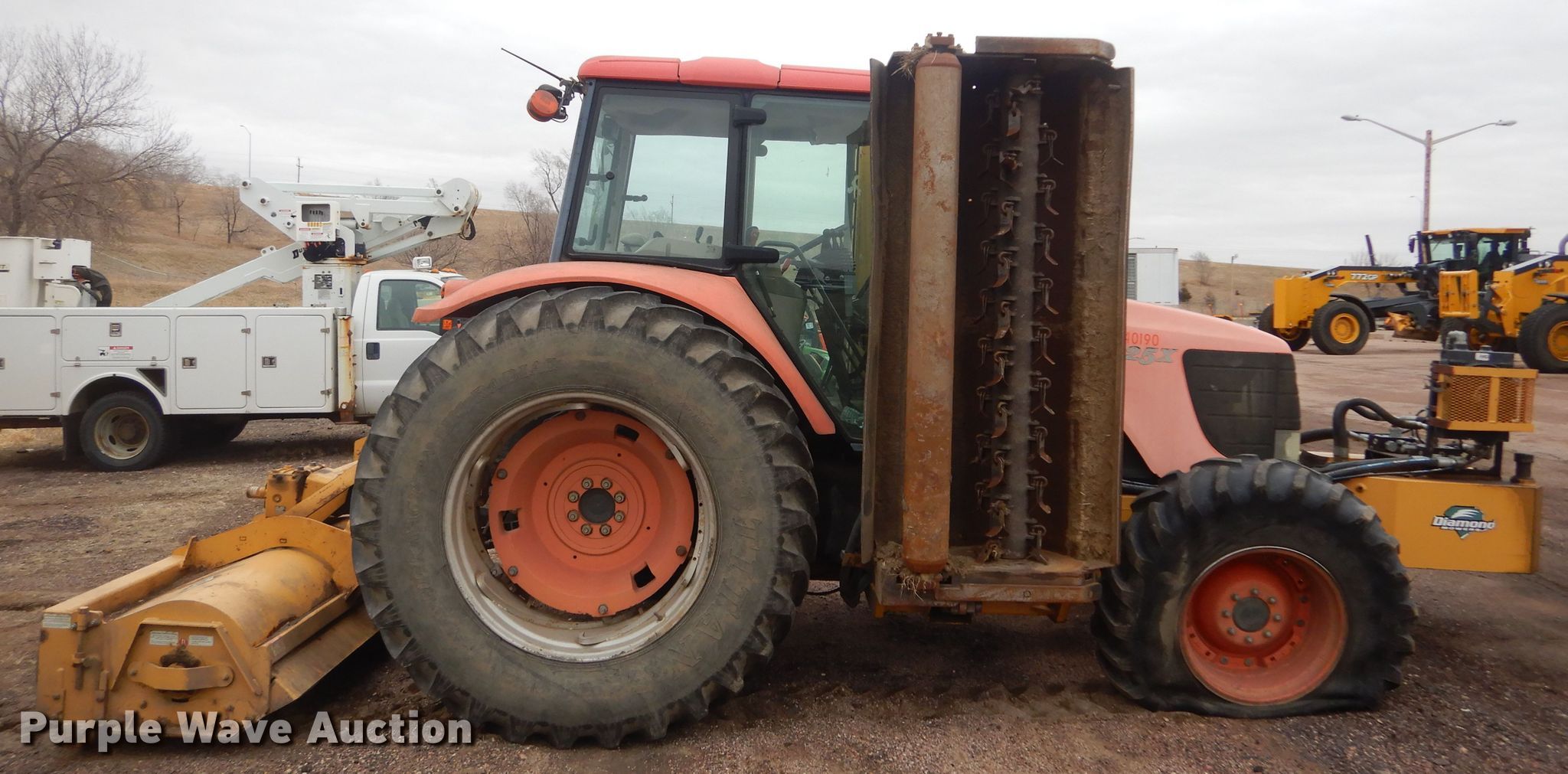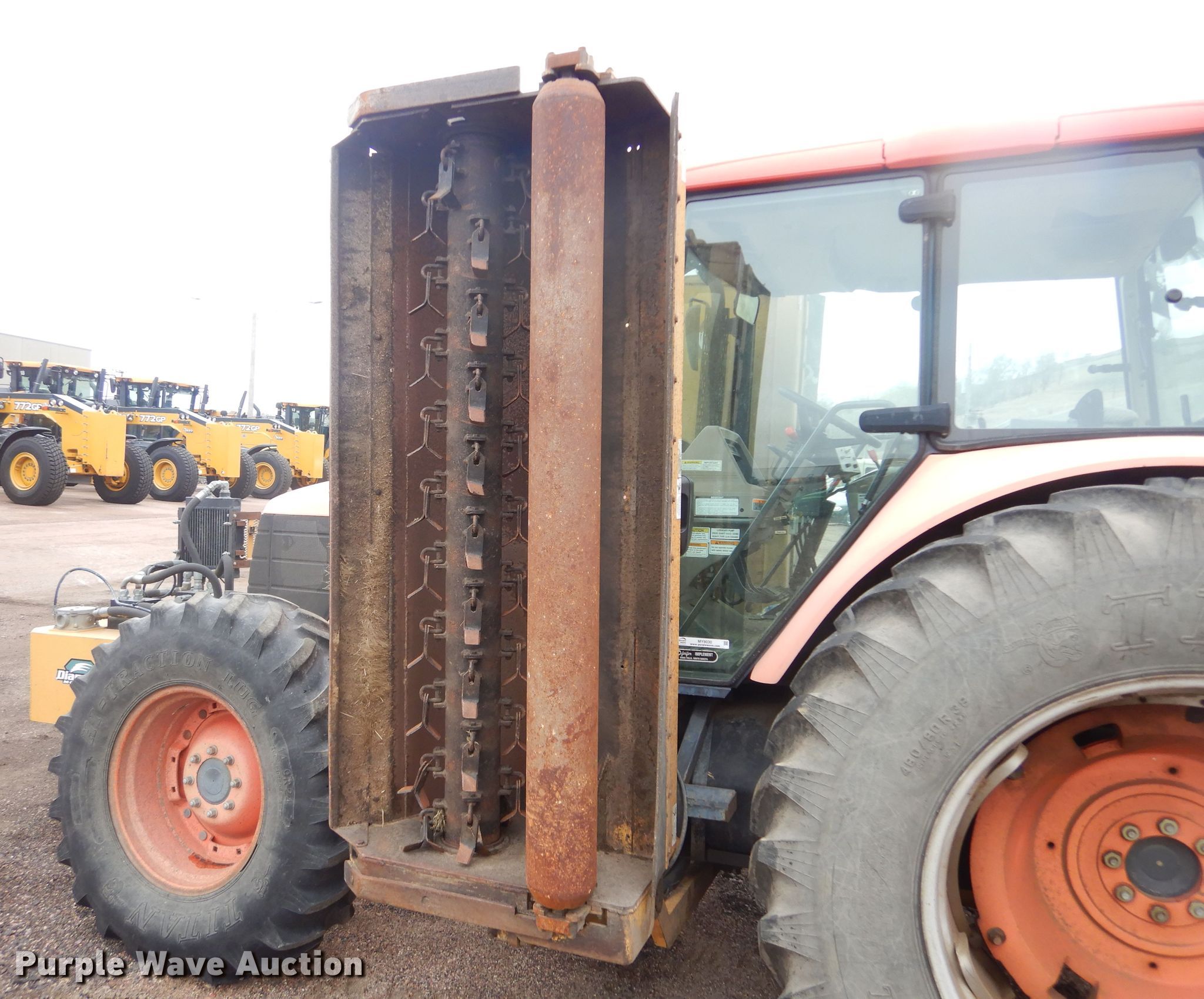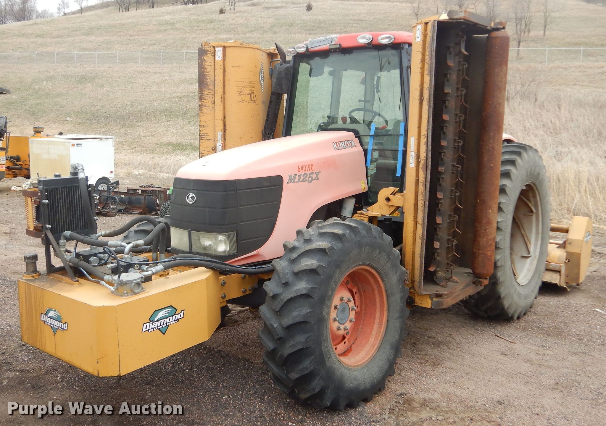 Kubota M125X MFWD tractor. Hours: 41,693 on meter, Serial: 54512, Unit #: 51-30. Engine Kubota, Displacement: 5.8L, Cylinders: 5, Fuel type: Diesel. Transmission Powershift, 16F - 16R, Left-hand reverser, Differential lock. Operators station AC, Heat. Features PTO: 540, Three point Top link, Seven pin outlet, Hydraulic remote sets Rear: 2, Diamond flail mower Width: 106", PTO: 540, Hitch: Three point, (2) Diamond side boom mowers Width: 83". Tires Front: 14.9R24, Rear: 480/80R38. Notes Glass cracked, Flat tire, Non-operational unit. Sioux Falls Street Department - Open inspection May 19. 1000 E Chambers St. Sioux Falls, SD 57104