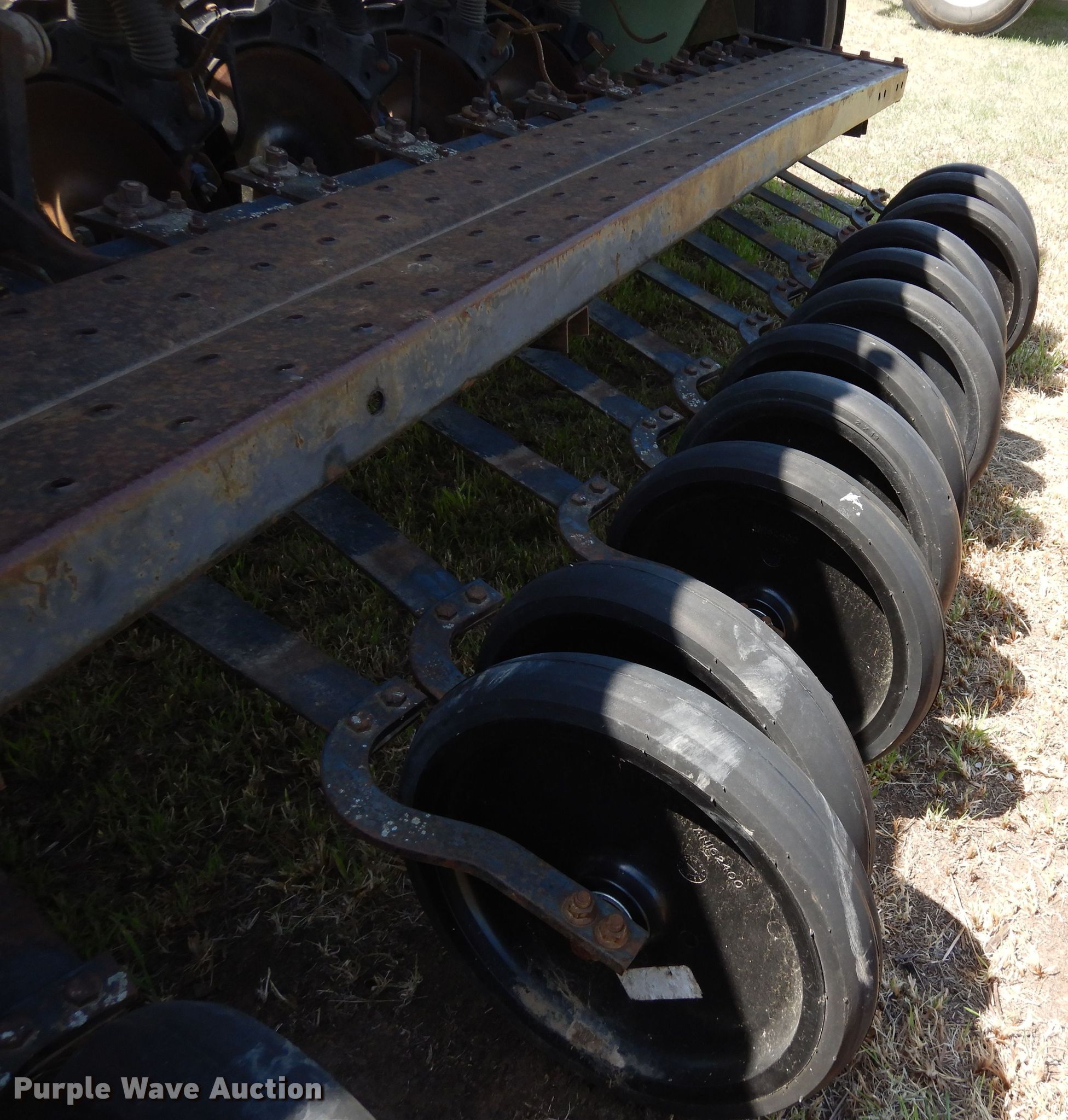 John Deere 8350 grain drill. Width: 12', Row units: 21, Row spacing: 6". Features Seed delivery Bulk fill system, Row units Meter drive: Ground, Down pressure: Spring, Disk openers: Double, Closing system: Single Type: Rubber.. Tires Transport tire size: 7.50-20 Quantity: 2. Noble Research Institute - Open inspection May 24. 2510 Sam Noble Pkwy. Ardmore, OK 73401
