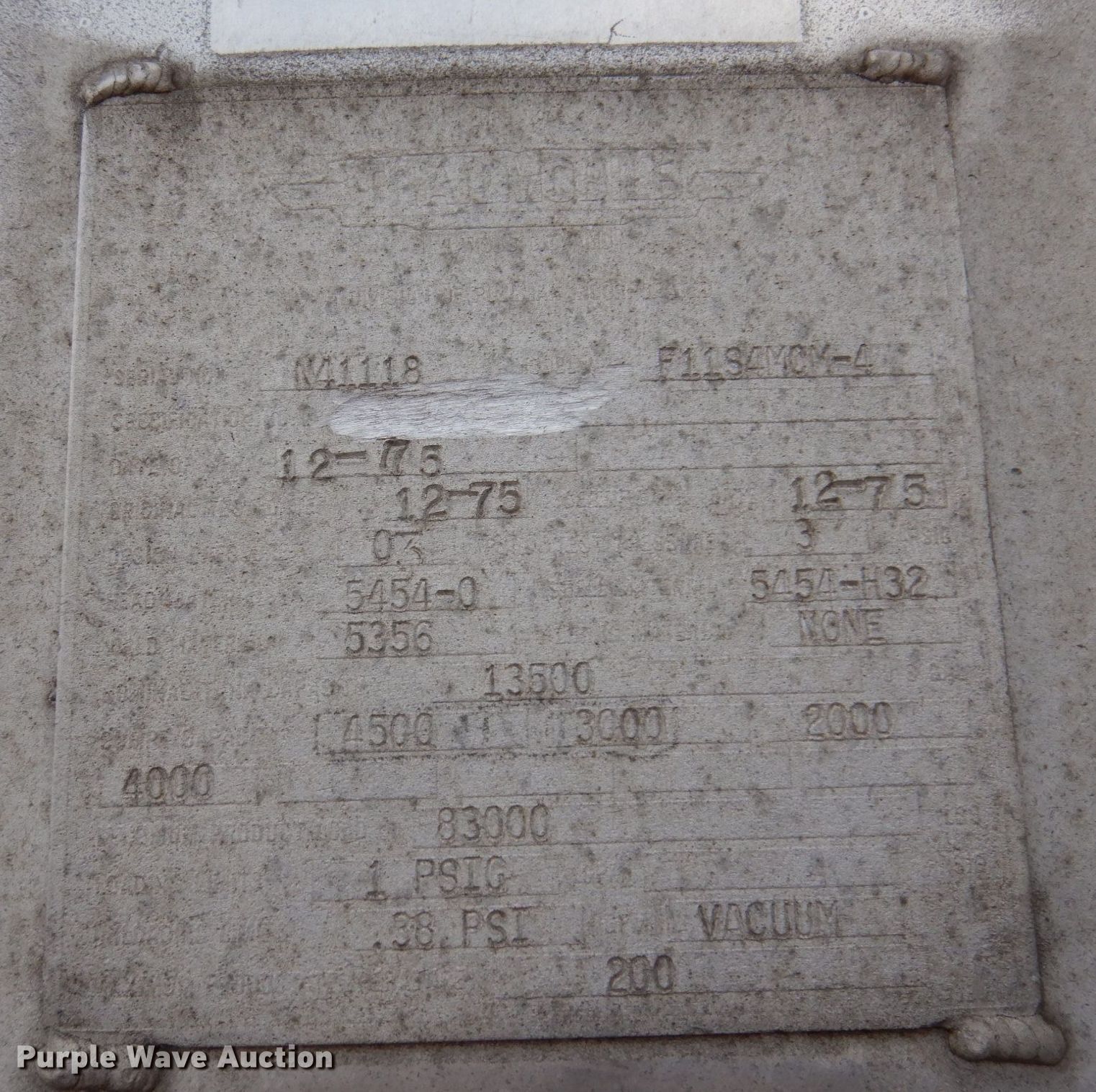 1976 Trailmobile F11S4MCM-4 tank trailer. VIN: N41118 , Unit #: 74 A. Dimensions Overall: 43' L x 94" W. Features Tank type: Aluminum, Capacity: 13,500 gallons, Compartments: 3, Size: 3", Relief valve size: 3", No. of manways/manholes: 4 Width: 10", Full length walkway. Chassis Landing gear: Dual, Suspension: Spring, Brakes: Air, Axles: Quad. Tires Steel wheels, Size: 11R22.5. Illinois title. GFL Environmental Inc. Wayne, MI 48184