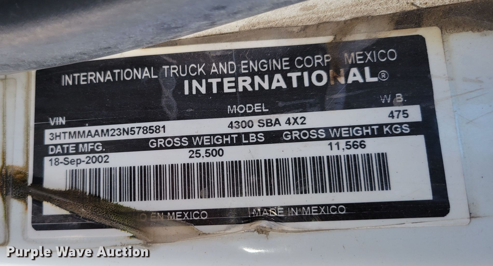 2003 International 4300 tow truck. Miles: 187,056 on odometer, Hours: 8,202 on meter, VIN: 3HTMMAAM23N578581. Engine International C215, Displacement: 7.6L, Cylinders: 6, Fuel type: Diesel. Transmission Eaton Fuller, Manual, Speed: 6. Chassis Axles: Single, Suspension: Spring, Brakes: Hydraulic, PTO, GVWR: 25,500 lbs. Interior AC, Heat, Heated mirrors, Power windows, Power locks, Cruise control. Features Wrecker bed 12' 8" L x 94" W, Wrecker boom: Hydraulic extendable, Winch Dual, Capacity: 24,000 lbs, Underlift. Tires Size: 245/70R19.5. Notes Dash warning indicator: ABS, Brake, Windshield chipped or cracked, Dead battery. Nebraska title. 4 Brothers Auto Sales. 5440 N 70th St. Lincoln, NE 68507