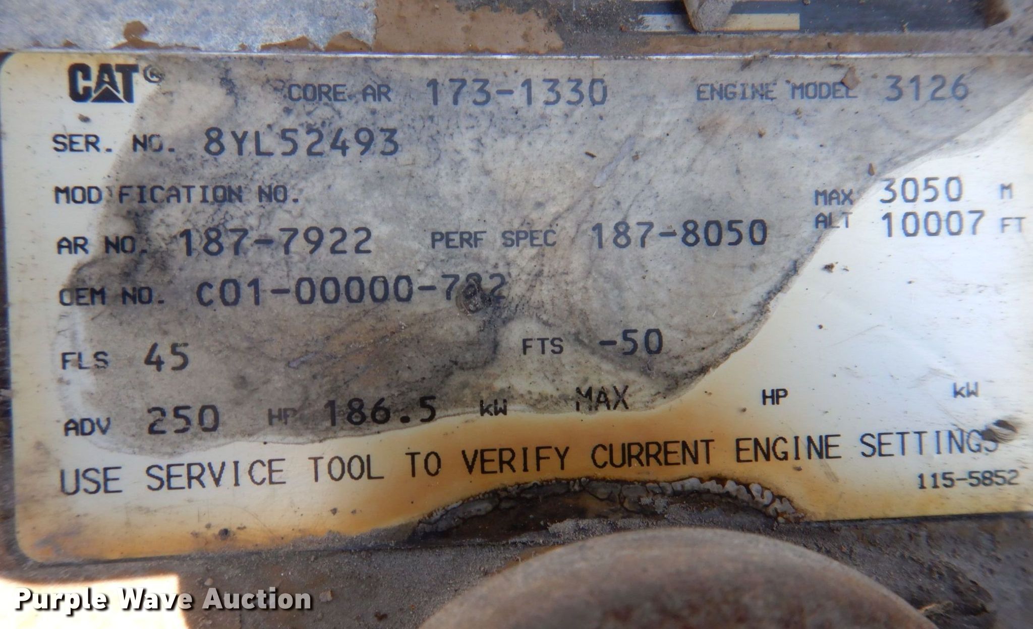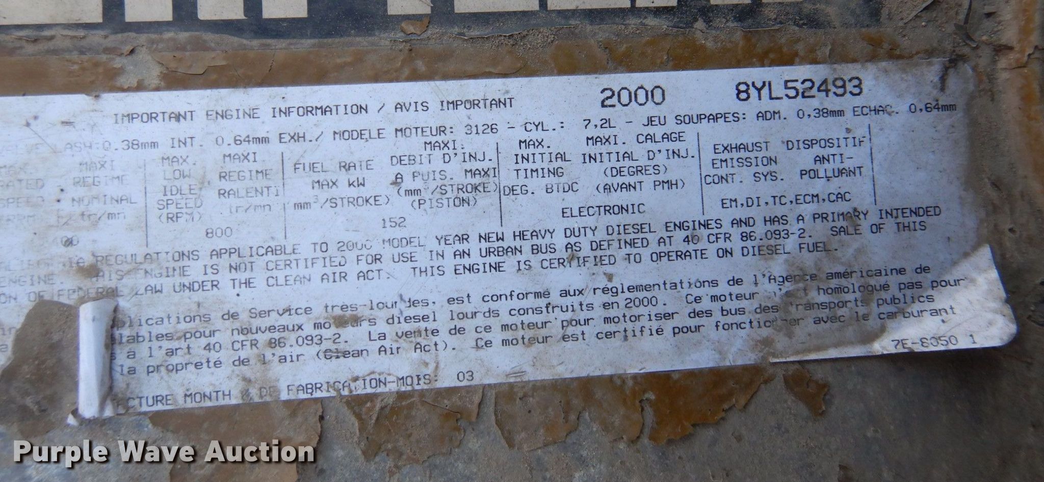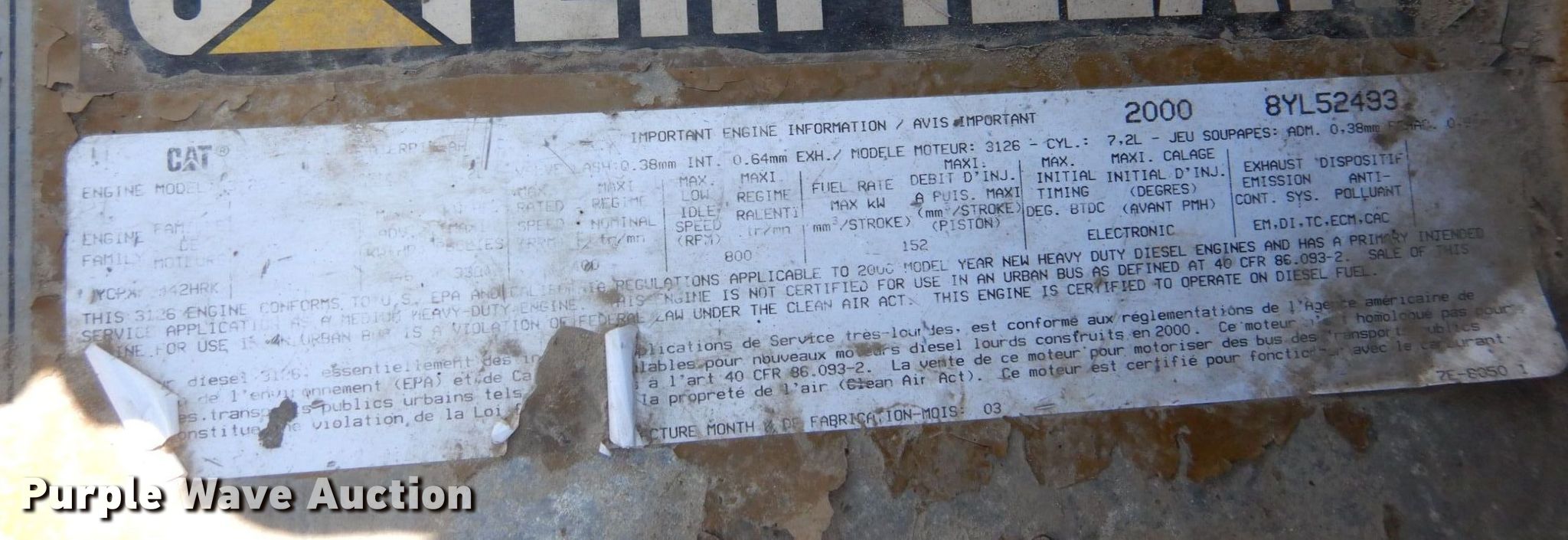 2000 Freightliner FL70 semi truck. Miles: 402,868 on odometer, VIN: 1FUWHJBA0YHG02534. Engine Caterpillar 3126, Serial: 8YL52493, Displacement: 7.2L, Cylinders: 6, Fuel type: Diesel. Transmission Manual, Speed: 6. Chassis Axles: Single, Suspension: Air, Brakes: Air, Truck chassis: 9' 10", GVWR: 29,000 lbs FAWR: 9,000 lbs, RAWR: 20,000 lbs, Wheelbase: 151". Interior Heat, Air ride cab. Features Deck plate: Aluminum, Fifth wheel type: Fixed, Fuel tank: Dual. Tires Size: 11R22.5. Notes Windshield chipped or cracked, Dead battery, Unknown operating condition. Missouri title. Lloyd Distributing Co Inc. 15789 US Hwy 63. Kirksville, MO 63501