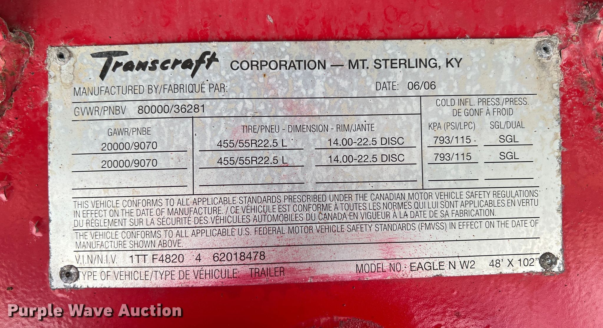 Purple Wave is selling a used Flat or Drop Deck Trailer in Oklahoma. This item is a 2006 Transcraft Eagle flatbed trailer with the following: VIN: 1TTF4820462018478