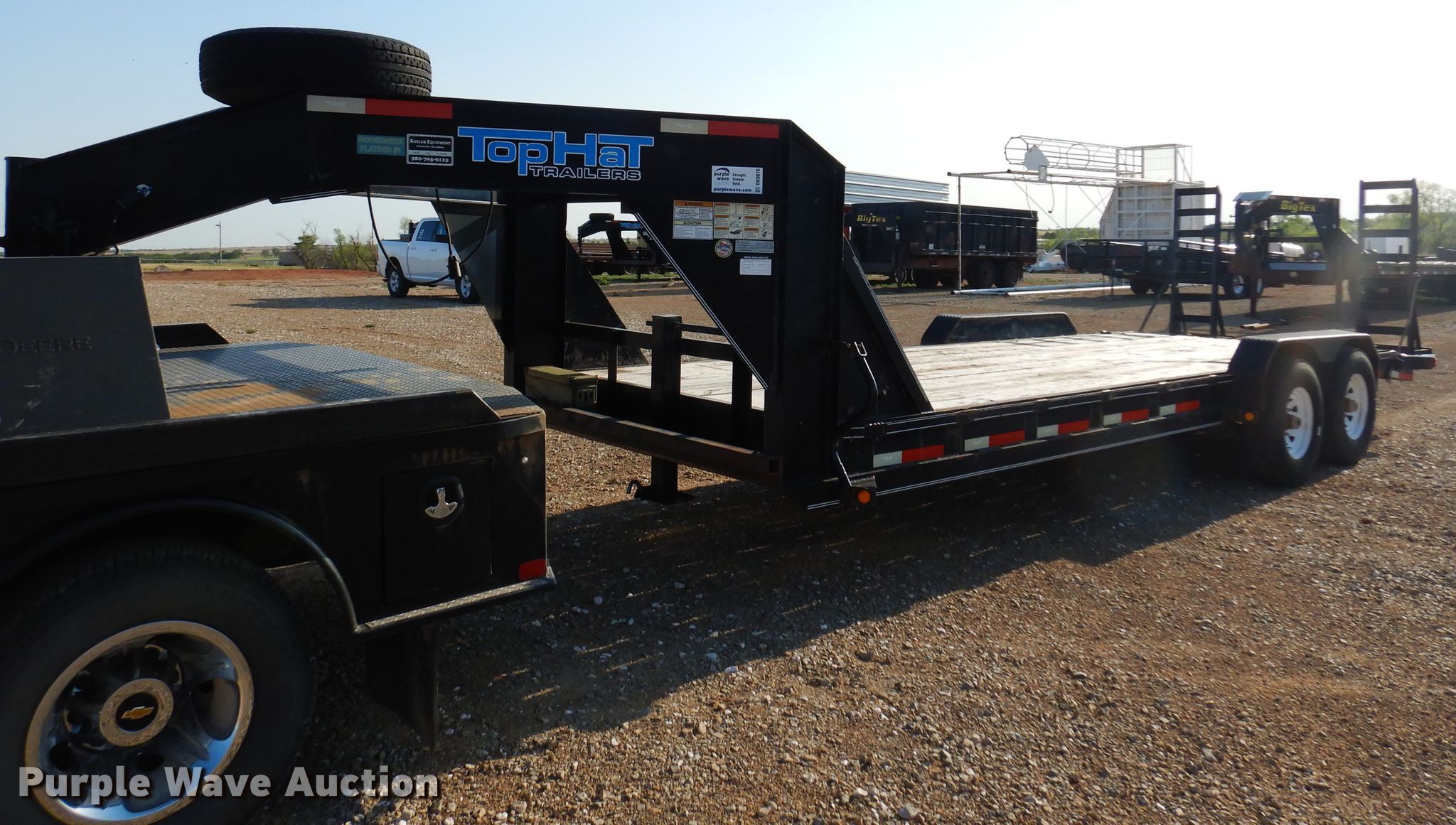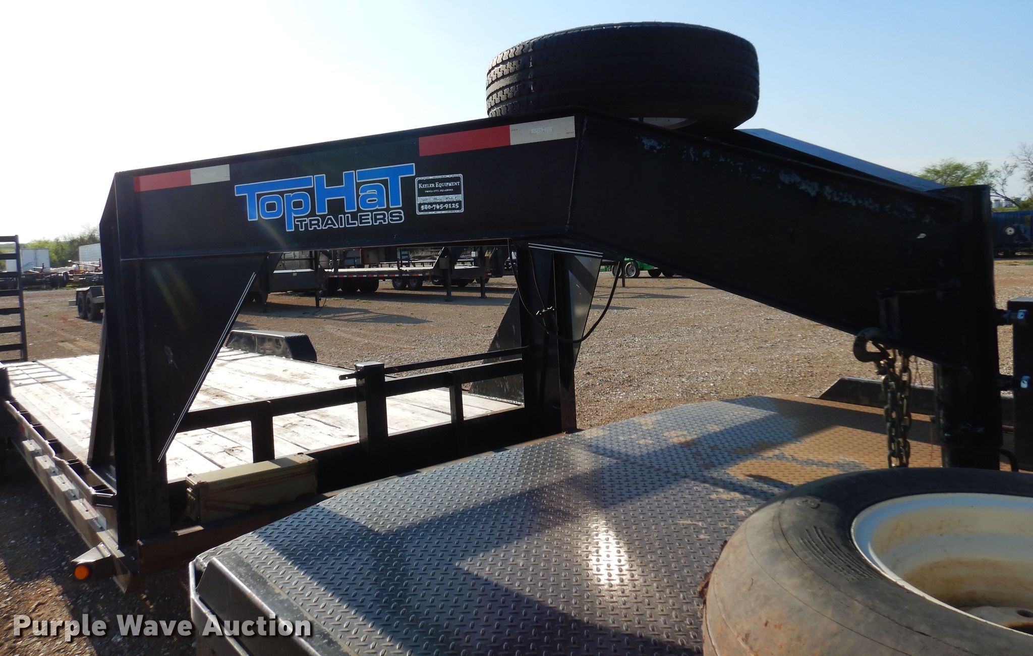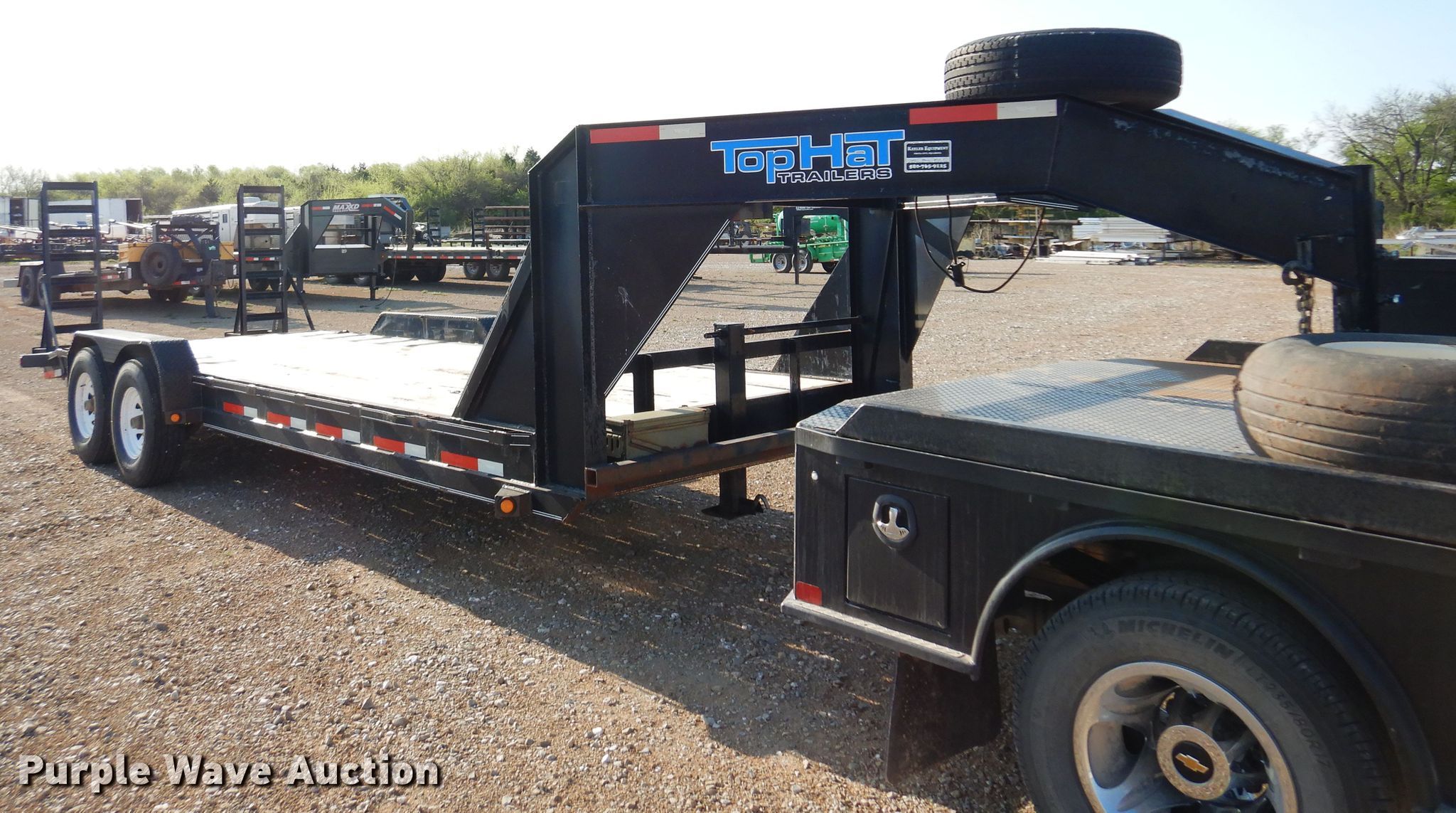 2013 Top Hat equipment trailer. VIN: 4R7GU2228DT124005. Dimensions Overall: 28' L x 102" W, Deck: 20' L x 84" W, Tail length: 2', Ramps: Manual Length: 4' 9". Features Deck type: Steel. Chassis Hitch: Gooseneck, Landing gear: Single, Suspension: Spring, Brakes: Electric, Axles: Tandem, GVWR: 14,000 lbs, GAWR: 6,840 lbs. Tires Steel wheels, Size: 235/85R16. Oklahoma title. Title distribution may be delayed up to 14 days from verification of funds. J and J Solutions. Perry, OK 73077
