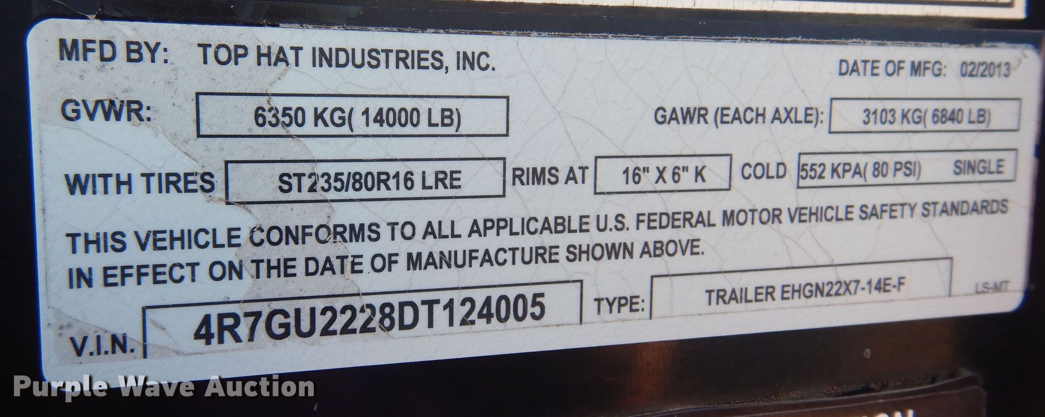 Purple Wave is selling a used Equip. Trailer in Oklahoma. This item is a 2013 Top Hat equipment trailer with the following: VIN: 4R7GU2228DT124005
