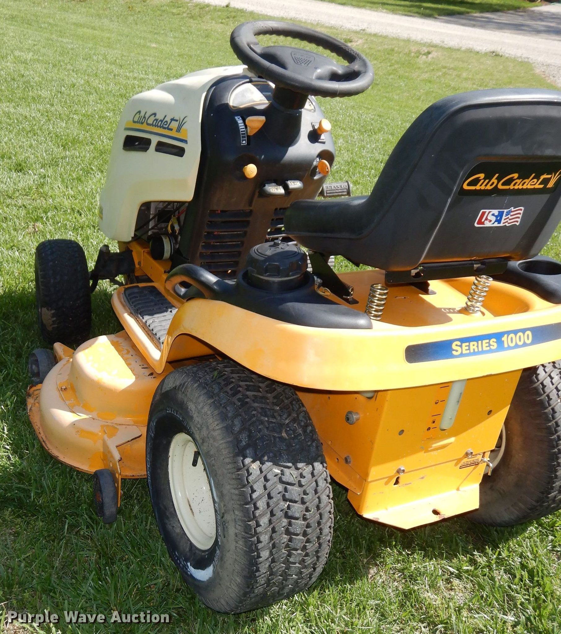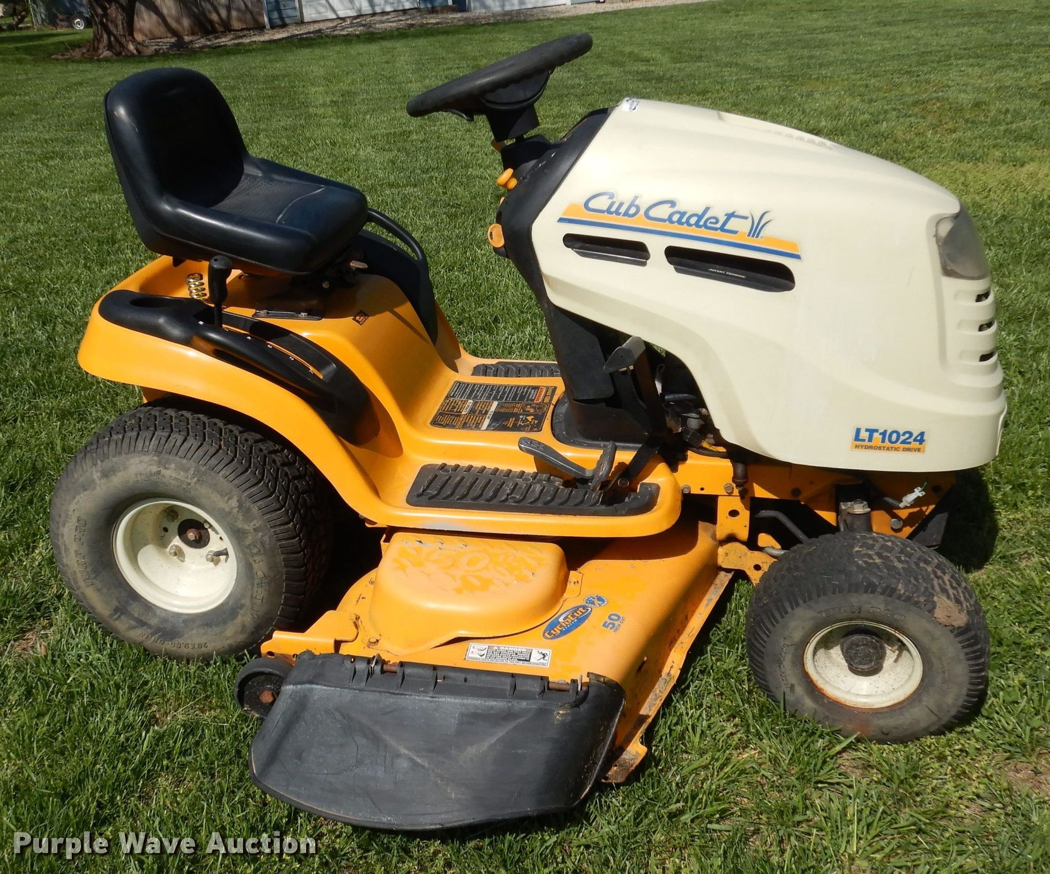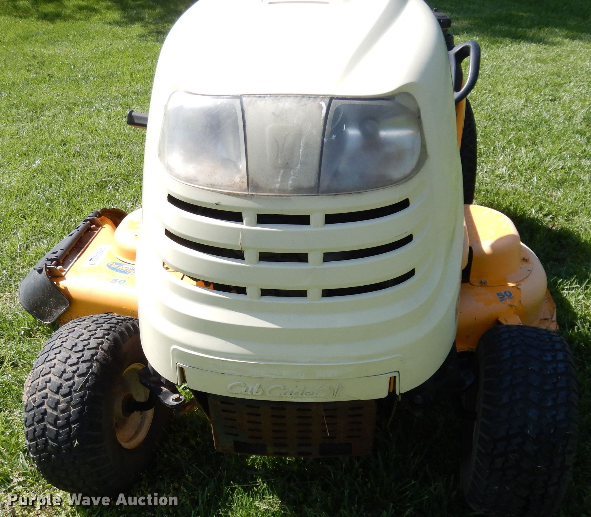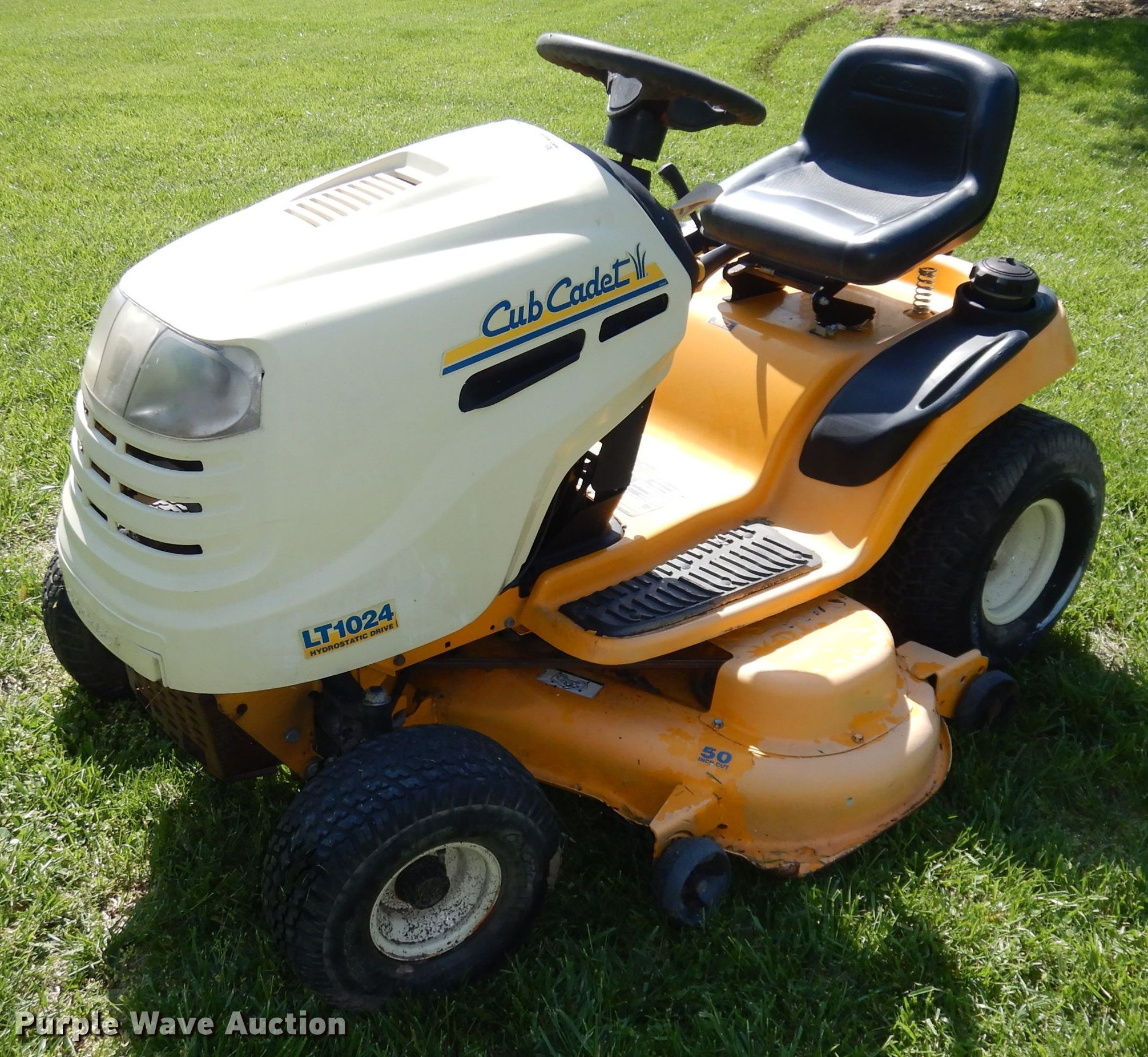 Purple Wave is selling a used Lawn Mower in Kansas. This item is a Cub Cadet LT1024 lawn mower with the following: Hours: 458 on meter, Cutting width: 50"