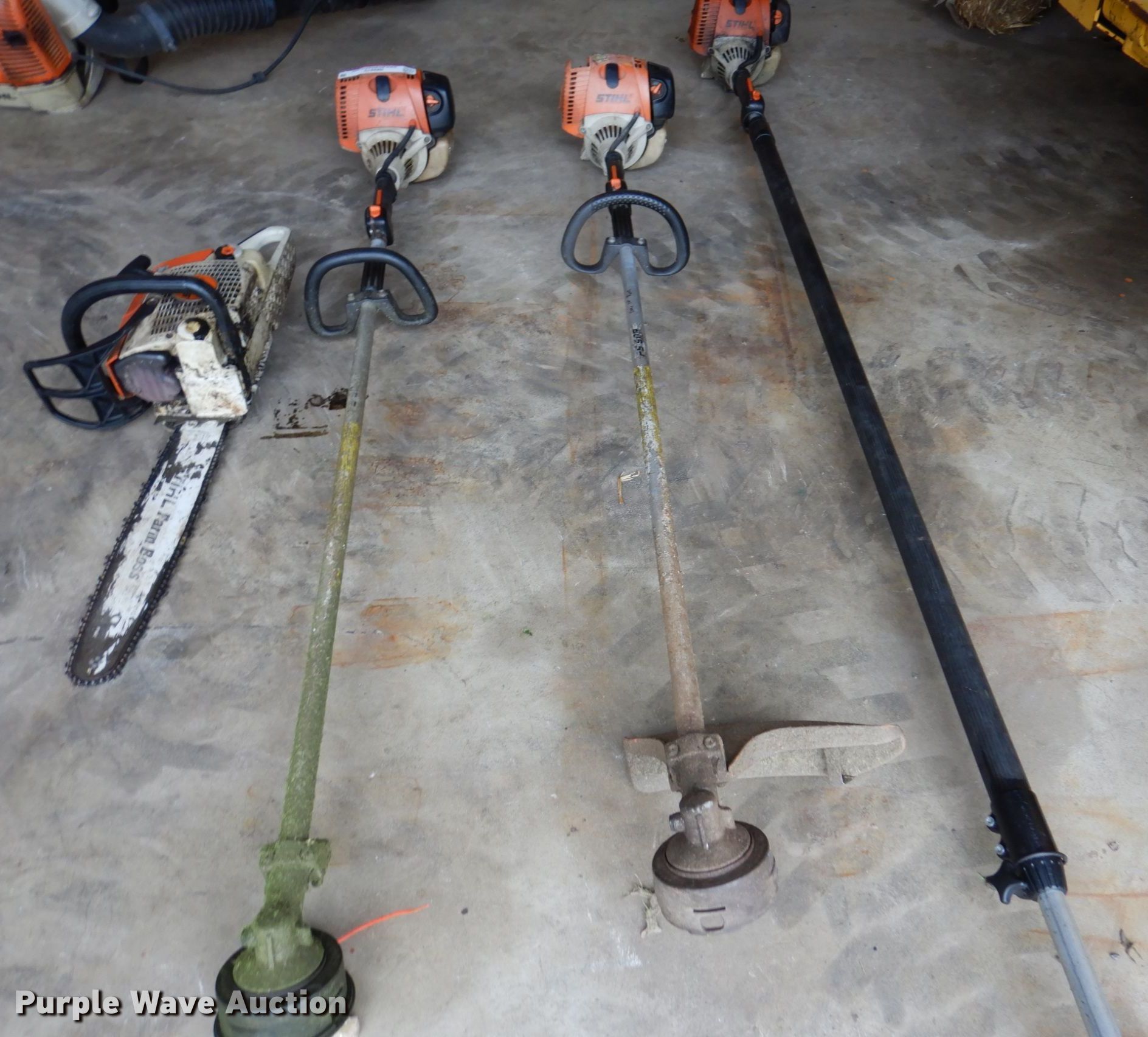 Purple Wave is selling a used Lawn and Garden in Indiana. This item is a Lawn and garden equipment with the following: Stihl MS280 chainsaw, 18" bar, (2) Stihl FS90R string trimmers, Gas cap missing, Stihl HT101 pole saw, 12" bar, Non-operational unit