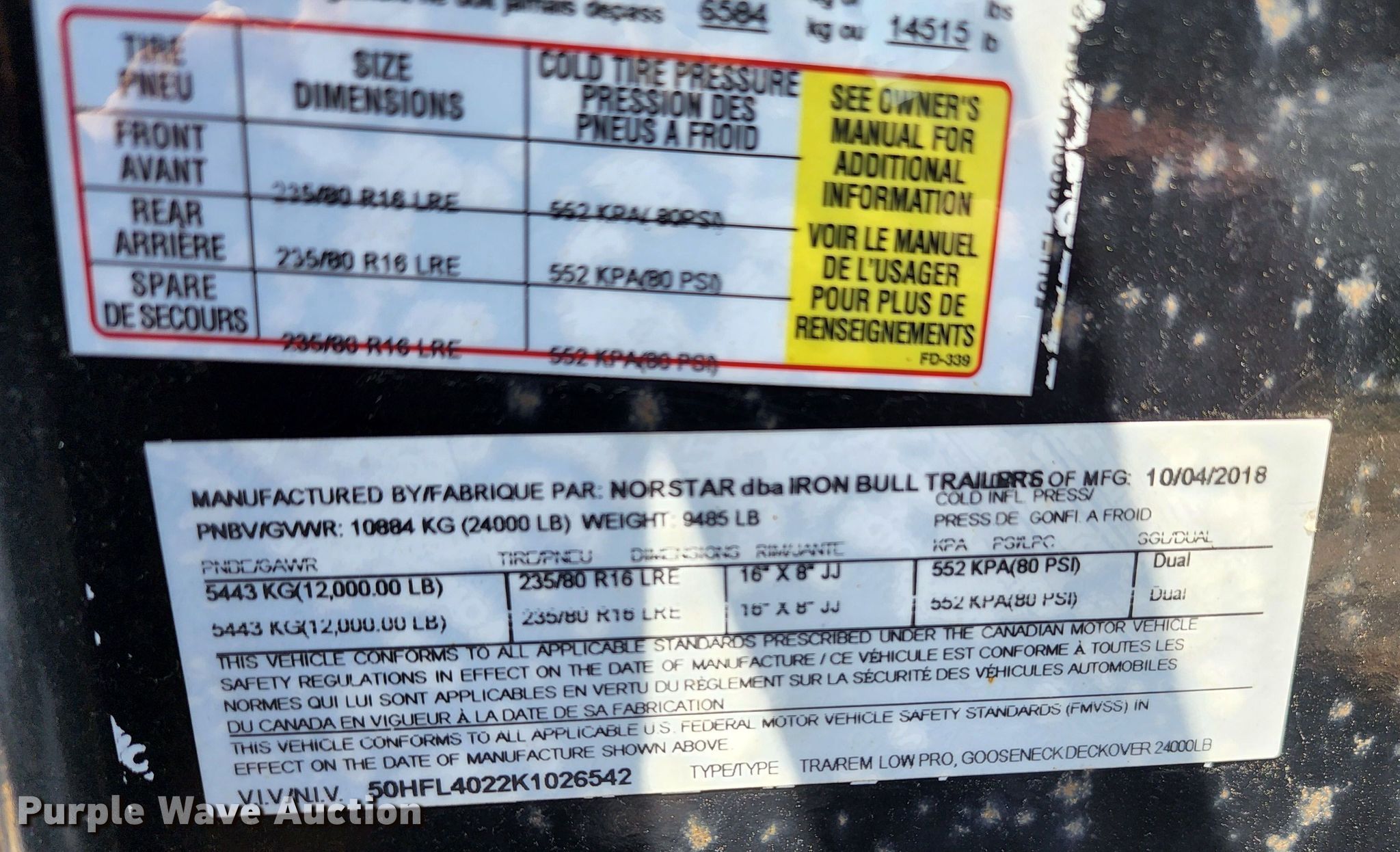 2018 Norstar equipment trailer. VIN: 50HFL4022K1026542. Dimensions Overall: 48' L x 102" W, Deck: 34' L x 102" W Length: 68". Features Deck type: Wood. Chassis Hitch: Gooseneck, Landing gear: Dual, Suspension: Spring, Brakes: Electric, Axles: Tandem, GVWR: 24,000 lbs. Tires Size: 235/80R16. Missouri title. Title has a lien that will be released following the close of the auction. Title distribution may be delayed up to 30 days from verification of funds. 2503 US-40. Blue springs, MO 64015