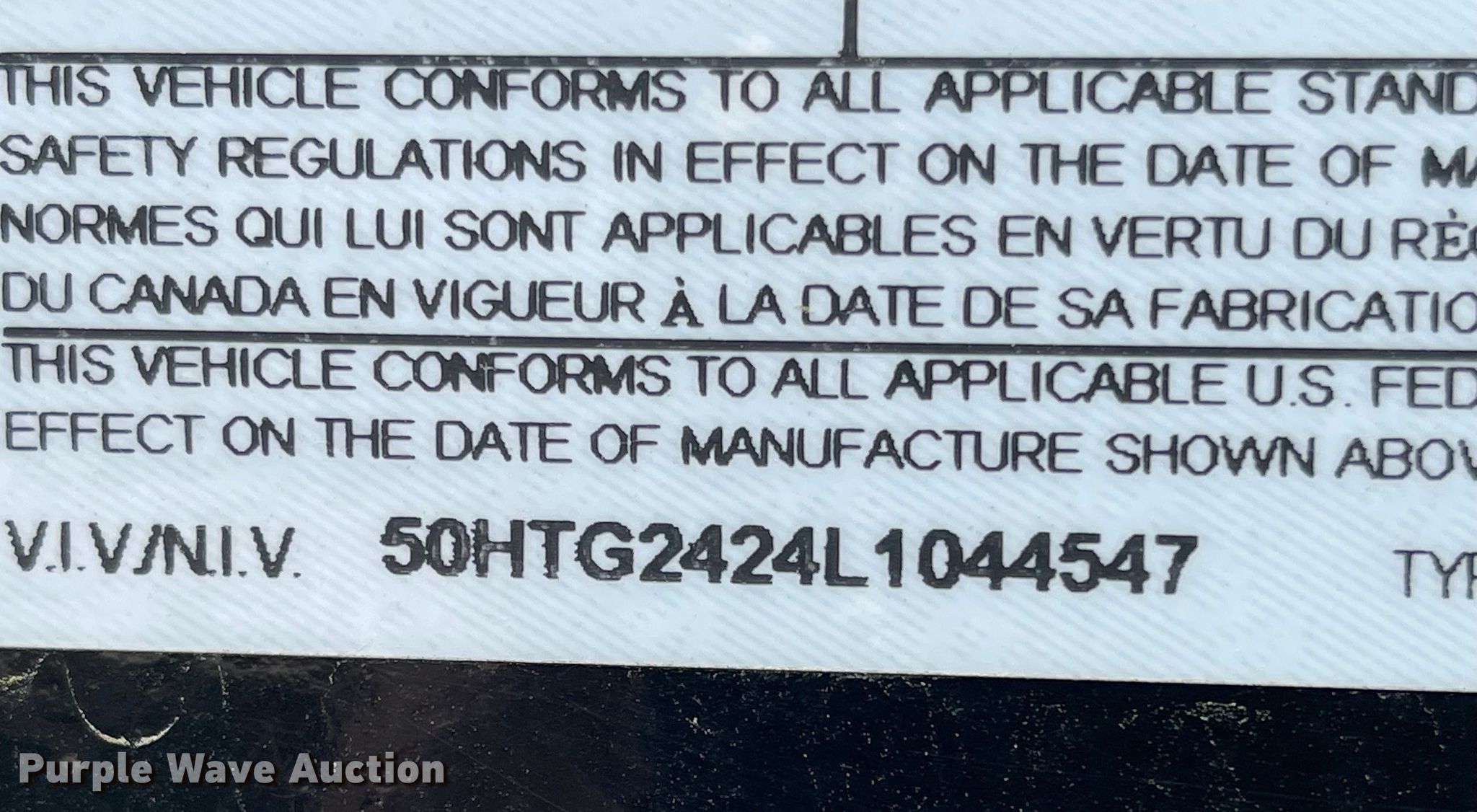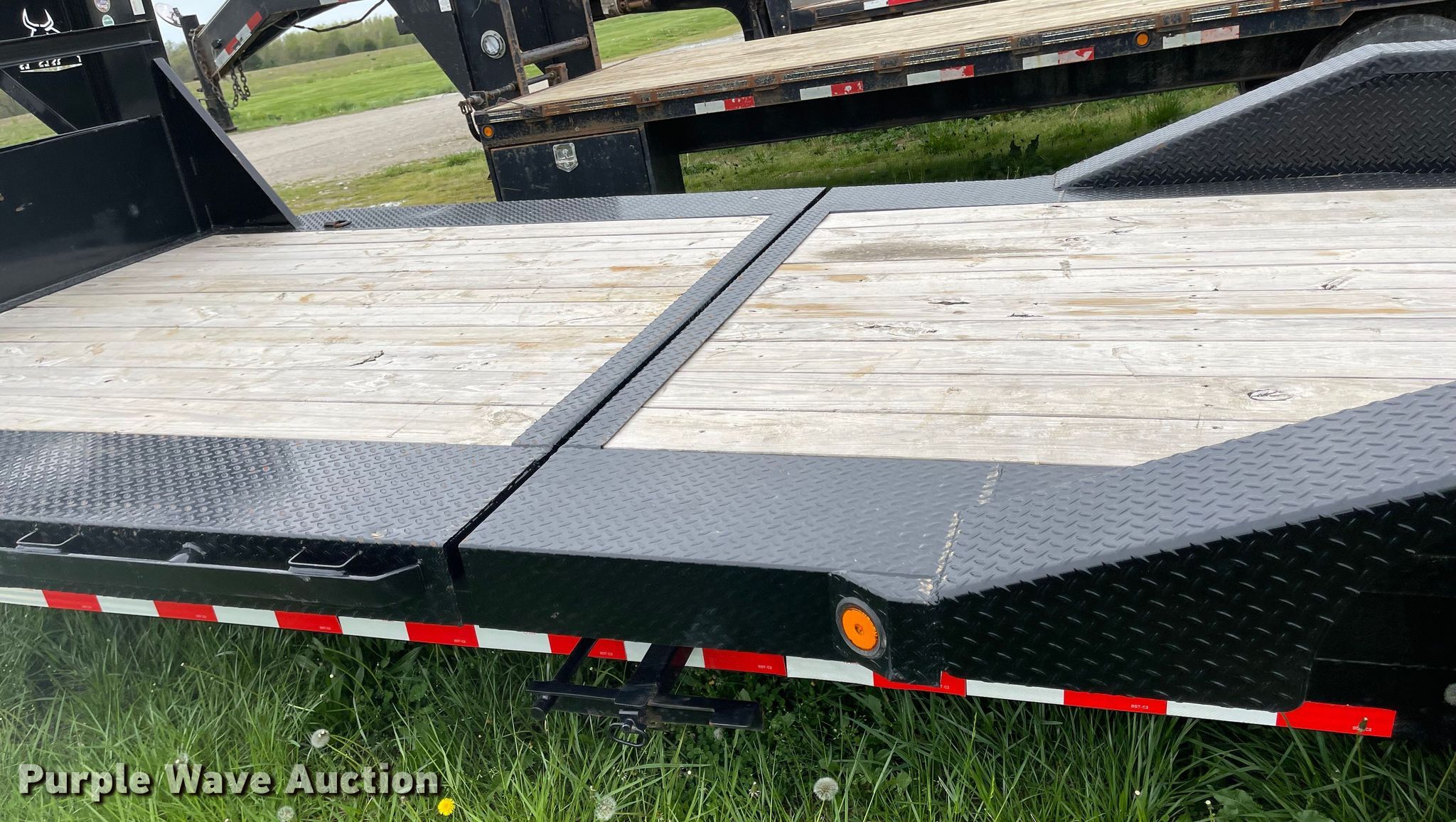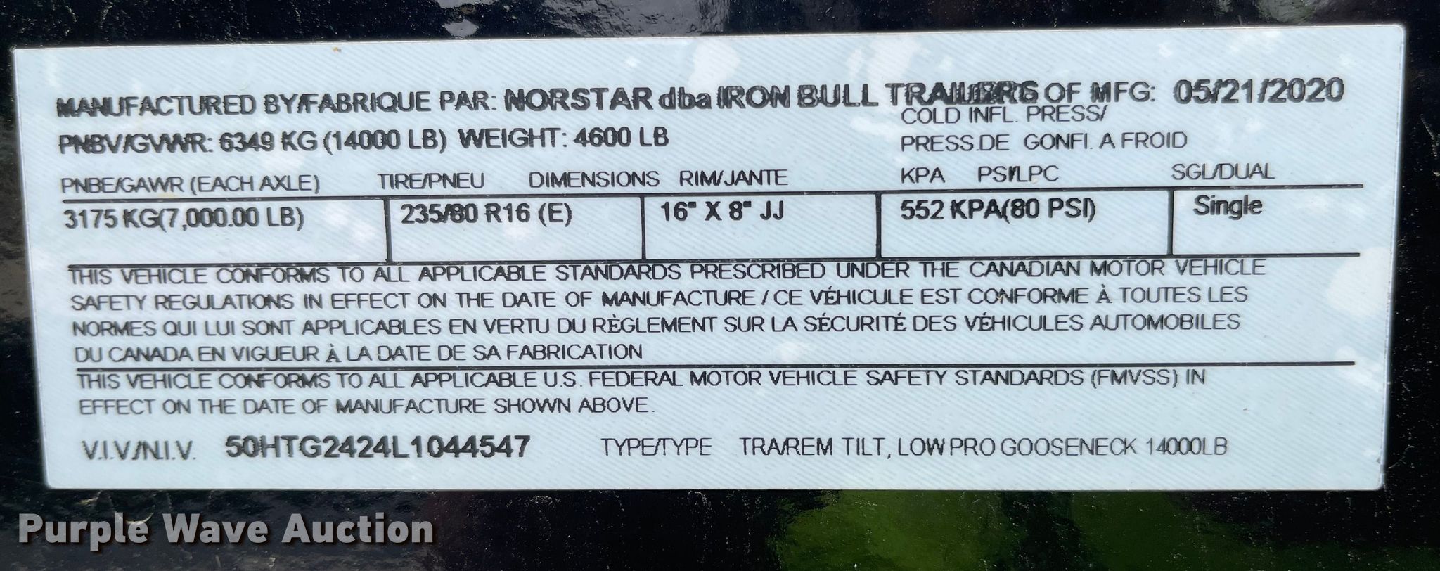 2020 Norstar tilt deck equipment trailer. VIN: 50HTG2424L1044547. Dimensions Overall: 33' L x 101" W, Deck: 24' 9" L x 101" W. Features Deck type: Wood. Chassis Hitch: Gooseneck, Landing gear: Dual, Suspension: Spring, Brakes: Electric, Axles: Tandem, GVWR: 14,000 lbs, GAWR: 7,000 lbs. Tires Steel wheels, Size: 235/80R16. Missouri title. Heritage Tractor. 17821 E Old Town Rd. Nevada, MO 64772