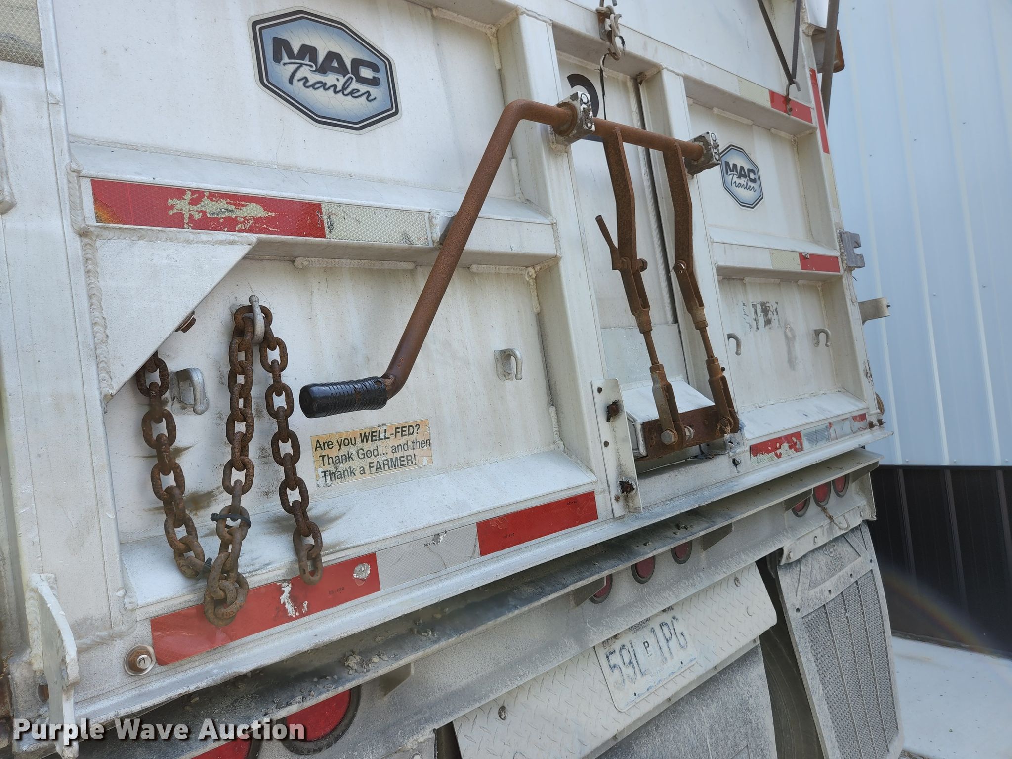 2007 MAC end dump trailer. VIN: 5MADN39207C012417. Dimensions Overall: 40' L x 96" W, Side height: 60". Features Body type: Aluminum, Ram: Single, End gate: Air operated Grain door, Poly liner, Roll tarp. Chassis Landing gear: Dual, Two speed, Suspension: Air, Brakes: Air, Axles: Tandem, GVWR: 80,000 lbs, GAWR: 23,000 lbs. Tires Aluminum wheels, Size: 11R22.5. Missouri title. ELS Hauling. 2898 Benton Hill Rd. Cape Girardeau, MO 63701