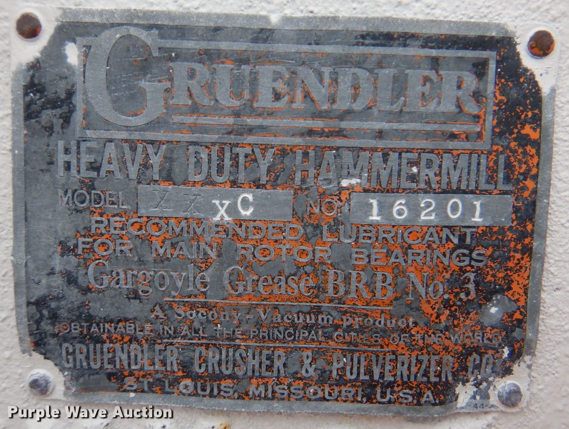 Purple Wave is selling a used Crusher or Crushing Plant in Kansas. This item is a Gruendler XXXC hammermill with the following: Serial: 16201