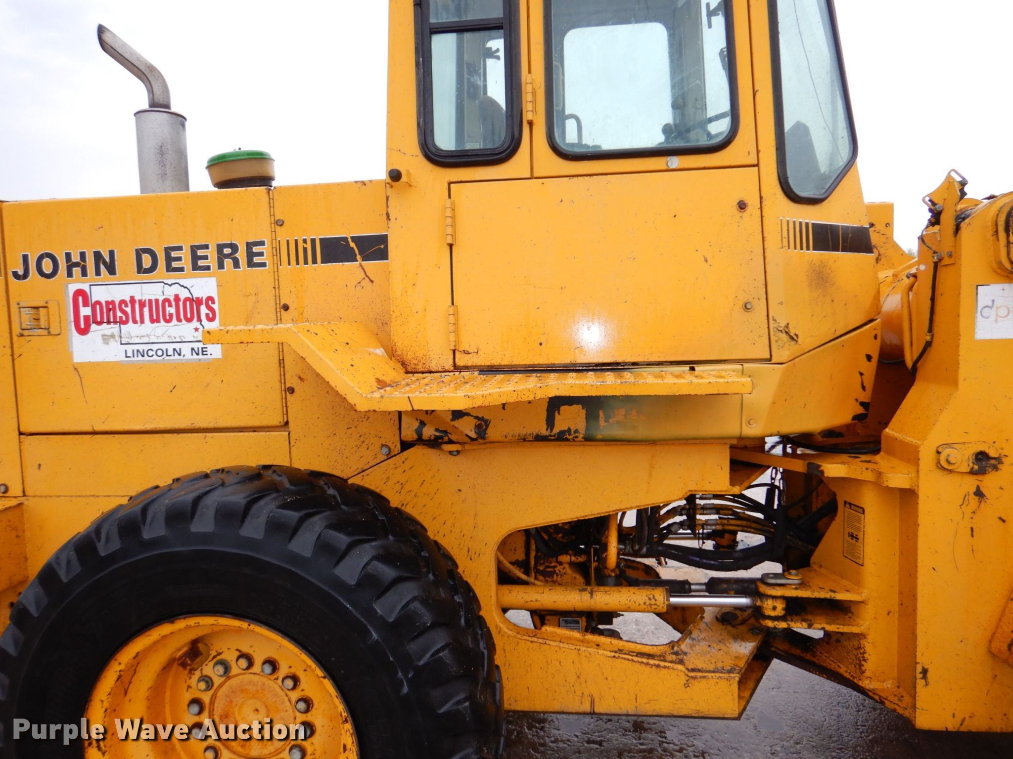 1990 John Deere 544E wheel loader. Hours: 17,819 on meter, Serial: DW544ED527123. Engine Cylinders: 6, Fuel type: Diesel. Transmission Powershift, 4F - 3R. Operators station EROPS, Bucket controls: Joystick. Features Bucket Width: 100", Cutting edge: Bolt-on. Tires Size: 17.5-25. Constructors, Inc.. 6500 N 70th St. Lincoln, NE 68507