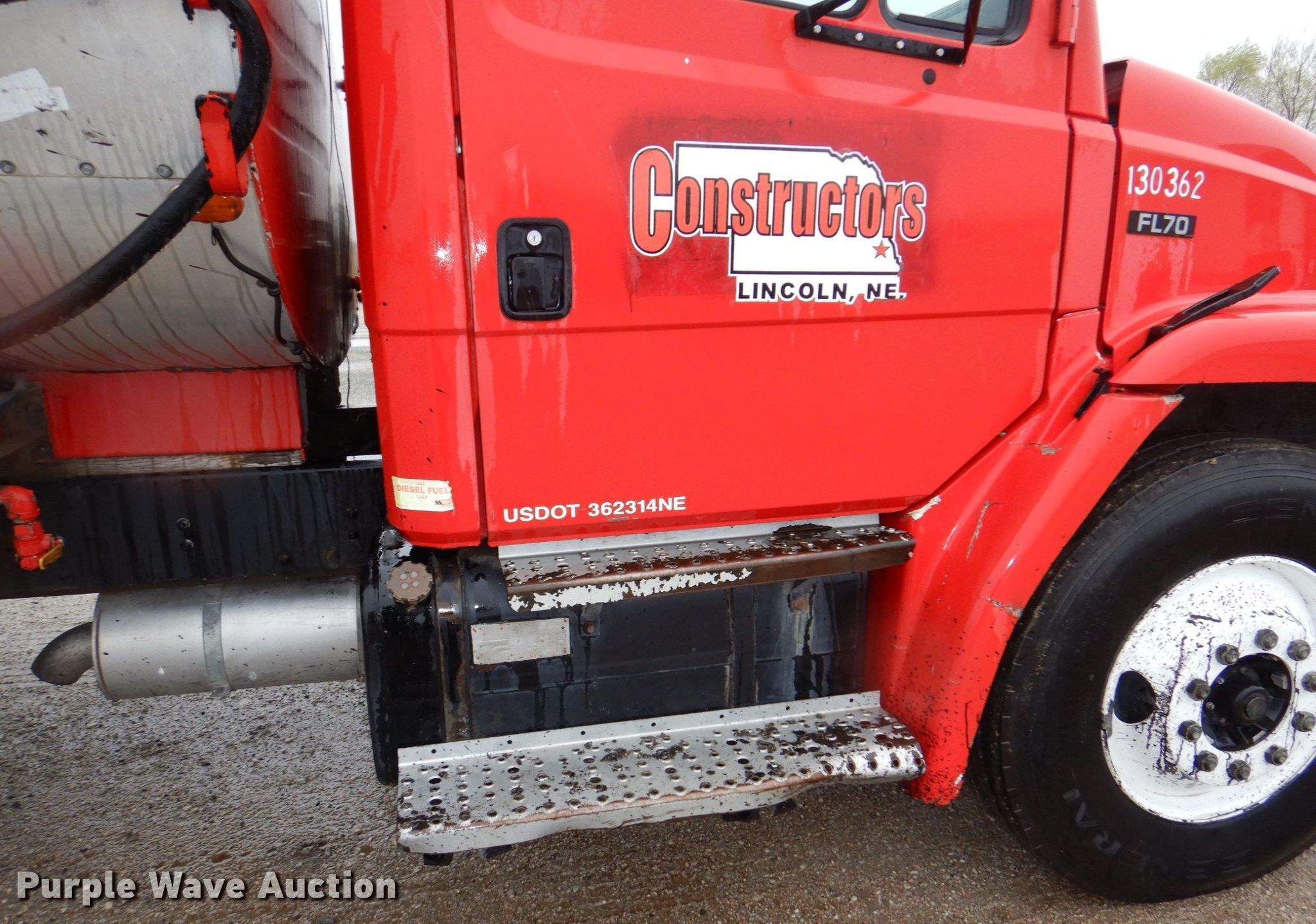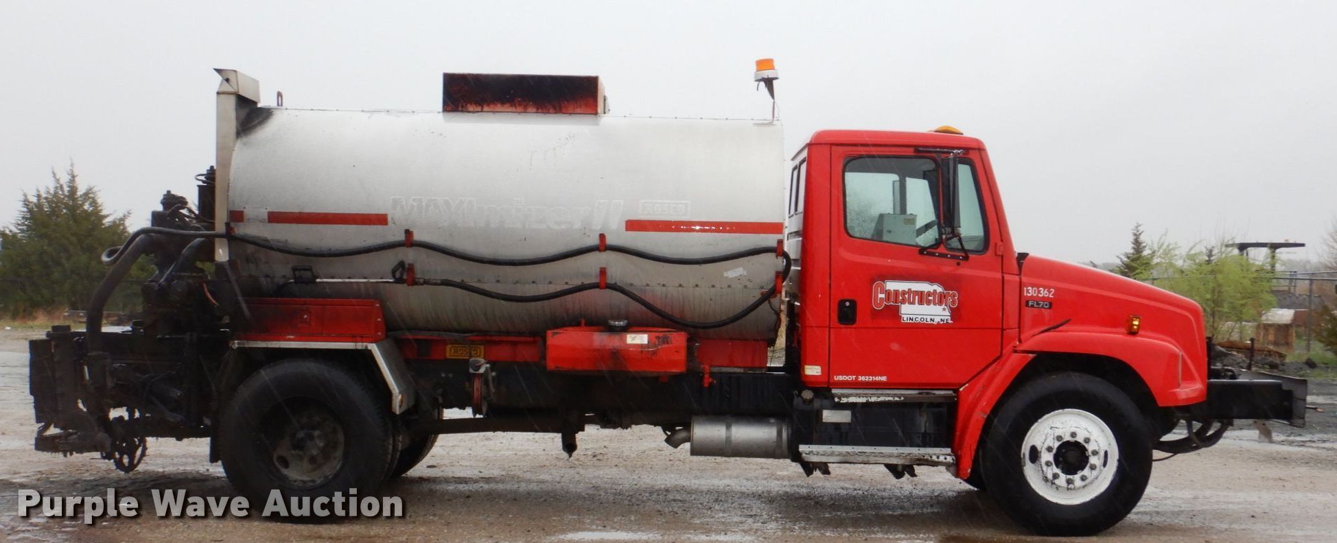 1999 Freightliner FL70 tank truck. Miles: 121,979 on odometer, Hours: 9,638 on meter, VIN: 1FV6HFAA7XHA75827. Engine Cummins ISB, Displacement: 5.9L, Cylinders: 6, Fuel type: Diesel. Transmission Manual, Speed: 5, plus 2. Chassis Axles: Single, Suspension: Spring, Brakes: Air, GVWR: 33,000 lbs, Wheelbase: 188". Interior AC, Heat, Auxiliary controls. Features Oil distributor Burner: Diesel, In-cab controls, Spray boom Width: 12', Folding, Side shift, Nozzles: 36.. Tires Size: 11R22.5. Notes Dead battery. Nebraska title. Constructors, Inc.. 6500 N 70th St. Lincoln, NE 68507