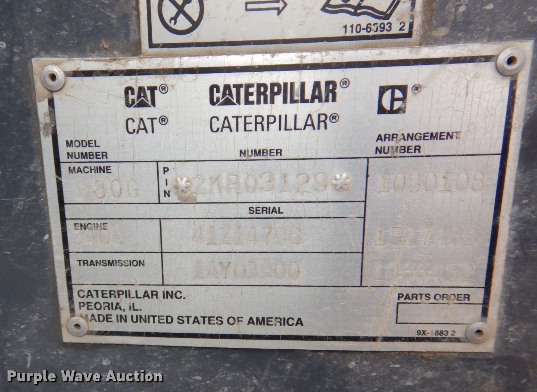 1999 Caterpillar 980G wheel loader. Hours: 27,014 on meter, Serial: 2KR03129. Engine Caterpillar 3406, Serial: 41Z14796, Cylinders: 6, Fuel type: Diesel. Transmission Powershift, 4F - 4R. Operators station Enclosed cab, AC, Heat, Bucket controls: Two-lever. Features Bucket Caterpillar, Width: 136", Cutting edge: Bolt-on. Tires Size: 29.5R25. Western Sand & Gravel. 903 Hills Farm Road. Fremont, NE 68025