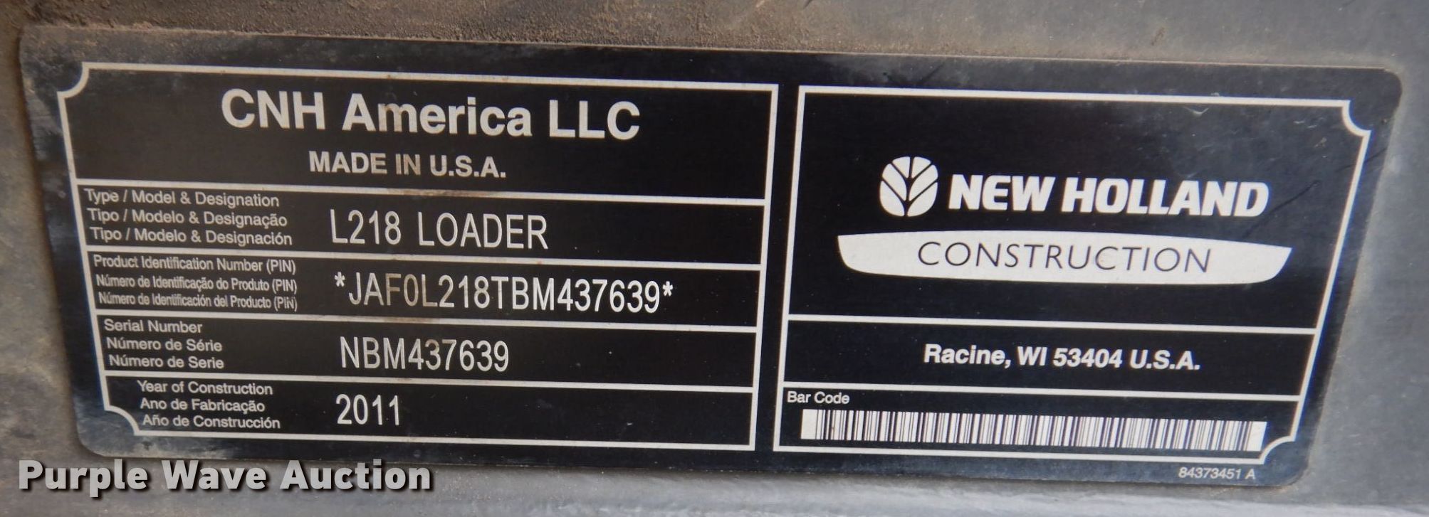 Purple Wave is selling a used Skid Steer Loader in Indiana. This item is a 2011 New Holland L218 skid steer loader with the following: Hours: 843 on meter, Serial: NBM437639