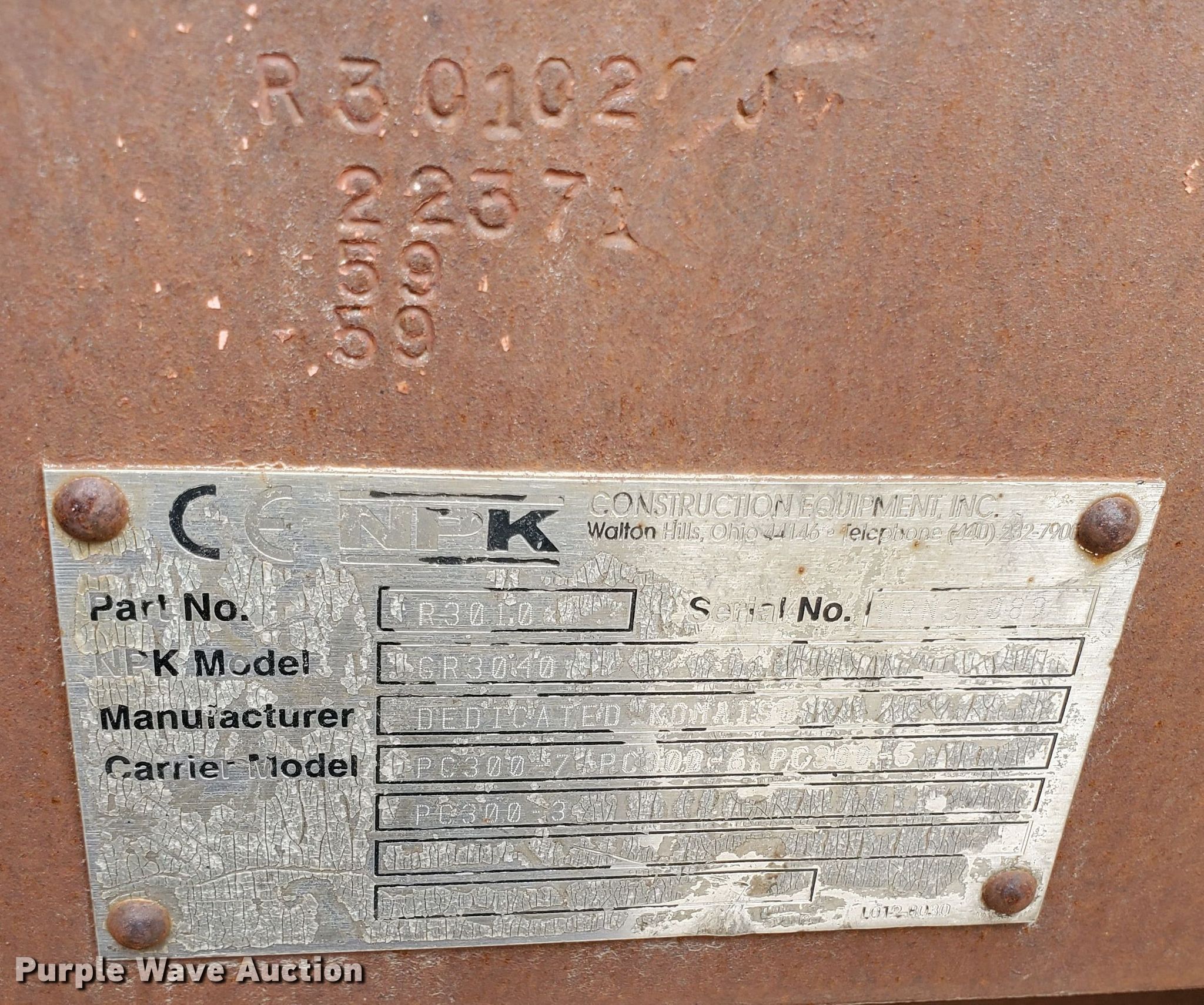 Purple Wave is selling a used Demolition or Scrap Grapple in Kansas. This item is a NPK GR3040 scrap grapple with the following: Width: 48", Fits Komatsu PC300 excavators