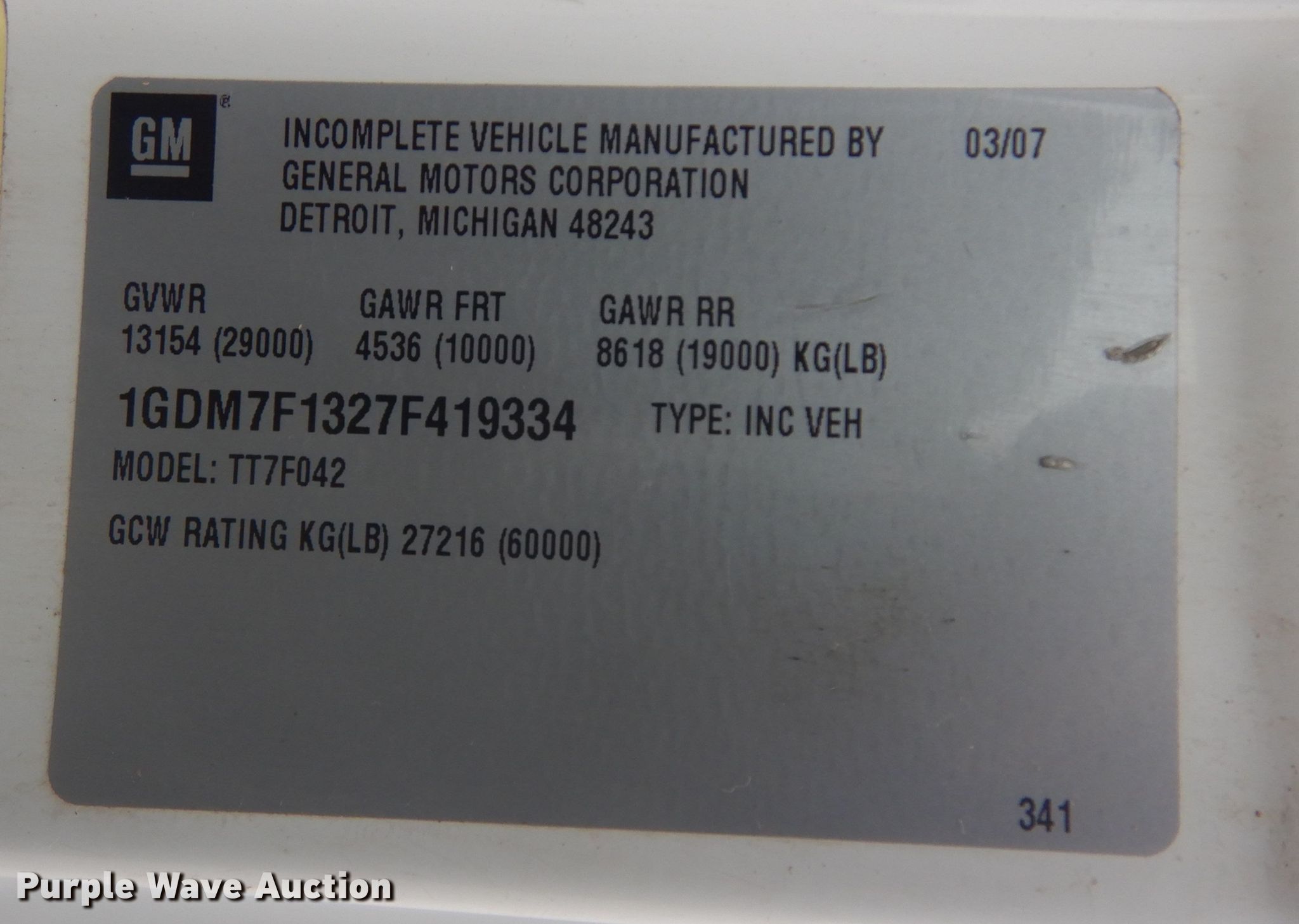 Purple Wave is selling a used Flat Bed Truck in South Dakota. This item is a 2007 GMC T7500 dump flatbed truck with the following: Miles: 99,366 on odometer, VIN: 1GDM7F1327F419334