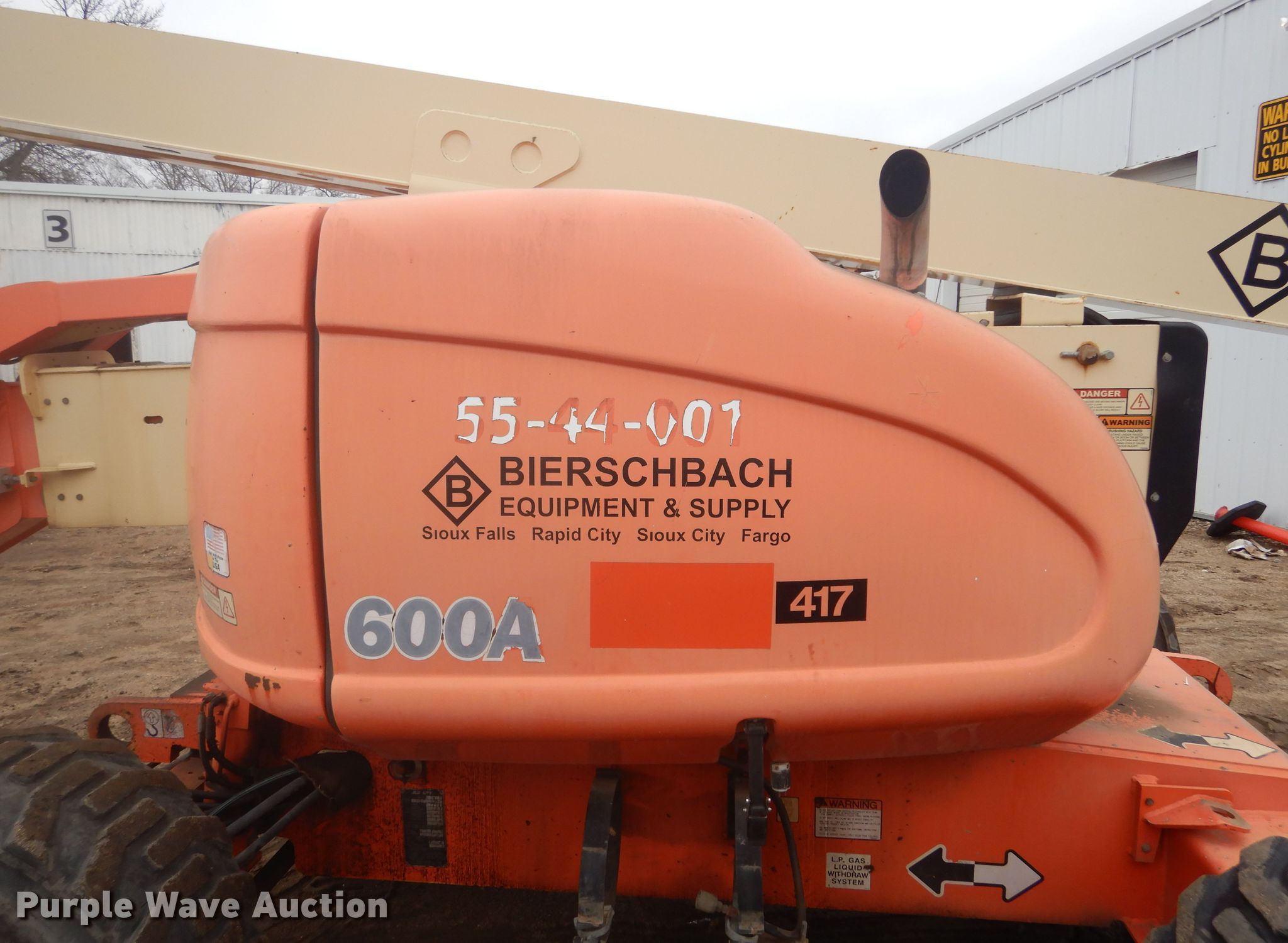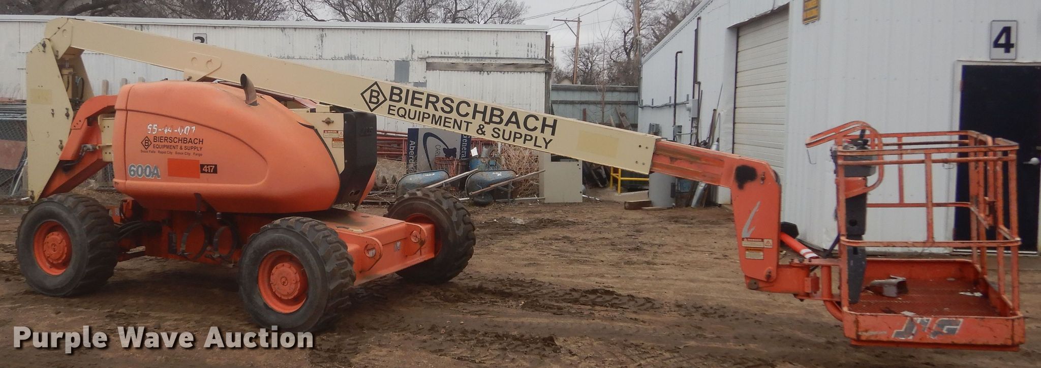 1998 JLG 600A boom lift. Hours: 7,141 on meter, Serial: 0709870300036295. Engine Cylinders: 4, Fuel type: Dual fuel LP bottle: Not included. Chassis Four wheel drive. Features Articulating boom, Rough terrain, Maximum lift capacity: 1,000 lbs, Maximum reach length: 39', Maximum lift height: 60', Hydraulic leveling, Platform: 72" L x 36" W, AC power outlet, Controls: Platform, Ground, Platform rotation: Hydraulic. Tires Tire size: 14-17.5. Notes Propane tank not included, Dead battery, Possible electrical issues, Possible starting issues. Kyburz-Carlson Construction. 409 7th Ave SW. Aberdeen, SD 57401