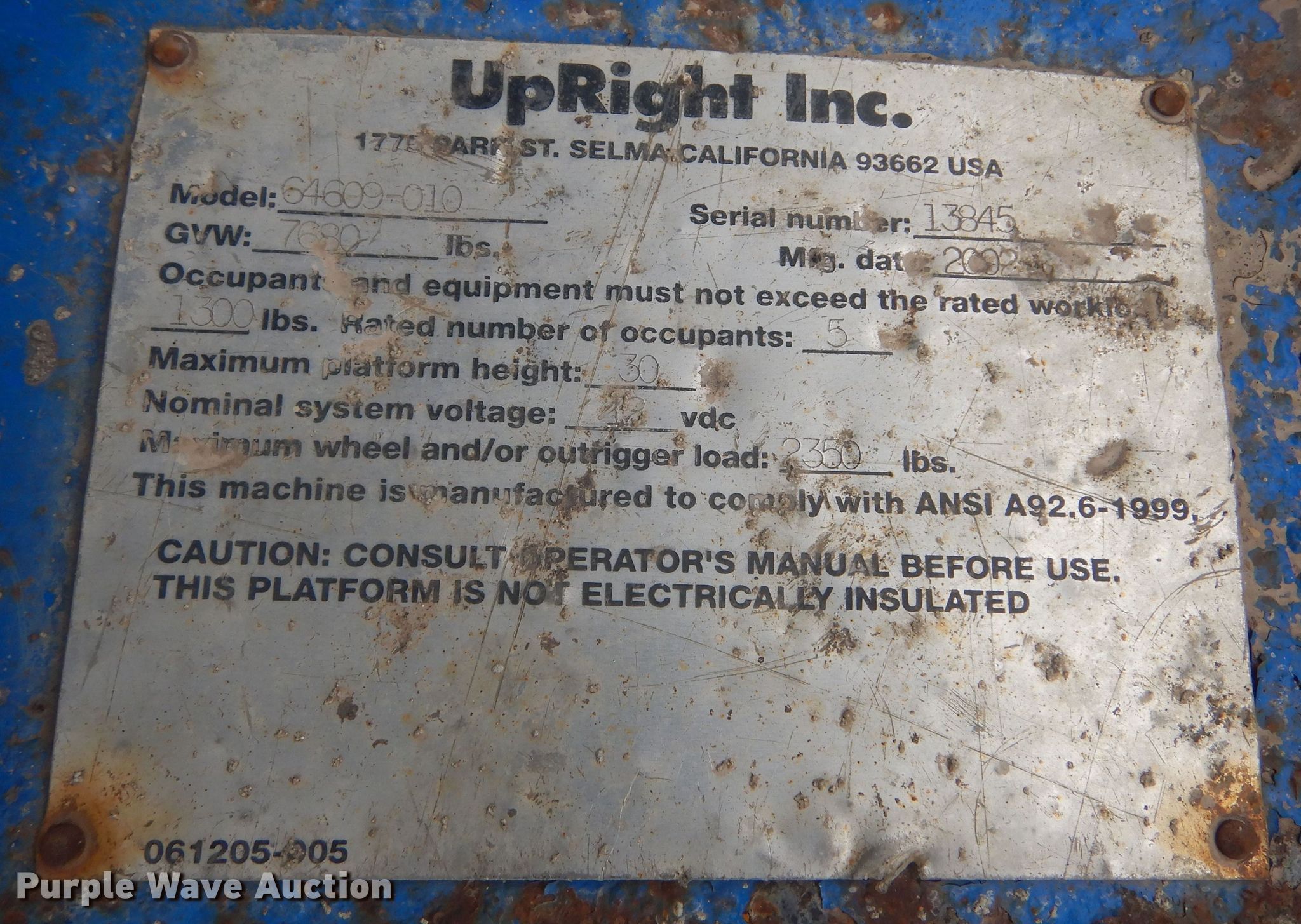 Purple Wave is selling a used Scissor or Vertical Lift in South Dakota. This item is a 2002 Up Right SL30 scissor lift with the following: Hours: 3,748 on meter, Serial: 13845