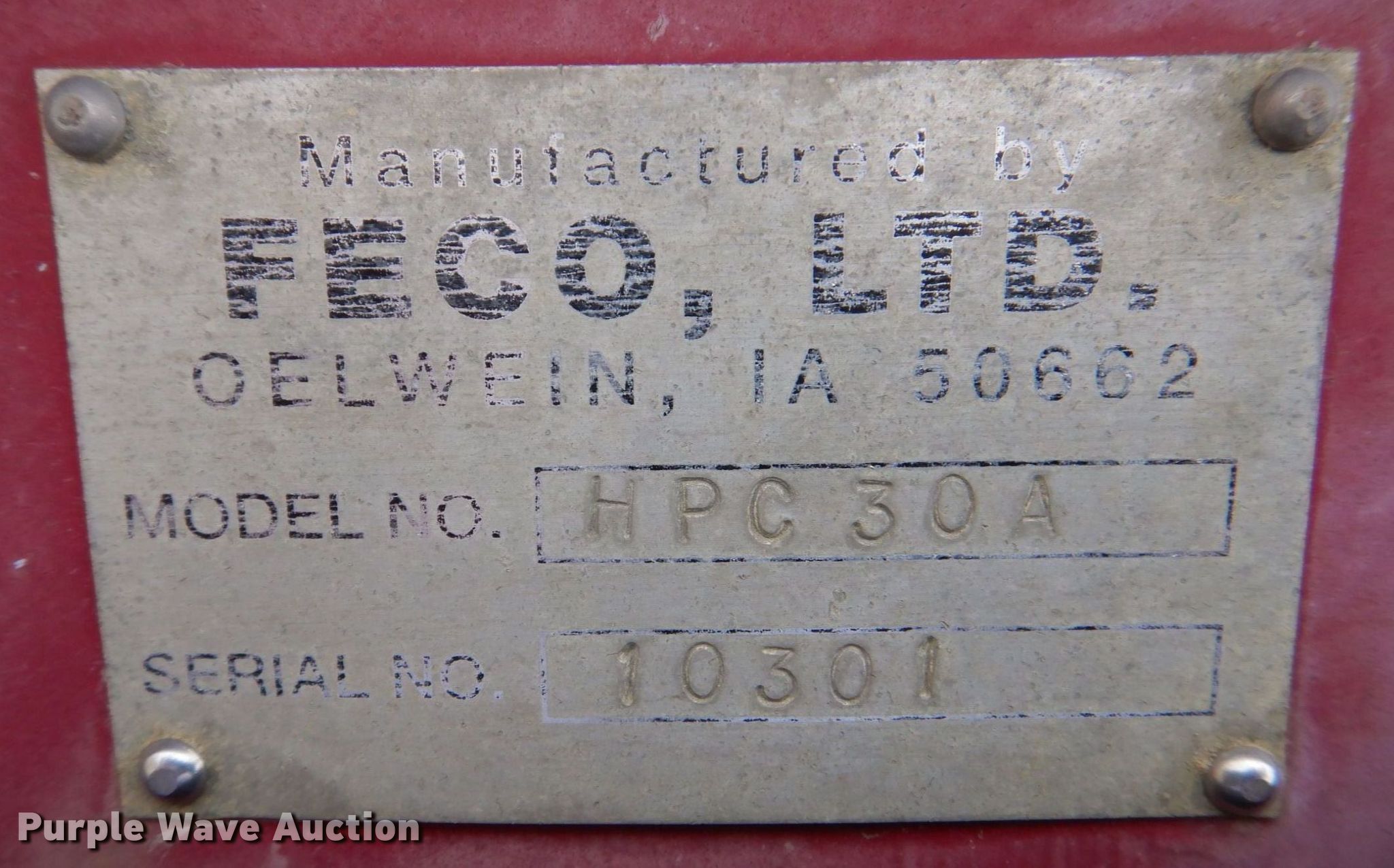 Purple Wave is selling a used Conveyor in Iowa. This item is a Feco. LTD HPC30A conveyor with the following: Hours: 2,519 on meter, Serial: 10301