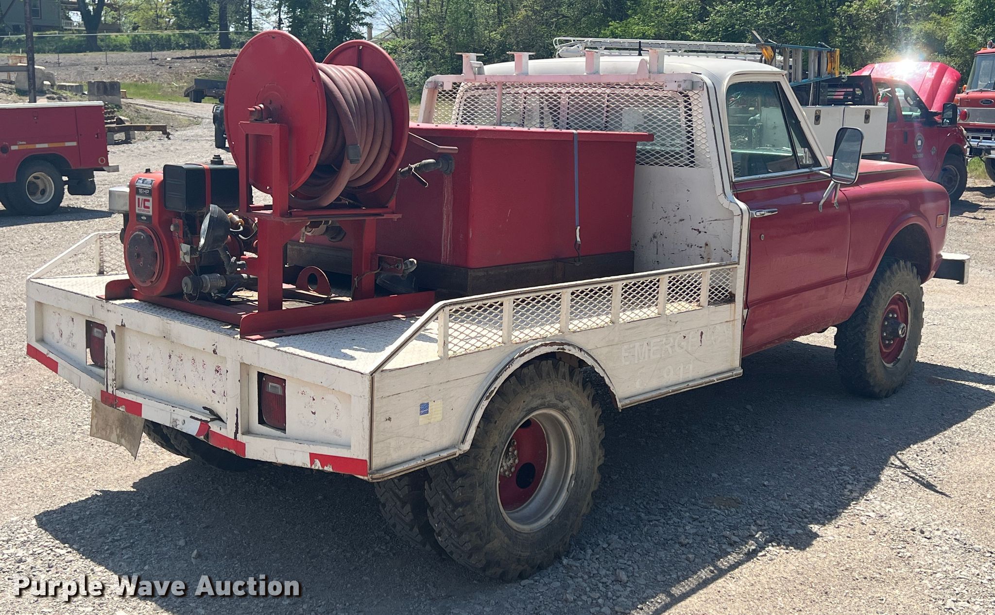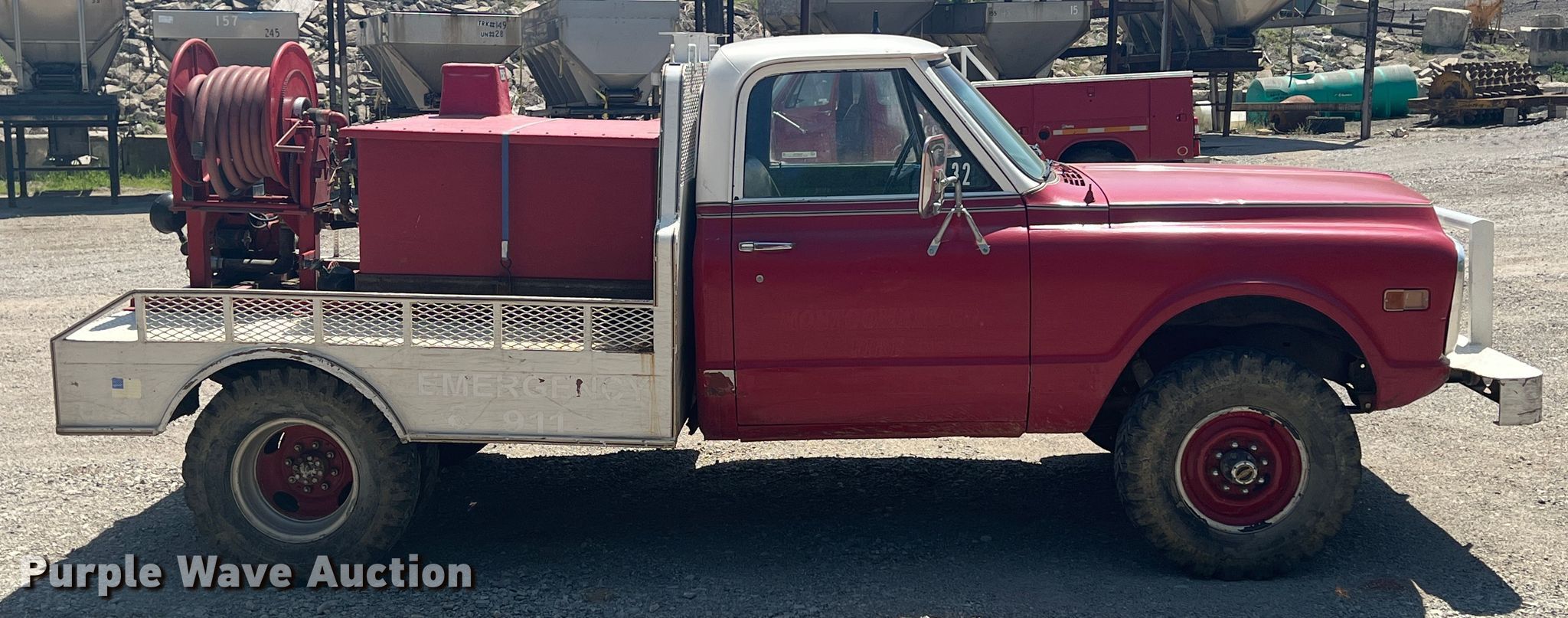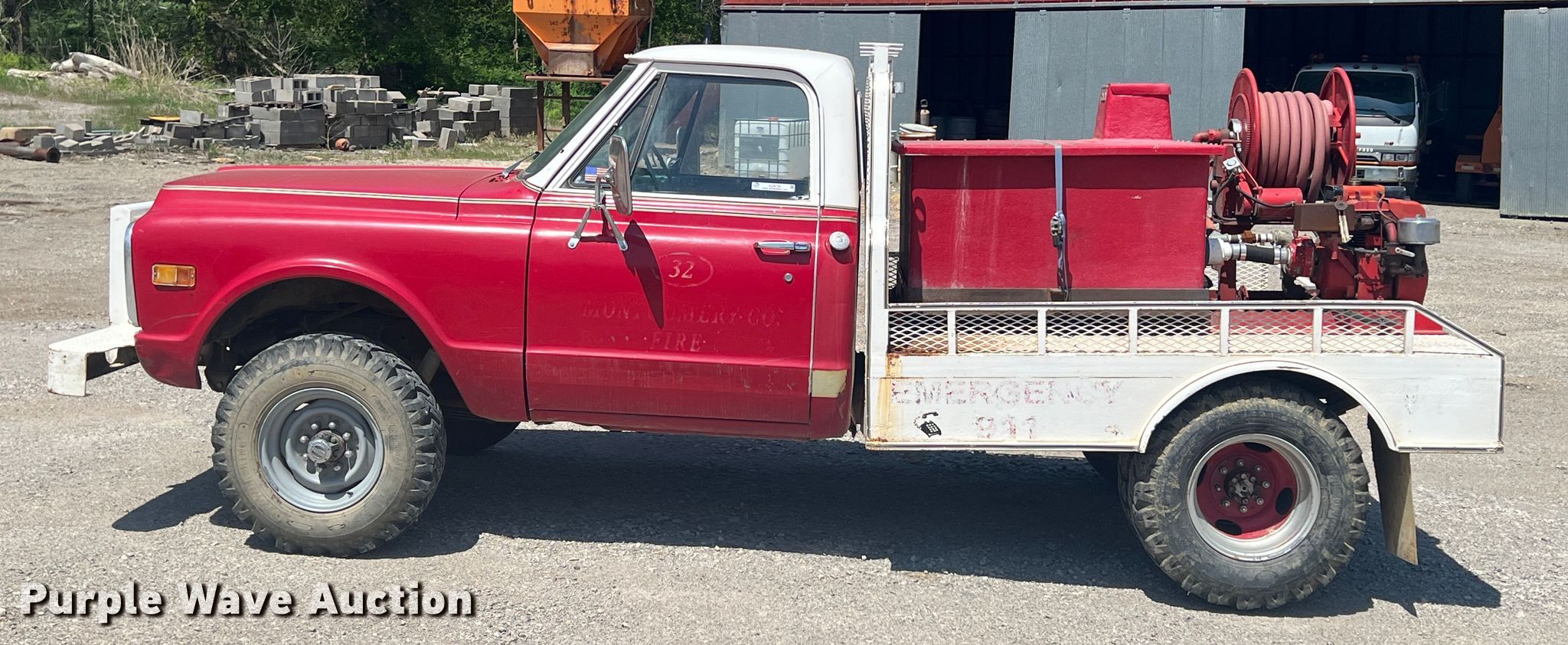 1972 Chevrolet K20 flatbed truck. Miles: 69,908 on odometer, VIN: CKE242F355723. Engine Cylinders: 8, Fuel type: Gas. Transmission Manual, Speed: 4, Four wheel drive. Interior Heat. Features Flatbed 7' L x 7' W, Water Pump Briggs & Stratton gas engine, 16 HP. Tires Size: 7.50-16. Notes. Kansas title. Montgomery County Rural Fire Dist. 1. Independence, KS 67301