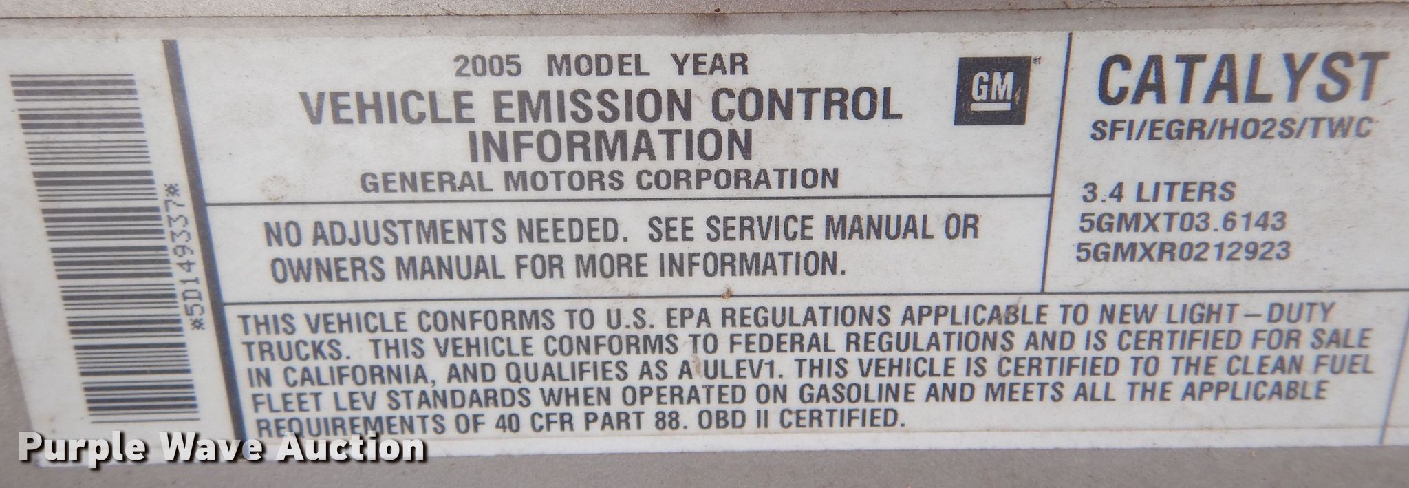 2005 Chevrolet Venture van. Miles: 100,025 on odometer, VIN: 1GNDV23E35D149337. Engine Displacement: 3.4L V6 OHV, Cylinders: 6, Fuel type: Gas. Transmission Automatic. Interior AC, Heat, Seat: Power driver, Power windows, Power locks, Cruise control. Tires Size: 215/70R15. Notes Non-operational driver's side power locks, Windshield chipped or cracked, Battery weak. Kansas title. Barber County Fire. Medicine Lodge, KS 67104
