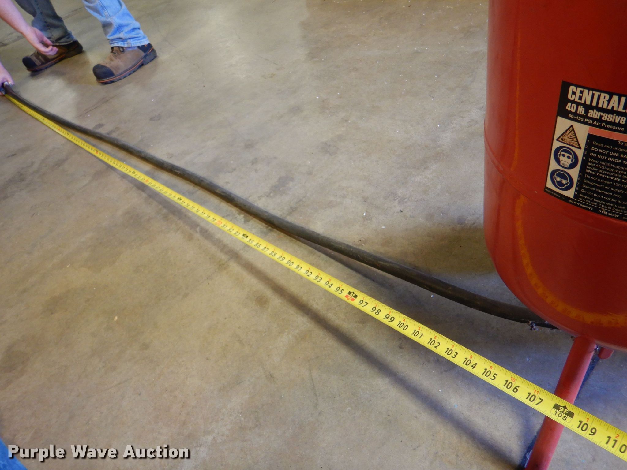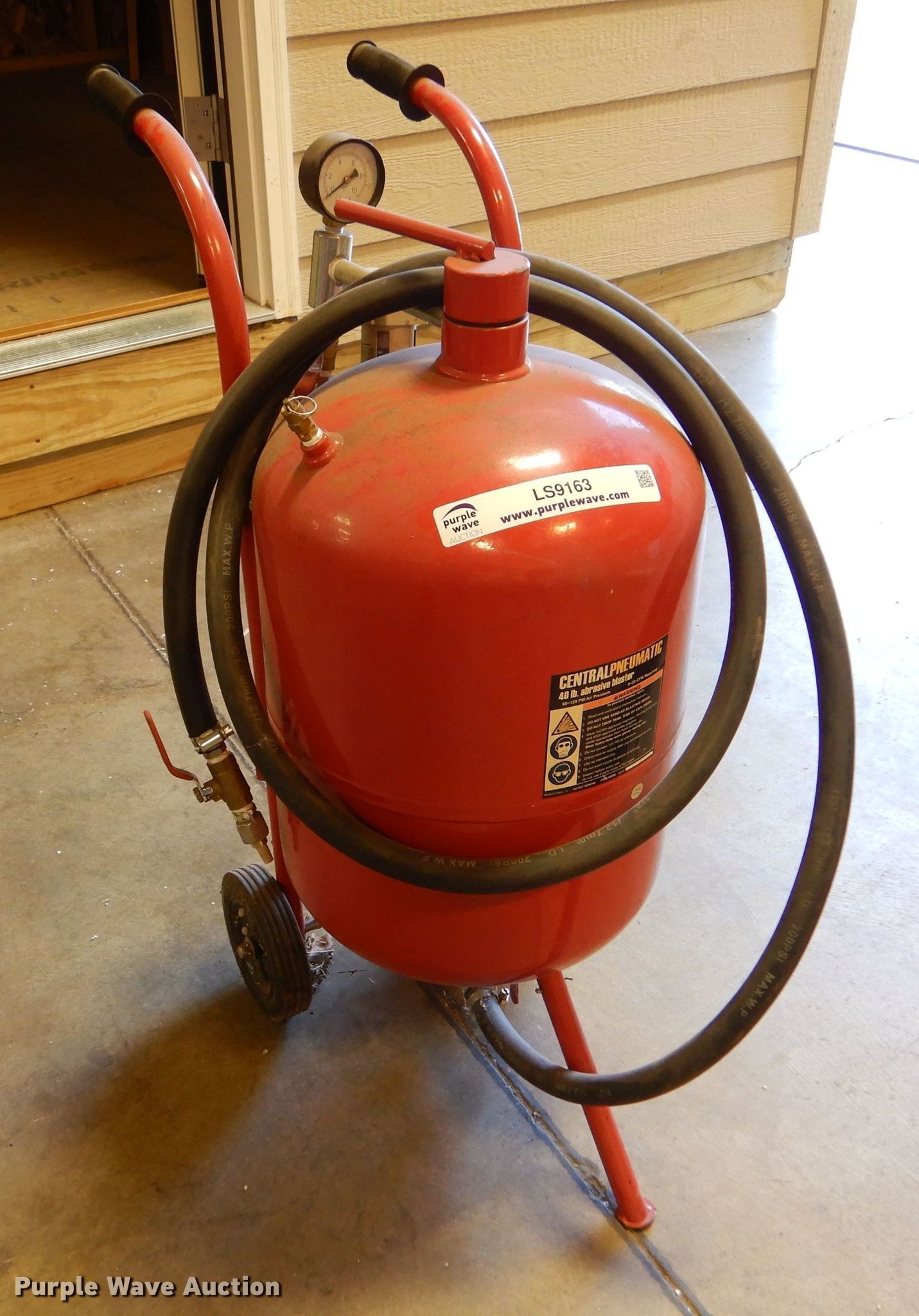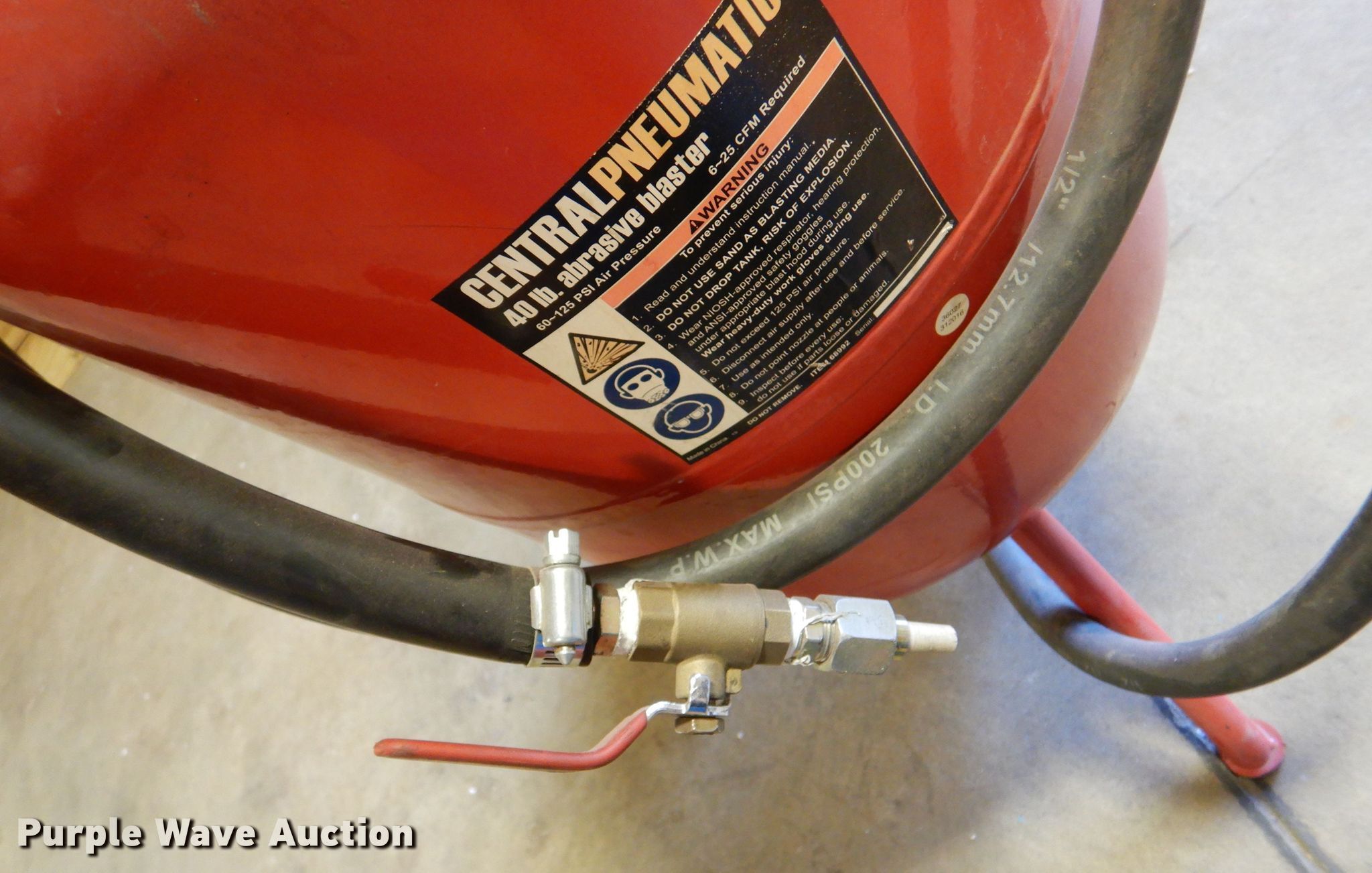 Purple Wave is selling a used Tools in Kansas. This item is a Central Pneumatic abrasive blaster with the following: 40 lbs capacity, 60 to 125 PSI, 6 to 25 CFM, 9' L hose