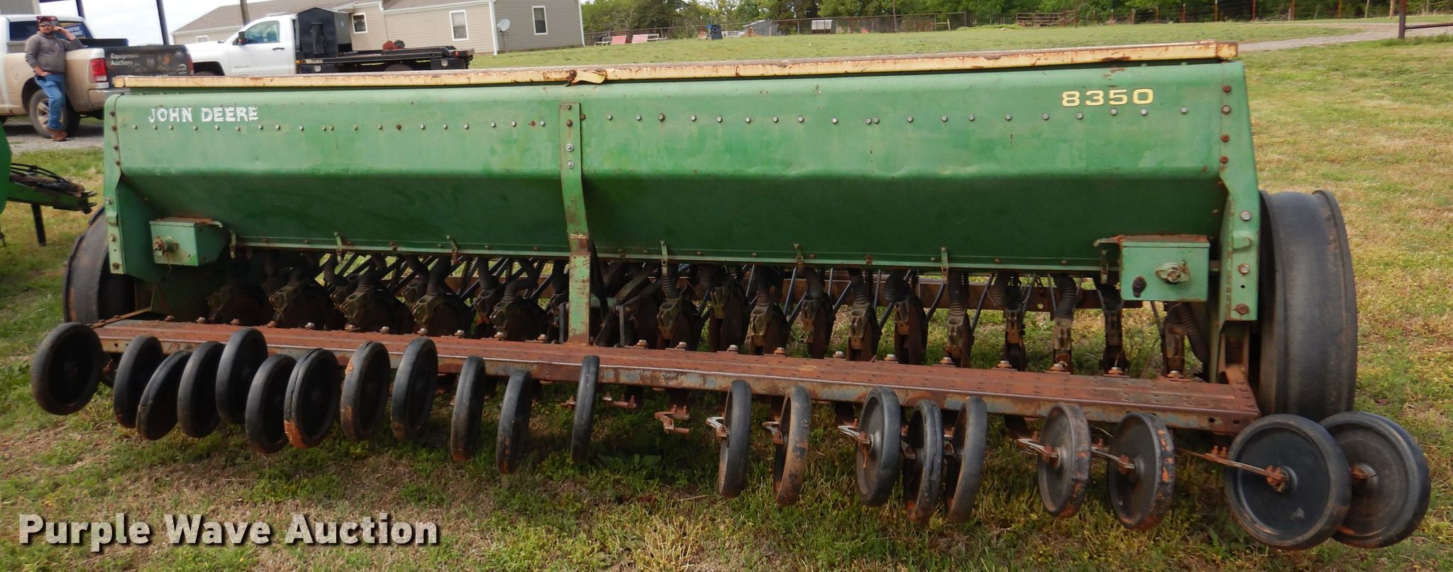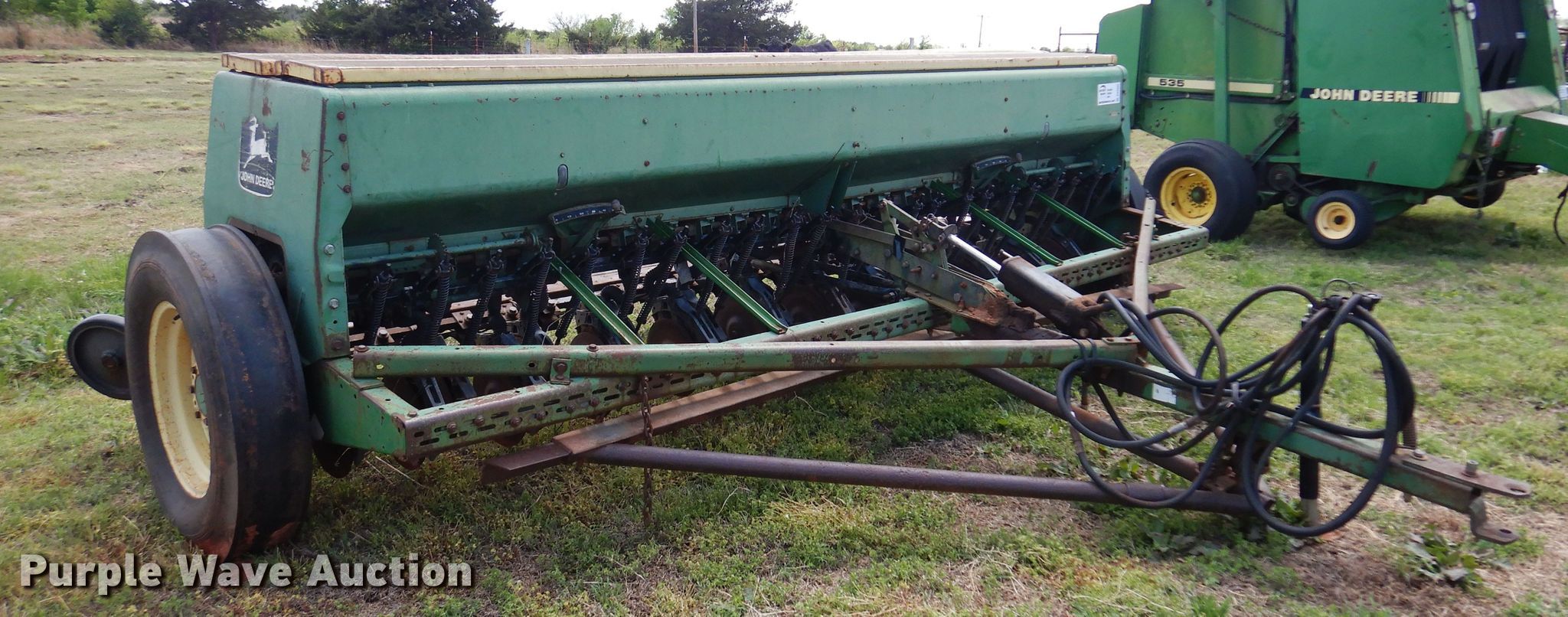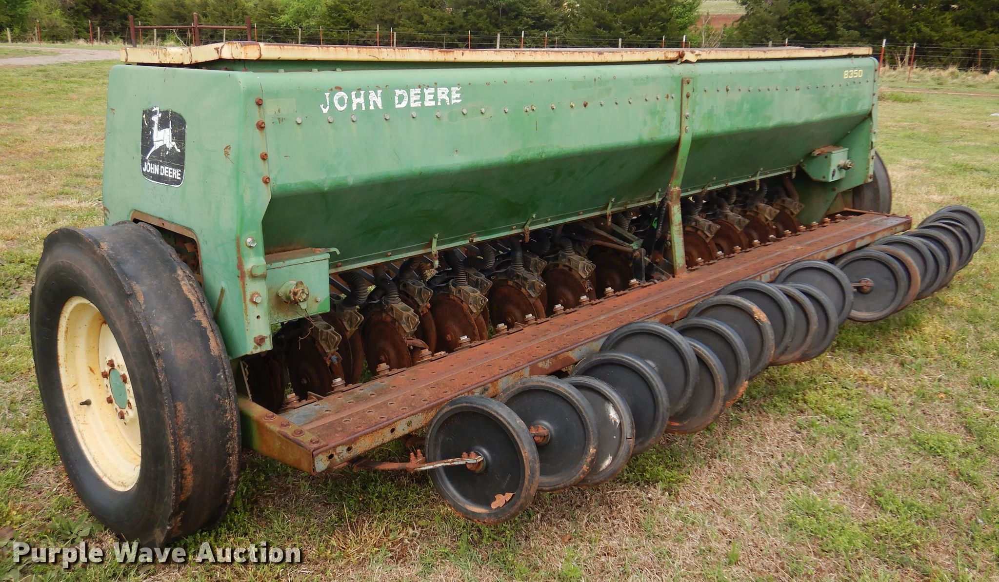 Purple Wave is selling a used Grain Drill or Seeder in Oklahoma. This item is a John Deere 8350 grain drill with the following: Width: 13', Row units: 23, Row spacing: 6", Serial: 051166N