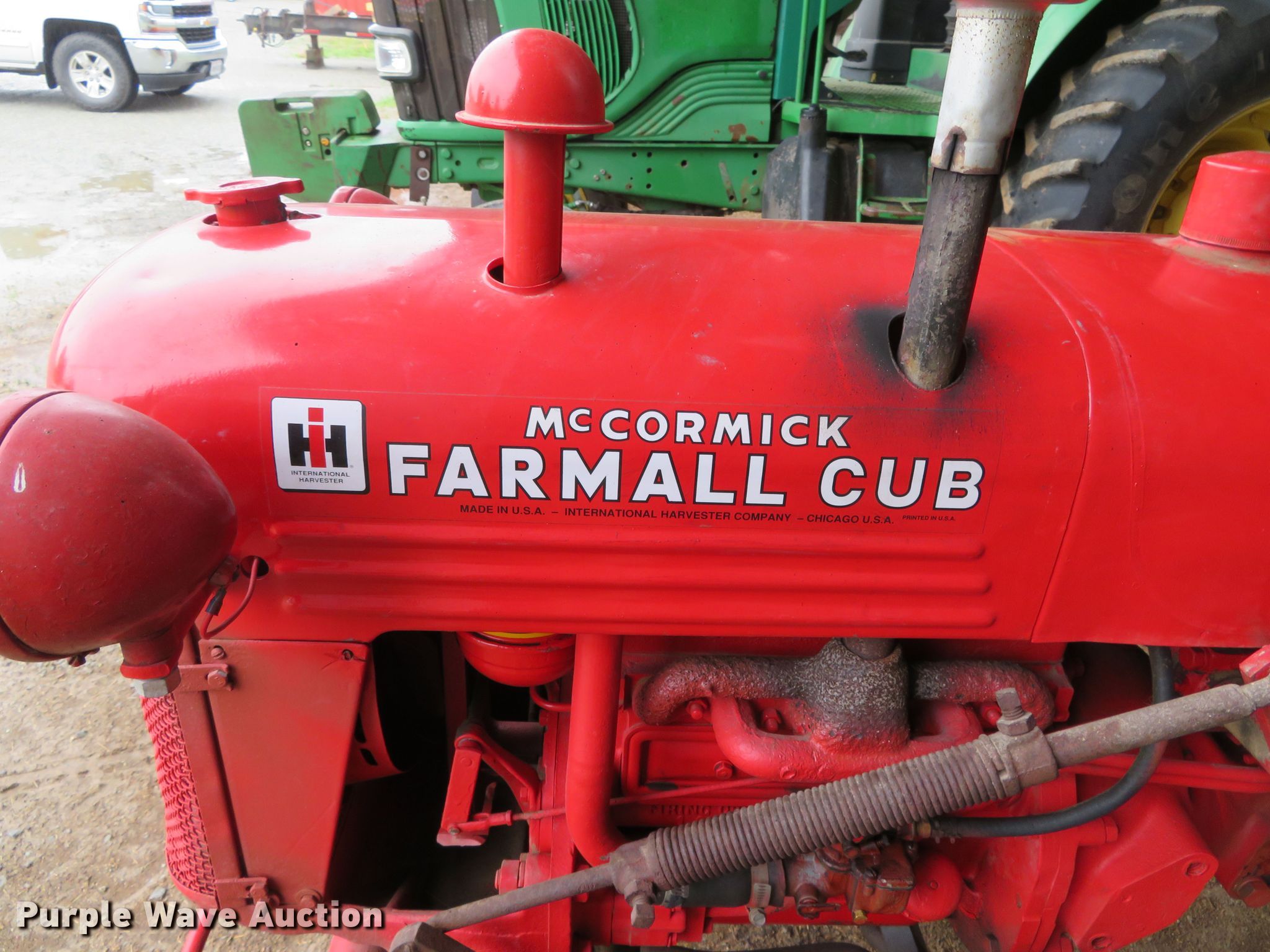International F-Cub tractor. Serial: 153748. Engine Farmall, Displacement: 1.0L, Cylinders: 4, Fuel type: Gas. Transmission Manual, 3F - 1R. Features PTO: 540, Cultivator Sweep width: 9", Rows: 1. Tires Front: 4.00-12, Rear: 8.3-24, Wheel weights: 2. 13320 Ausbury Chapel Rd. Bonne Terre, MO 63628