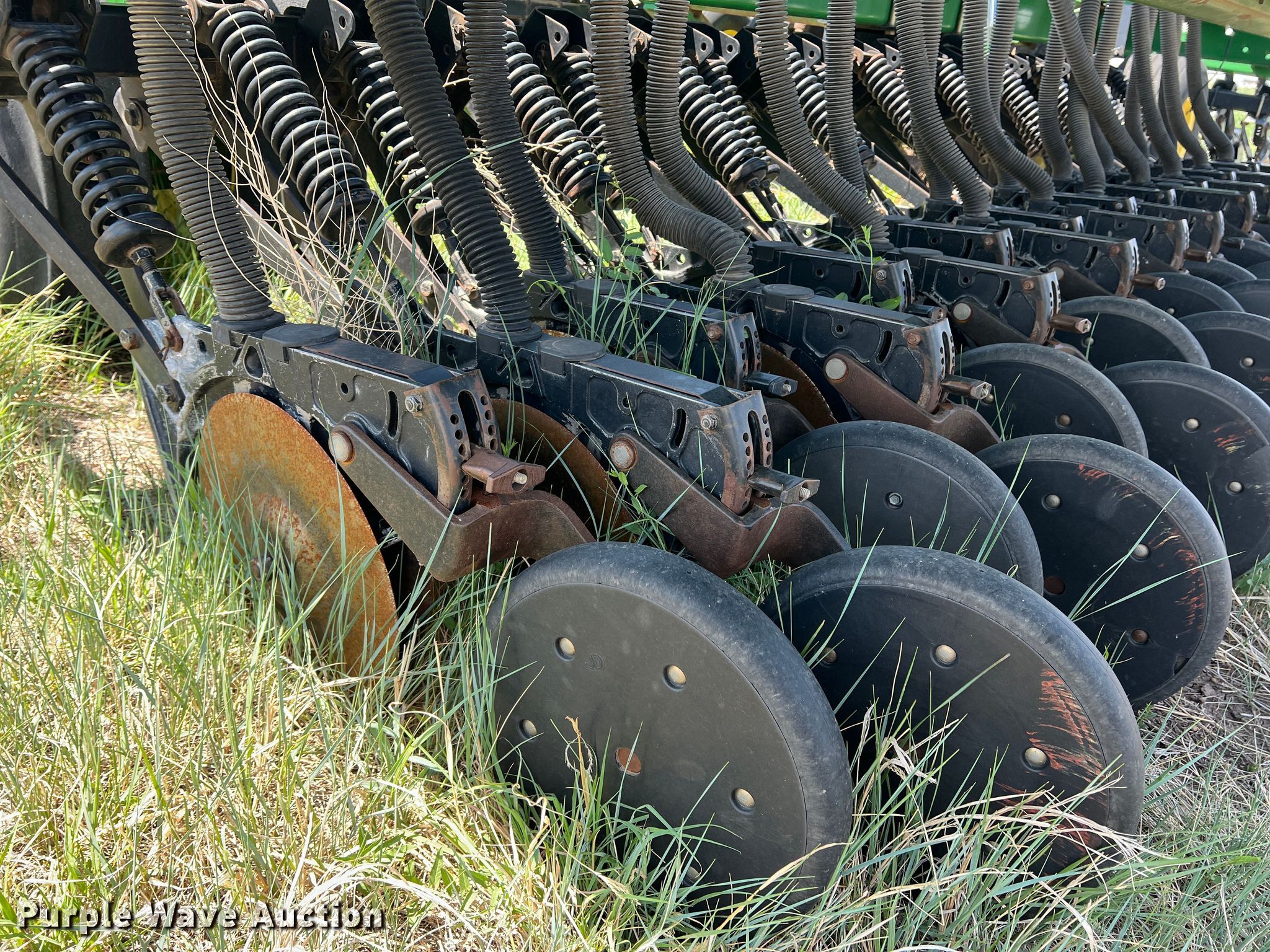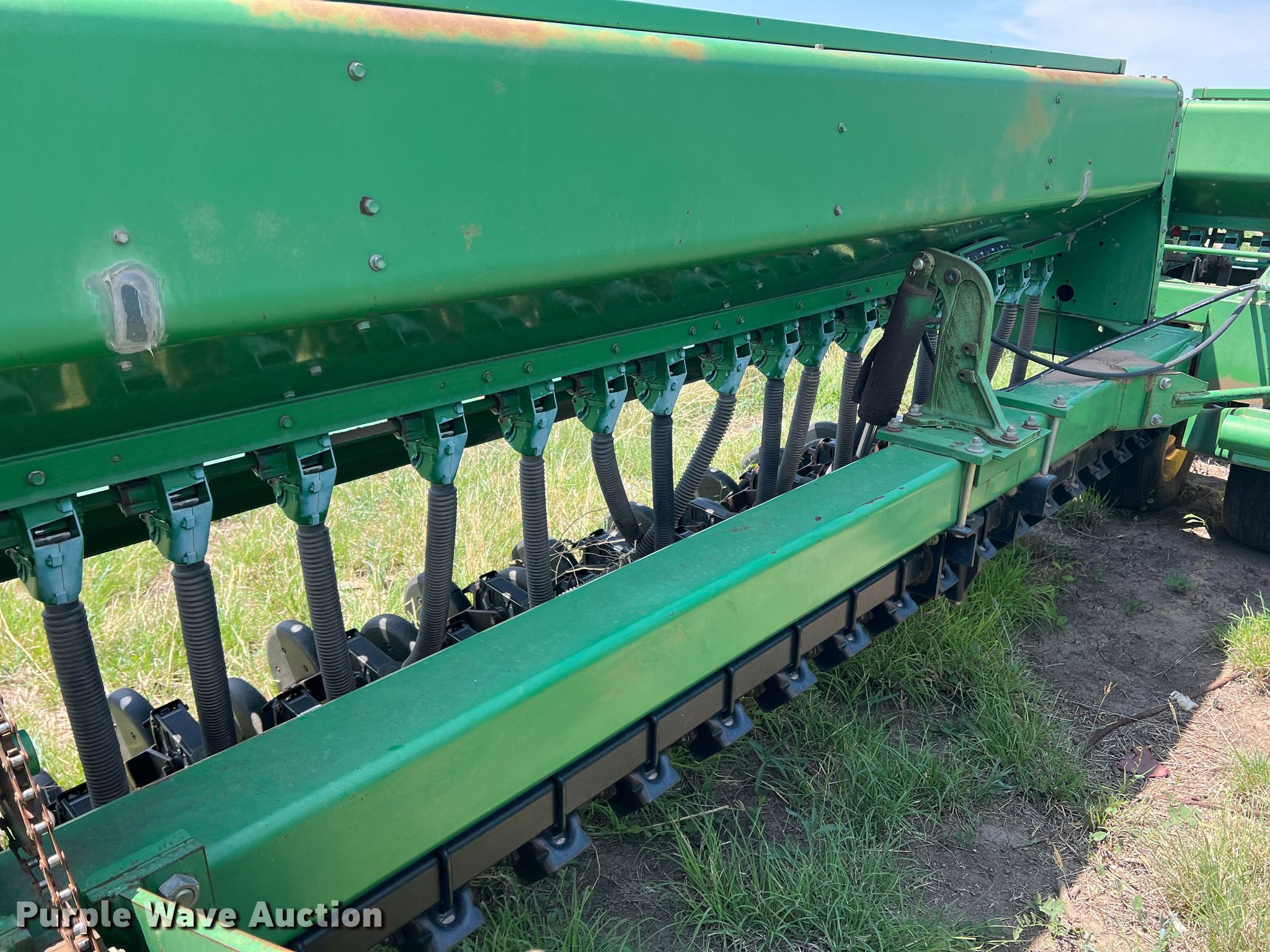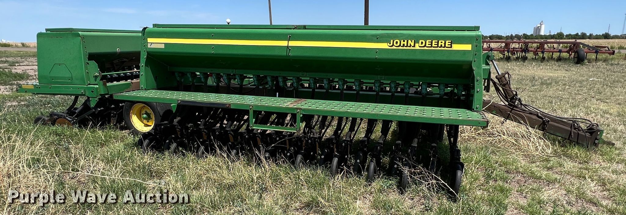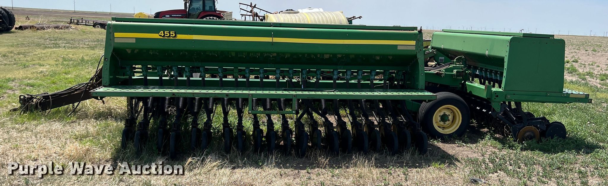 Purple Wave is selling a used Grain Drill or Seeder in Texas. This item is a John Deere 455 grain drill with the following: Width: 35', Row units: 56, Row spacing: 7", Serial: N00455H005112