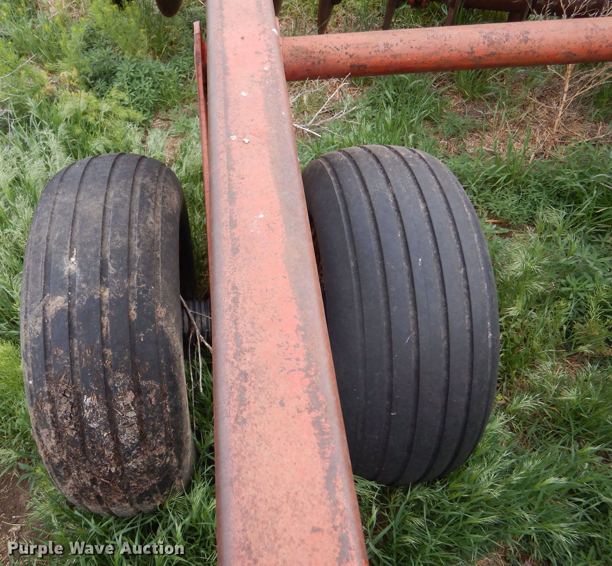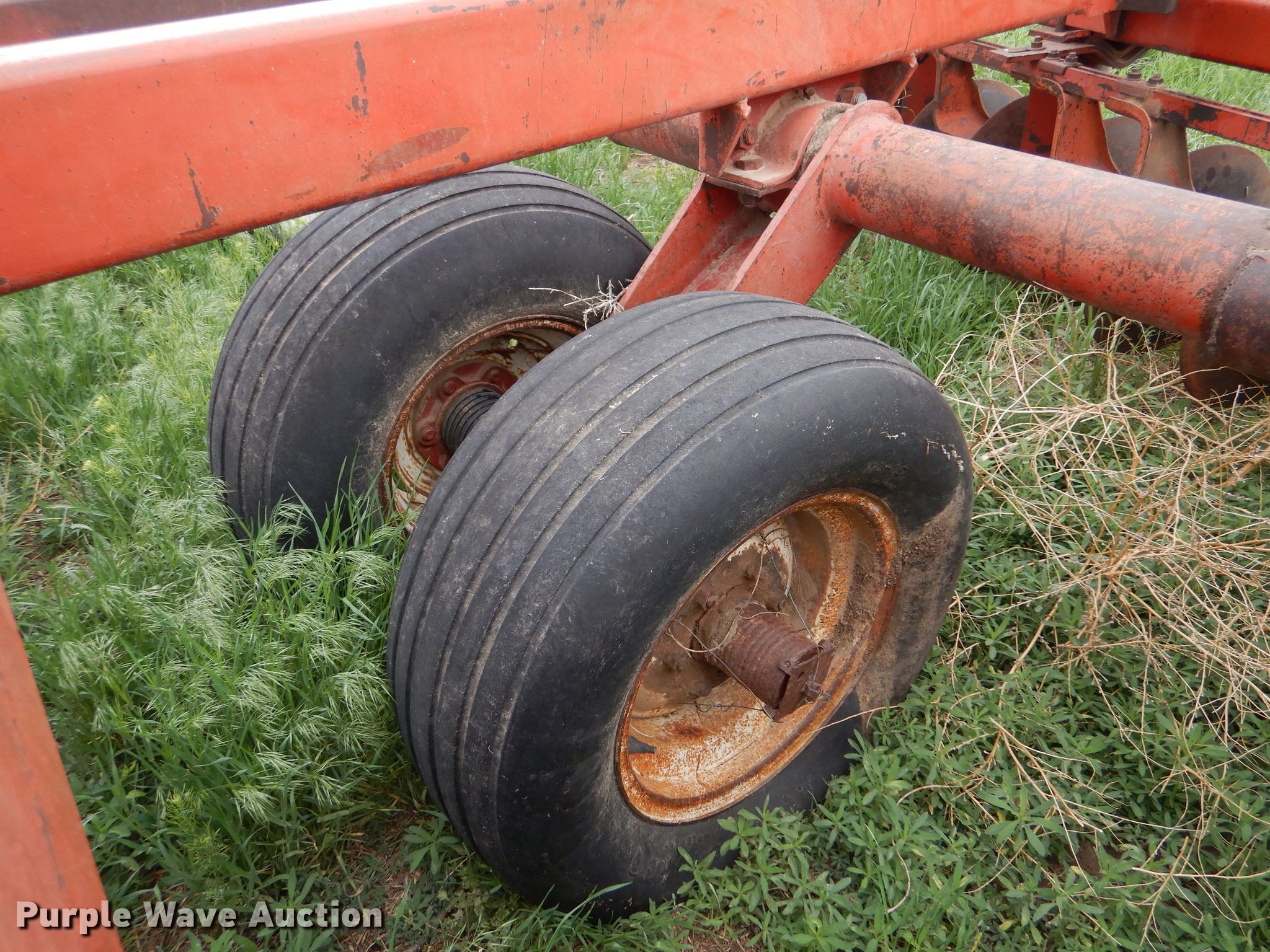 Bush Hog disk. Overall width: 28'. Features Front blades Diameter: 16", Spacing: 9", Rear blades Diameter: 18", Spacing: 9", Disk scrapers, Operation Hydraulic lift, Hydraulic fold, Leveler: Manual, Walking tandem axle. Tires Tire size: 11L-15. Notes Flat tires. Offerle, KS 67563