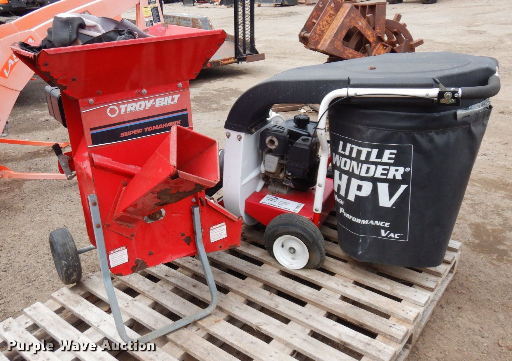 Troy-Bilt Super Tomahawk wood chipper. Briggs & Stratton gas engine, Unknown operating condition, Little Wonder HPV leaf vacuum Vanguard gas engine. Lano Equipment, Inc.. 3021 133rd St W. Shakopee, MN 55379