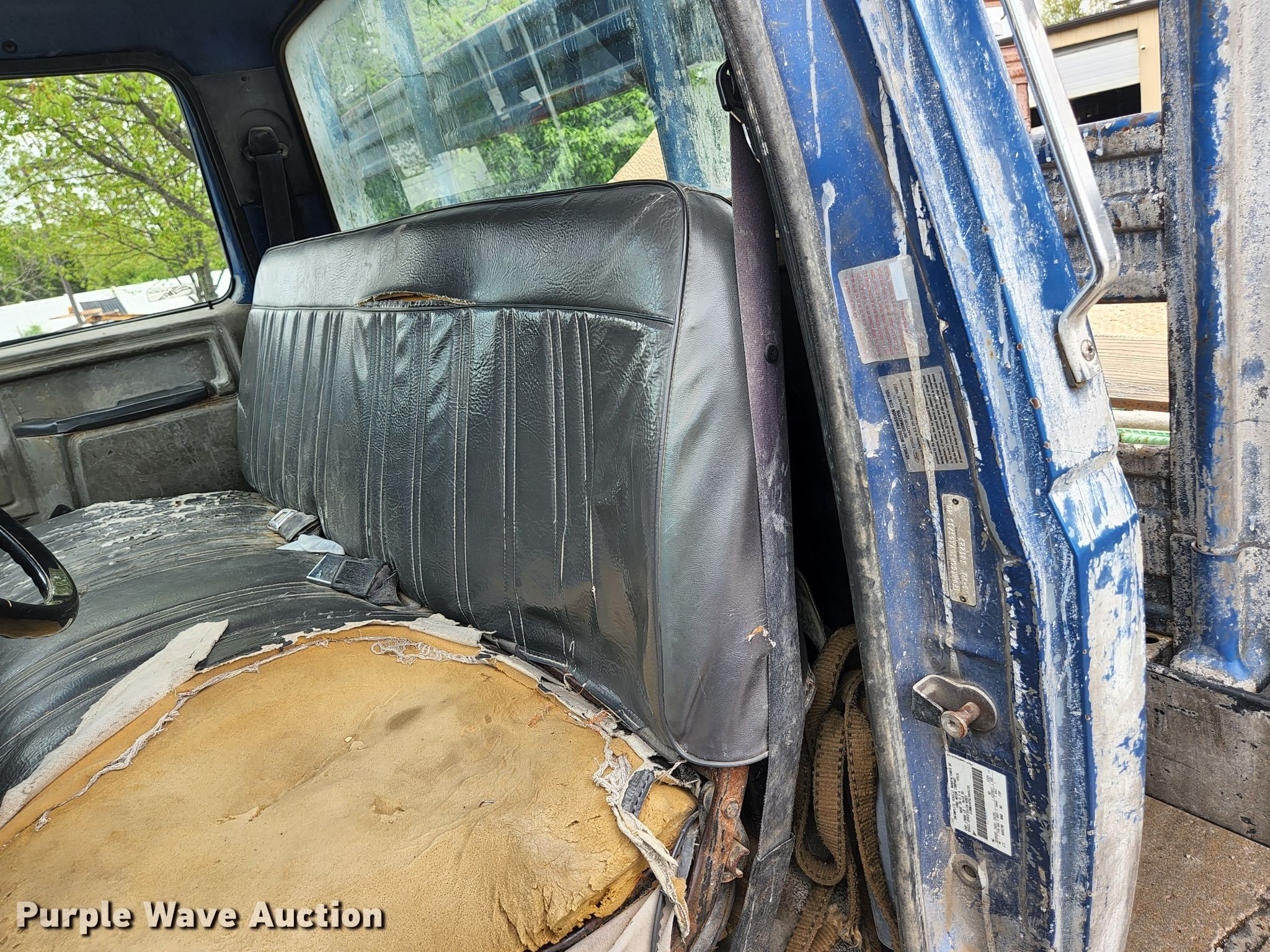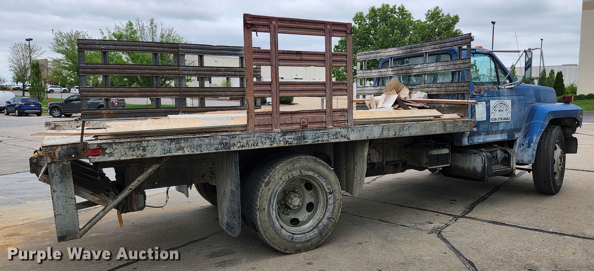 This 1990 Ford F600 flatbed truck will sell to the highest bidder regardless of price.