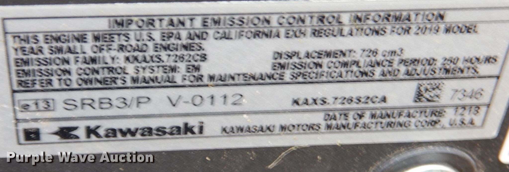 Hustler Raptor SDX ZTR lawn mower. Hours: 99 on meter, Cutting width: 54", Serial: 19017791. Engine Kawasaki FR691V, Serial: FR691VG89821, Displacement: 726 cc, Cylinders: 2, Fuel type: Gas. Transmission Hydrostatic. Chassis PTO. Tires Front: 13x6.5-6, Rear: 22x11-10NHS. Cannon Sales & Service. 1004 W South St. Mount Ayr, IA 50854