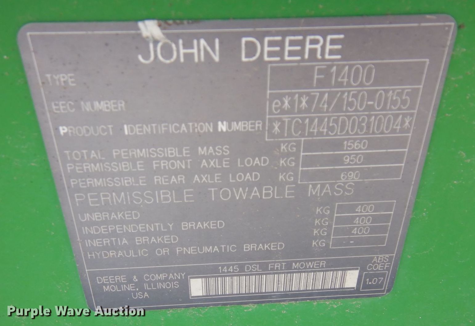 Purple Wave is selling a used Commercial Turf Mower in Minnesota. This item is a John Deere 1445 lawn mower with the following: Hours: Unknown, Cutting width: 60", Serial: TC1445D031004