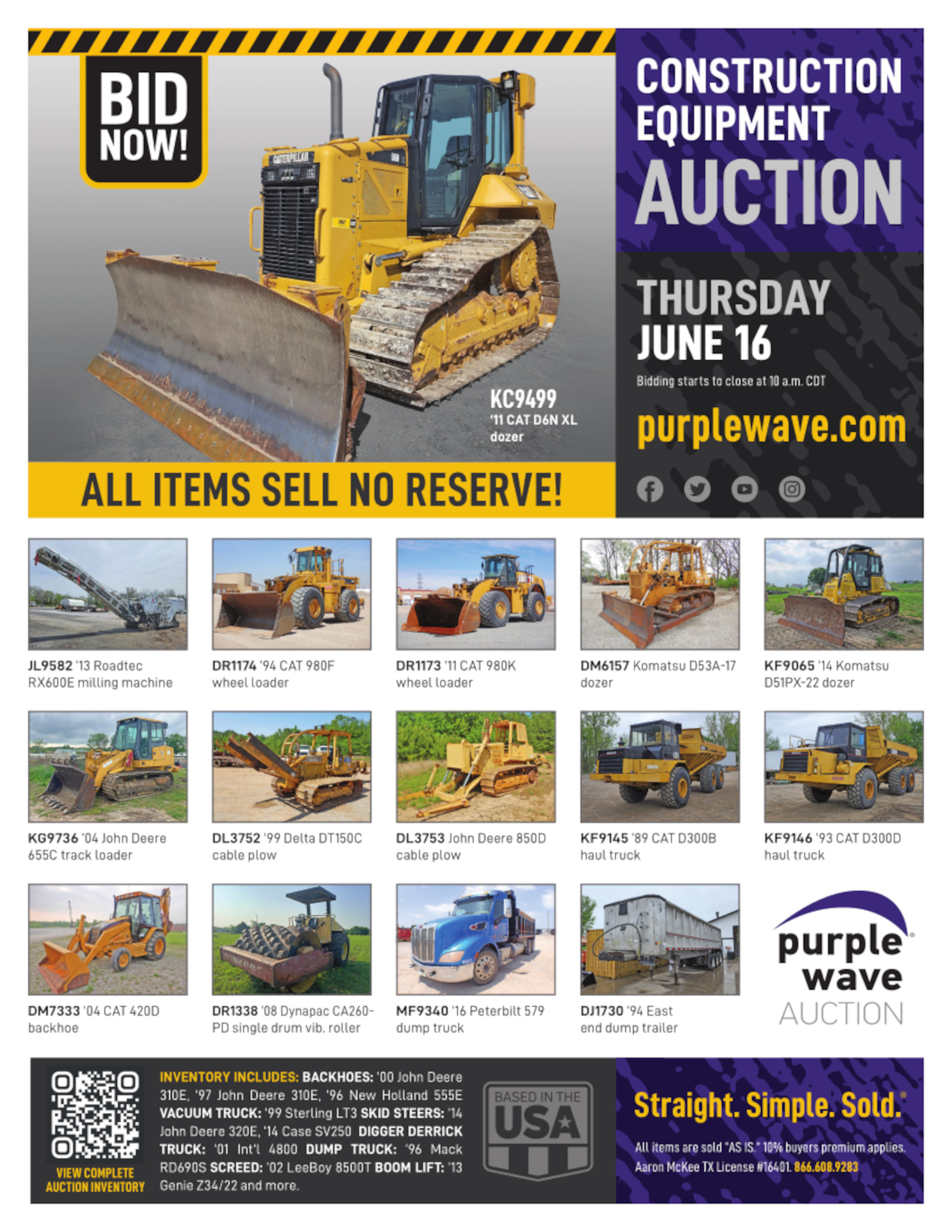 This auction is conducted by Purple Wave, Inc., whose home office is 825 Levee Drive, Manhattan, Kansas. Aaron McKee, Texas auctioneer license # 16401, operates Purple Wave, Inc. Complaints against us may be directed to the Texas Department of Licensing and Regulation, P.O. Box 12157, Austin, Texas 78711, (512) 463-6599. For additional required information, see the attached document.